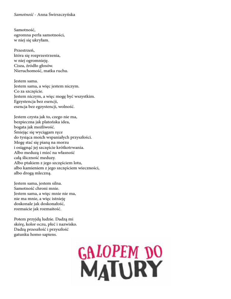 Samotność - Anna Świrszczyńska Samotność, ogromna perła samotności, w niej się ukryłam. Przestrzeń, która się rozprzestrzenia, w niej ogromnieję. Cisza, źródło głosów. Nieruchomość, matka ruchu. Jestem sama. Jestem sama, a więc jestem niczym. Co za szczęście. Jestem niczym, a więc mogę być wszystkim. Egzystencja bez esencji, esencja bez egzystencji, wolność. Jestem czysta jak to, czego nie ma, bezpieczna jak platońska idea, bogata jak możliwość. Śmiejąc się wyciągam ręce do tysiąca moich wspaniałych przyszłości. Mogę stać się pianą na morzu i osiągnąć jej szczęście krótkotrwania. Albo meduzą i mieć na własność całą śliczność meduzy. Albo ptakiem z jego szczęściem lotu, albo kamieniem z jego szczęściem wieczności, albo drogą mleczną. Jestem sama, jestem silna. Samotność chroni mnie. Jestem sama, a więc mnie nie ma, nie ma mnie, a więc istnieję doskonale jak doskonałość, rozmaicie jak rozmaitość. Potem przyjdą ludzie. Dadzą mi skórę, kolor oczu, płeć i nazwisko. Dadzą przeszłość i przyszłość gatunku homo sapiens.