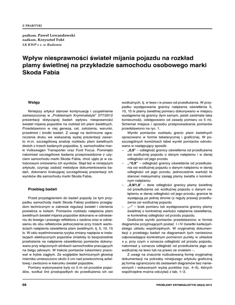 Z PRAKTYKI podkom. Paweł Lewandowski nadkom. Krzysztof Fokt LK KWP z s. w Radomiu Wpływ niesprawności świateł mijania pojazdu na rozkład plamy świetlnej na przykładzie samochodu osobowego marki Skoda Fabia Wstęp Niniejszy artykuł stanowi kontynuację i uzupełnienie zamieszczonej w „Problemach Kryminalistyki” 277/2012 prezentacji dotyczącej badań wpływu niesprawności świateł mijania pojazdów na rozkład ich plam świetlnych. Przedstawiono w niej genezę, cel, założenia, warunki, przedmiot i środki badań. Z uwagi na techniczne ograniczenia druku we wskazanej wyżej prezentacji zawarto m.in. szczegółową analizę rozkładu plam świetlnych dwóch z trzech badanych pojazdów, tj. samochodów marki Volkswagen Transporter oraz Ford Focus. Pominięto natomiast szczegółowe badania przeprowadzone z użyciem samochodu marki Skoda Fabia, choć ujęto je w całościowym omówieniu ich wyników. Stąd też w niniejszym artykule, czyniąc zadość metodyce dokumentowania badań, dokonano brakującej szczegółowej prezentacji ich wyników dla samochodu marki Skoda Fabia. Przebieg badań Przed przystąpieniem do badań pojazdy (w tym przypadku samochody marki Skoda Fabia) poddano przeglądom technicznym w zakresie regulacji świateł i ciśnienia powietrza w kołach. Pomiarów rozkładu natężenia plam świetlnych świateł mijania pojazdów dokonano w odniesieniu do lewego i prawego reflektora z osobna oraz w odniesieniu do obu reflektorów jednocześnie przy trzech wartościach natężenia oświetlenia plam świetlnych, tj. 5, 10, 15 lx. W celu wyeliminowania ryzyka zmiany napięcia w instalacjach elektrycznych pojazdów (miałoby to bezpośrednie przełożenie na natężenie oświetlenia) pomiarów dokonywano przy włączonych silnikach samochodów pracujących na biegu jałowym. W trakcie pomiarów luksomierz pracował w trybie ciągłym. Ze względów technicznych głowicę miernika umieszczono około 5 cm nad powierzchnią asfaltową i zwrócono w kierunku świateł pojazdów. Pomiary wykonywane były co 5 m od przodów pojazdów, wzdłuż linii prostopadłych do przedłużenia ich osi 68 wzdłużnych, tj. w lewo i w prawo od przedłużenia. W przypadku występowania granicy natężenia oświetlenia 5, 10, 15 lx plamy świetlnej pomiaru dokonywano w miejscu wystąpienia tej granicy (tym samym, jeżeli zaistniała taka konieczność, odstępowano od zasady pomiaru co 5 m). Schemat miejsca i sposobu przeprowadzania pomiarów przedstawiono na ryc. 1. Wyniki pomiarów rozkładu granic plam świetlnych opracowano w formie tabelarycznej i graficznej. W poszczególnych komórkach tabel wyniki pomiarów odnotowano w następujący sposób: – „0,9” – odległość granicy oświetlenia od przedłużenia osi wzdłużnej pojazdu o danym natężeniu i w danej odległości od jego przodu – „^0,9” – odległość granicy oświetlenia od przedłużenia osi wzdłużnej pojazdu o danym natężeniu w danej odległości od jego przodu; jednocześnie wartość ta stanowi maksymalny zasięg plamy światła o konkretnym natężeniu – „0,9/1,8” – dwie odległości granicy plamy świetlnej od przedłużenia osi wzdłużnej pojazdu o danym natężeniu w danej odległości od jego przodu; granice te występują po jednej stronie (z reguły prawej) przedłużenia osi wzdłużnej pojazdu – „–” – brak pomiaru lub występowania granicy plamy świetlnej o konkretnej wartości natężenia oświetlenia, w konkretnej odległości od przodu pojazdu. Graficznie wyniki pomiarów przedstawiono w formie diagramów przyjmujących postać I i IV ćwiartki kartezjańskiego układu współrzędnych. W oryginalnej dokumentacji z przebiegu badań na diagramach tych naniesiono odpowiadające konkretnym pomiarom punkty w układzie x y, przy czym x oznacza odległość od przodu pojazdu, natomiast y oznacza odległość od przedłużenia jego osi wzdłużnej na lewo lub na prawo ze znakiem –. Z uwagi na znacznie rozbudowaną formę oryginalnej dokumentacji na potrzeby niniejszego artykułu graficzną jej formę ograniczono do zestawień diagramów bez naniesionych i wskazanych wyżej punktów (ryc. 4–5), których współrzędne można odczytać z tab. 1–3. PROBLEMY KRYMINALISTYKI 282(4) 2013 Z PRAKTYKI Ryc. 1. Schemat miejsca i sposobu przeprowadzania pomiarów Fig. 1. Location and manner of measurement taking Źródło (ryc. 1–6): autorzy Badania świateł mijana samochodu marki Skoda Fabia Ryc. 2. Charakterystyka techniczna samochodu marki Skoda Fabia Fig. 2. Technical parameters of Skoda Fabia Ryc. 3. Rozkład plam świetlnych samochodu marki Skoda Fabia – ujęcie z góry i z tyłu pojazdu (od lewej: lewego reflektora, prawego reflektora i dwóch reflektorów) Fig. 3. Distribution of light patches generated by Skoda Fabia – photographs taken from the top and rear of the vehicle (from left to right: left reflector, right reflector, both reflectors) PROBLEMY KRYMINALISTYKI 282(4) 2013 69 Ryc. 4. Rozkład granic plam świetlnych o natężeniu 5, 10, 15 lx świateł mijania samochodu marki Skoda Fabia w zależności od świecącego reflektora (od góry: lewy reflektor, prawy reflektor, dwa reflektory) Fig. 4. Distribution of light patch limits (5, 10, 15 lx intensity) of Skoda Fabia dipped headlights depending on the reflector (from top: left reflector, right reflector, both reflectors) Z PRAKTYKI 70 PROBLEMY KRYMINALISTYKI 282(4) 2013 Ryc. 5. Rozkład granic plam świetlnych świateł mijania lewego, prawego i dwóch reflektorów samochodu marki Skoda Fabia w zależności od natężenia oświetlenia (od góry: plama świetlna 5 lx, plama świetlna 10 lx, plama świetlna 15 lx) Fig. 5. Distribution of light patch limits of left, right and both Skoda Fabia reflectors depending on light intensity (from top: 5, 10, 15 lx) Z PRAKTYKI PROBLEMY KRYMINALISTYKI 282(4) 2013 71 Z PRAKTYKI Tabela 1 Wyniki pomiarów rozkładu granic plam świetlnych o natężeniu 5, 10, 15 lx świate