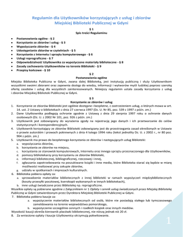 Regulamin dla Użytkowników korzystających z usług i zbiorów Miejskiej Biblioteki Publicznej w Gdyni §1 Spis treści Regulaminu Postanowienia ogólne - § 2 Korzystanie ze zbiorów i usług - § 3 Wypożyczanie zbiorów - § 4 Udostępnianie zbiorów w czytelniach - § 5 Korzystanie z Internetu i sprzętu komputerowego - § 6 Usługi reprograficzne - § 7 Odpowiedzialność Użytkownika za wypożyczone materiały biblioteczne - § 8 Zasady zachowania Użytkowników na terenie Biblioteki - § 9 Przepisy końcowe - § 10 §2 Postanowienia ogólne Miejska Biblioteka Publiczna w Gdyni, zwana dalej Biblioteką, jest instytucją publiczną i służy Użytkownikom wszystkimi swoimi zbiorami oraz zapewnia dostęp do wiedzy, informacji i wytworów myśli ludzkiej poprzez szeroką ofertę zasobów i usług dla wszystkich zainteresowanych. Niniejszy regulamin ustala zasady korzystania z usług i zbiorów Miejskiej Biblioteki Publicznej w Gdyni. §3 Korzystanie ze zbiorów i usług 1. Korzystanie ze zbiorów Biblioteki jest ogólnie dostępne i bezpłatne, z zastrzeżeniem usług, o których mowa w art. 14. ust. 2 Ustawy o bibliotekach z dnia 27 czerwca 1997 (Dz. U. Nr 85, poz. 539 z 1997 z późn. zm.) 2. Dane Użytkownika podlegają ochronie zgodnie z Ustawą z dnia 29 sierpnia 1997 roku o ochronie danych osobowych (Dz. U. z 2002 Nr 101, poz. 926 z późn. zm.) 3. Użytkownik jest zobowiązany do wyrażenia zgody na rejestrację jego danych i ich przetwarzanie do celów statystycznych i korespondencyjnych. 4. Użytkownik korzystający ze zbiorów Biblioteki zobowiązany jest do przestrzegania zasad określonych w Ustawie o prawie autorskim i prawach pokrewnych z dnia 4 lutego 1994 roku (tekst jednolity Dz. U. z 2002 r., nr 80 poz. 904 z późn. zm.) 5. Użytkownik ma prawo do bezpłatnego korzystania ze zbiorów i następujących usług Biblioteki: a. wypożyczania zbiorów, b. korzystania ze zbiorów na miejscu, c. korzystania ze stanowisk komputerowych, Internetu oraz innego sprzętu przeznaczonego dla Użytkowników, d. pomocy bibliotekarzy przy korzystaniu ze zbiorów Biblioteki, e. informacji bibliotecznej, bibliograficznej, rzeczowej i innej, f. zgłaszania zapotrzebowania na poszukiwane książki i inne media, które Biblioteka starać się będzie w miarę możliwości realizować przy zakupie zbiorów, g. udziału w spotkaniach i imprezach kulturalnych. 6. Biblioteka pobiera opłaty za: a. sprowadzenie materiałów bibliotecznych z innej biblioteki w ramach wypożyczeń międzybibliotecznych (koszty przesyłki pocztowej, kserokopii wykonanych w innych bibliotekach), b. inne usługi świadczone przez Bibliotekę np. reprograficzne. Wszelkie opłaty są pobierane zgodnie z Załącznikiem nr 1 Opłaty i cennik usług świadczonych przez Miejską Bibliotekę Publiczną w Gdyni zatwierdzonym przez Dyrektora Miejskiej Biblioteki Publicznej w Gdyni. 7. Biblioteka pobiera kaucje za: a. wypożyczenie materiałów bibliotecznych od osób, które nie posiadają stałego lub tymczasowego zameldowania na terenie województwa pomorskiego, b. wypożyczenie szczególnie cennych i rzadkich książek oraz innych mediów. Wysokość kaucji określa kierownik placówki bibliotecznej, nie niższą jednak niż 20 zł. 8. Za wniesione opłaty i kaucje Użytkownicy otrzymują pokwitowanie. 1 9. Wpłacona przez Użytkownika kaucja jest przejmowana na przychody własne Biblioteki po upływie 2 lat od chwili, gdy Użytkownik zaprzestał korzystania z Biblioteki i nie odebrał kaucji. 1. 2. 3. 4. 5. 6. 7. 8. 9. 10. 11. 12. §4 Wypożyczanie zbiorów Warunkiem wypożyczania zbiorów poza Bibliotekę jest zapisanie się do Biblioteki, czyli: a. zapoznanie się z niniejszym Regulaminem, b. okazanie dowodu osobistego lub innego dokumentu z nr PESEL, aktualnym adresem zameldowania i zdjęciem, c. wypełnienie karty zapisu i zobowiązanie się własnoręcznym podpisem do przestrzegania Regulaminu. Niepełnoletniego Użytkownika do Biblioteki zapisuje rodzic lub opiekun prawny, który podpisuje za niego kartę zapisu jako osoba poręczająca. Użytkownik ma obowiązek poinformować Bibliotekę o zmianie nazwiska i miejsca zamieszkania. Użytkownik może wypożyczyć jednocześnie 4 materiały biblioteczne na zewnątrz z każdej filii Miejskiej Biblioteki Publicznej w Gdyni na okres nie dłuższy niż 30 dni, jednak łączna liczba wypożyczonych publikacji nie może przekraczać 12 sztuk w całej sieci filii Miejskiej Biblioteki Publicznej w Gdyni. Wydań wielotomowych nie wypożycza się w całości. Osoby z niepełnosprawnością wzroku mają prawo do korzystania z książek dźwiękowych w pierwszej kolejności. Na prośbę Użytkownika jest możliwe przedłużenie terminu zwrotu wypożyczonych zbiorów. Prolongaty można dokonać dwukrotnie (maksymalnie po 30 dni) w Bibliotece, w której wypożyczono materiały biblioteczne – osobiście, telefonicznie lub drogą elektroniczną, najpóźniej w dniu upływu terminu zwrotu książki. Prolongata nie jest udzielana: a. gdy Użytkownik nie zwrócił w terminie innych wypożyczonych materiałów bibliotecznych, b. gdy Użytkownik ma nieuregulowane inne zobowiązania wobec Biblioteki, c. w przypadku dużego zapotrzebowania na dany materiał biblioteczny. Użytkownik może dokonać rezerwacji materiałów bibliotecznych, a zarezerwowane materiały powinien odebrać najpóźniej w ciągu 3 dni, w przeciwnym czasie zostaną one udostępnione innemu użytkownikowi. Termin zwrotu wypożyczanych materiałów bibliotecznych wypadający na dzień zamknięcia Biblioteki jest automatycznie przesuwany na pierwszy dzień jej otwarcia przypadający po tym terminie. Użytkownik przetrzymujący wypożyczone materiały biblioteczne ponad termin ustalony w Regulaminie zobowiązany jest do uiszczenia opłat wymienionych w Załączniku nr 1 Opłaty i cennik usług świadczonych przez Miejską Bibliotekę Publiczną w Gdyni. Do czasu ich zwrotu i uregulowania zobowiązań finansowych wobec