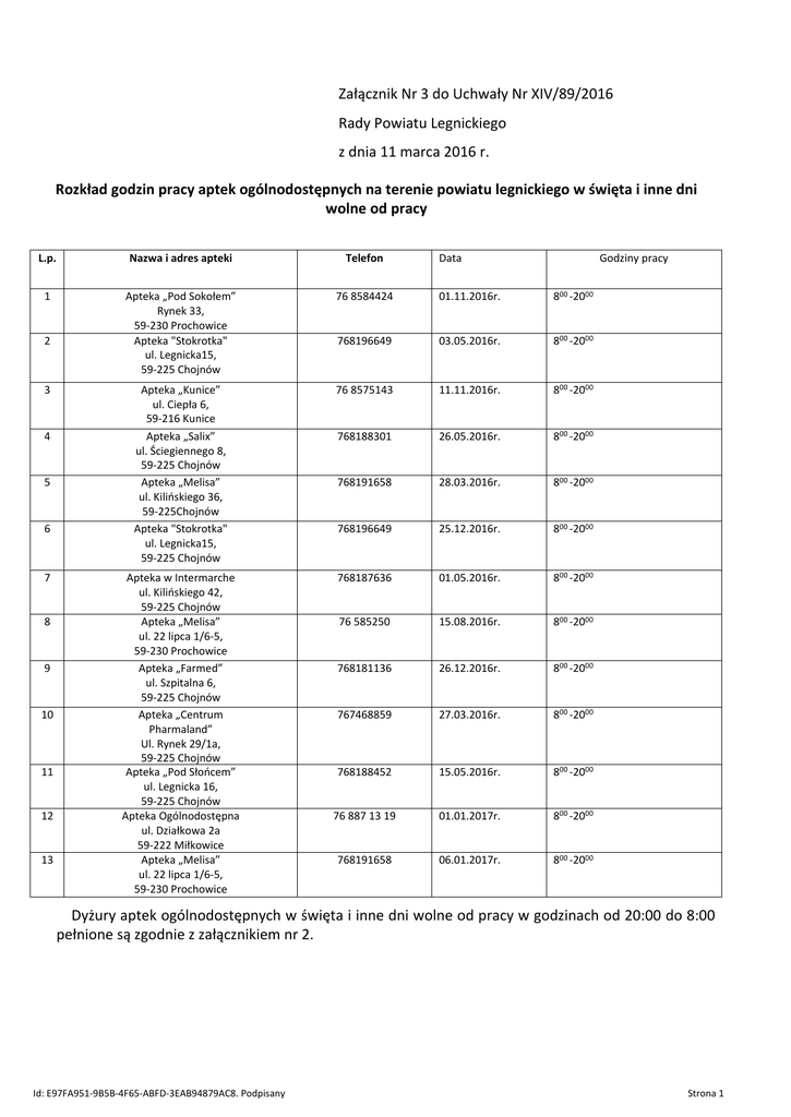 Załącznik Nr 3 do Uchwały Nr XIV/89/2016 Rady Powiatu Legnickiego z dnia 11 marca 2016 r. Rozkład godzin pracy aptek ogólnodostępnych na terenie powiatu legnickiego w święta i inne dni wolne od pracy L.p. Nazwa i adres apteki Telefon 1 Apteka „Pod Sokołem” Rynek 33, 59-230 Prochowice Apteka "Stokrotka" ul. Legnicka15, 59-225 Chojnów 76 8584424 01.11.2016r. 800 -2000 768196649 03.05.2016r. 800 -2000 Apteka „Kunice” ul. Ciepła 6, 59-216 Kunice Apteka „Salix” ul. Ściegiennego 8, 59-225 Chojnów Apteka „Melisa” ul. Kilińskiego 36, 59-225Chojnów Apteka "Stokrotka" ul. Legnicka15, 59-225 Chojnów 76 8575143 11.11.2016r. 800 -2000 768188301 26.05.2016r. 800 -2000 768191658 28.03.2016r. 800 -2000 768196649 25.12.2016r. 800 -2000 Apteka w Intermarche ul. Kilińskiego 42, 59-225 Chojnów Apteka „Melisa” ul. 22 lipca 1/6-5, 59-230 Prochowice Apteka „Farmed” ul. Szpitalna 6, 59-225 Chojnów Apteka „Centrum Pharmaland” Ul. Rynek 29/1a, 59-225 Chojnów Apteka „Pod Słońcem” ul. Legnicka 16, 59-225 Chojnów Apteka Ogólnodostępna ul. Działkowa 2a 59-222 Miłkowice Apteka „Melisa” ul. 22 lipca 1/6-5, 59-230 Prochowice 768187636 01.05.2016r. 800 -2000 76 585250 15.08.2016r. 800 -2000 768181136 26.12.2016r. 800 -2000 767468859 27.03.2016r. 800 -2000 768188452 15.05.2016r. 800 -2000 76 887 13 19 01.01.2017r. 800 -2000 768191658 06.01.2017r. 800 -2000 2 3 4 5 6 7 8 9 10 11 12 13 Data Godziny pracy Dyżury aptek ogólnodostępnych w święta i inne dni wolne od pracy w godzinach od 20:00 do 8:00 pełnione są zgodnie z załącznikiem nr 2. Id: E97FA951-9B5B-4F65-ABFD-3EAB94879AC8. Podpisany Strona 1 Uzasadnienie Przedkładana uchwała Rady Powiatu Legnickiego w sprawie określenia rozkładu godzin pracy aptek ogólnodostępnych na terenie powiatu legnickiego jest wykonaniem art. 94 ust. 2 ustawy z dnia 6 września 2001 r. Prawo farmaceutyczne (j.t. Dz. U. z 2008 r. Nr 45, poz. 271 z późn. zm.), który stanowi, że rozkład godzin pracy aptek ogólnodostępnych na danym terenie określa, w drodze uchwały, rada powiatu, po zasięgnięciu opinii wójtów, burmistrzów gmin z terenu powiatu i samorządu aptekarskiego. Zgodnie z art. 94 ust. 1 ww. ustawy rozkład godzin pracy aptek ogólnodostępnych powinien być dostosowany do potrzeb ludności i zapewniać dostępność świadczeń również w porze nocnej, w niedzielę, święta i inne dni wolne od pracy. Podjęcie niniejszej uchwały spowodowane jest dostosowaniem harmonogramu rozkładu godzin aptek ogólnodostępnych na terenie powiatu legnickiego z powodu zamknięcia działalności gospodarczej przez aptekę „Miłek” w Miłkowicach. Id: E97FA951-9B5B-4F65-ABFD-3EAB94879AC8. Podpisany Strona 1