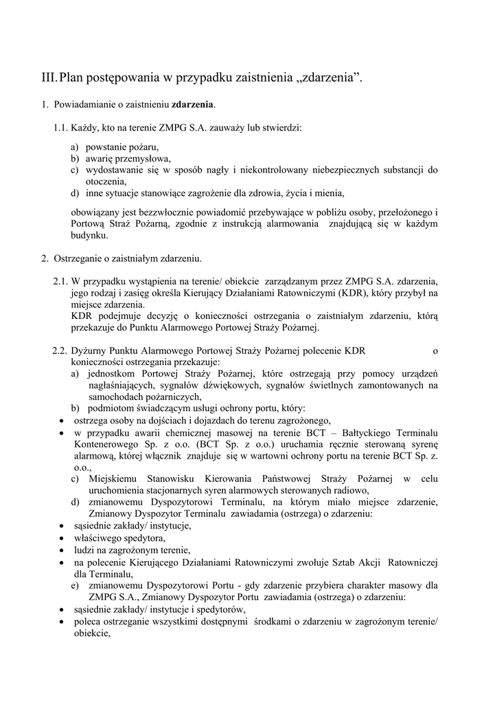 III. Plan postępowania w przypadku zaistnienia „zdarzenia”. 1. Powiadamianie o zaistnieniu zdarzenia. 1.1. Każdy, kto na terenie ZMPG S.A. zauważy lub stwierdzi: a) powstanie pożaru, b) awarię przemysłowa, c) wydostawanie się w sposób nagły i niekontrolowany niebezpiecznych substancji do otoczenia, d) inne sytuacje stanowiące zagrożenie dla zdrowia, życia i mienia, obowiązany jest bezzwłocznie powiadomić przebywające w pobliżu osoby, przełożonego i Portową Straż Pożarną, zgodnie z instrukcją alarmowania znajdującą się w każdym budynku. 2. Ostrzeganie o zaistniałym zdarzeniu. 2.1. W przypadku wystąpienia na terenie/ obiekcie zarządzanym przez ZMPG S.A. zdarzenia, jego rodzaj i zasięg określa Kierujący Działaniami Ratowniczymi (KDR), który przybył na miejsce zdarzenia. KDR podejmuje decyzję o konieczności ostrzegania o zaistniałym zdarzeniu, którą przekazuje do Punktu Alarmowego Portowej Straży Pożarnej. 2.2. Dyżurny Punktu Alarmowego Portowej Straży Pożarnej polecenie KDR o konieczności ostrzegania przekazuje: a) jednostkom Portowej Straży Pożarnej, które ostrzegają przy pomocy urządzeń nagłaśniających, sygnałów dźwiękowych, sygnałów świetlnych zamontowanych na samochodach pożarniczych, b) podmiotom świadczącym usługi ochrony portu, który: • ostrzega osoby na dojściach i dojazdach do terenu zagrożonego, • w przypadku awarii chemicznej masowej na terenie BCT – Bałtyckiego Terminalu Kontenerowego Sp. z o.o. (BCT Sp. z o.o.) uruchamia ręcznie sterowaną syrenę alarmową, której włącznik znajduje się w wartowni ochrony portu na terenie BCT Sp. z. o.o., c) Miejskiemu Stanowisku Kierowania Państwowej Straży Pożarnej w celu uruchomienia stacjonarnych syren alarmowych sterowanych radiowo, d) zmianowemu Dyspozytorowi Terminalu, na którym miało miejsce zdarzenie, Zmianowy Dyspozytor Terminalu zawiadamia (ostrzega) o zdarzeniu: • sąsiednie zakłady/ instytucje, • właściwego spedytora, • ludzi na zagrożonym terenie, • na polecenie Kierującego Działaniami Ratowniczymi zwołuje Sztab Akcji Ratowniczej dla Terminalu, e) zmianowemu Dyspozytorowi Portu - gdy zdarzenie przybiera charakter masowy dla ZMPG S.A., Zmianowy Dyspozytor Portu zawiadamia (ostrzega) o zdarzeniu: • sąsiednie zakłady/ instytucje i spedytorów, • poleca ostrzeganie wszystkimi dostępnymi środkami o zdarzeniu w zagrożonym terenie/ obiekcie, f) oficerowi dyżurnemu Kapitanatu Portu, który zawiadamia (ostrzega) drogą radiową jednostki pływające w rejonie zagrożenia. Uwaga ! Polecenie Kierującego Działaniami Ratowniczymi (KDR), dotyczące włączenia syren stacjonarnych na terenie zagrożonym, dyżurny Punktu Alarmowego Portowej Straży Pożarnej przekazuje do Miejskiego Stanowiska Kierowania Państwowej Straży Pożarnej. Syreny stacjonarne są uruchamiane drogą radiową z Miejskiego Stanowiska Kierowania Państwowej Staży Pożarnej lub ręcznie w miejscu zainstalowania. 3. Sposoby ogłaszania alarmów i ostrzegania o zdarzeniu. 3.1. Ogłaszanie ALARMU przeprowadza się za pomocą dostępnych środków np.: a) b) c) d) syren alarmowych, stacjonarnych lub przenośnych, urządzeń nagłaśniających takich jak: tuby, buczki, głośniki samochodowe, poprzez głośne wołanie, komunikatów alarmowych ogłaszanych przez: urządzenia nagłaśniające, zainstalowane na samochodach straży pożarnej, policji lub innych służb ratowniczych, technicznych i porządkowych, radiowęzła zakładowego, telefonów, radia, telewizji, radiotelefonów i innych urządzeń alarmowych. 4. RODZAJE ALARMOWE ALARMÓW, TREŚĆ Lp. Rodzaj alarmu Sposób ogłaszania alarmów za pomocą syren 1). 2). 3). KOMUNIKATÓW przy pomocy rozgłośni radiowych, ośrodków TVP i radiofonii przewodowej Powtarzana trzykrotnie Dźwięk ciągły Alarm o zapowiedź słowna informująca trwający 3 klęskach o minuty żywiołowych zagrożeniu i sposobie i zagrożeniu postępowania mieszkańców środowiska Alarm o skażeniach Dźwięki trwające 10 sekund powtarzane przez 3 minuty; czas trwania przerwy między dźwiękami powinien wynosić 2530 sekund Uprzedzenie o zagrożeniu skażeniami i zakażeniami 5. Łączność radiowa. - Powtarzana trzykrotnie zapowiedź słowna: Uwaga ! Uwaga ! ogłaszam alarm o skażeniach.......... OSTRZEGAWCZYCH, SYGNAŁY Sposób odwoływania alarmów za pomocą syren przy pomocy rozgłośni radiowych, ośrodków TVP i radiofonii przewodowej Dźwięk ciągły trwający 3 minuty Powtarzana trzykrotnie zapowiedź słowna: Uwaga ! Uwaga! Odwołuję alarm o klęskach............dla............... Dźwięk ciągły trwający 3 minuty Podać rodzaj skażenia dla.............. Powtarzana trzykrotnie zapowiedź słowna: Uwaga! Uwaga! osoby znajdujące się na terenie.... (podać nazwę substancji) dla ................... (podać nazwę terminalu). .... około godz. .....min....może nastąpić skażenie............podać rodzaj skażenia z kierunku ..... podać kierunek - Powtarzana trzykrotnie zapowiedź słowna: Uwaga! Uwaga! Odwołuję alarm o skażeniach dla .................... Powtarzana trzykrotnie Zapowiedź słowna: Uwaga! Uwaga! Odwołuję Uprzedzenie o zagrożeniu ....... .................... rodzaj skażenia dla................. Stosuje się do korespondencji, powiadamiania, ostrzegania i łączności w trakcie działań ratowniczych: a) kanał B-036 (pożarniczy) przeznaczony jest do ciągłego nasłuchu Portowej i Państwowej Straży Pożarnej, b) kanał 12 (morski) przeznaczony jest do ciągłego nasłuchu Kapitanatu Portu, statku pożarniczego i innych jednostek pływających. 5. Lokalizacja stacjonarnych syren alarmowych uruchamianych i sterowanych radiowo Miejskiego Stanowiska Kierowania Państwowej Straży Pożarnej: z a) Dworzec Morski, ul. Polska 1 kod 001, b) Schron, ul. Polska 5 kod 002, c) Magazyn nr 26, Nabrzeże Szwedzkie kod 003, d) Igloport Sp. z o.o., ul. Polska 20 kod 004, e) Budynek adm. ZMPG S.A., ul. Rott