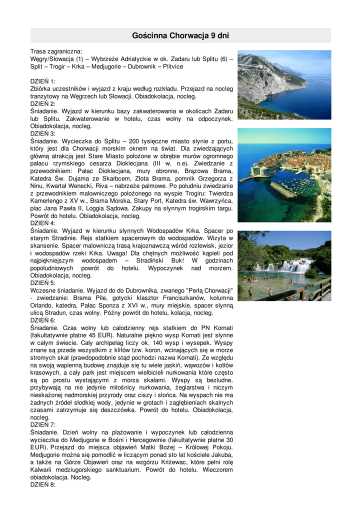 Gościnna Chorwacja 9 dni Trasa zagraniczna: Węgry/Słowacja (1) – Wybrzeże Adriatyckie w ok. Zadaru lub Splitu (6) – Split – Trogir – Krka – Medjugorie – Dubrownik – Plitvice DZIEŃ 1: Zbiórka uczestników i wyjazd z kraju według rozkładu. Przejazd na nocleg tranzytowy na Węgrzech lub Słowacji. Obiadokolacja, nocleg. DZIEŃ 2: Śniadanie. Wyjazd w kierunku bazy zakwaterowania w okolicach Zadaru lub Splitu. Zakwaterowanie w hotelu, czas wolny na odpoczynek. Obiadokolacja, nocleg. DZIEŃ 3: Śniadanie. Wycieczka do Splitu – 200 tysięczne miasto słynie z portu, który jest dla Chorwacji morskim oknem na świat. Dla zwiedzających główną atrakcją jest Stare Miasto położone w obrębie murów ogromnego pałacu rzymskiego cesarza Dioklecjana (III w. n.e). Zwiedzanie z przewodnikiem: Pałac Dioklecjana, mury obronne, Brązowa Brama, Katedra Św. Dujama ze Skarbcem, Złota Brama, pomnik Grzegorza z Ninu, Kwartał Wenecki, Riva – nabrzeże palmowe. Po południu zwiedzanie z przewodnikiem malowniczego położonego na wyspie Trogiru: Twierdza Kamerlengo z XV w., Brama Morska, Stary Port, Katedra św. Wawrzyńca, plac Jana Pawła II, Loggia Sądowa. Zakupy na słynnym trogirskim targu. Powrót do hotelu. Obiadokolacja, nocleg. DZIEŃ 4: Śniadanie. Wyjazd w kierunku słynnych Wodospadów Krka. Spacer po starym Stradinie. Rejs statkiem spacerowym do wodospadów. Wizyta w skansenie. Spacer malowniczą trasą krajoznawczą wśród rozlewisk, jezior i wodospadów rzeki Krka. Uwaga! Dla chętnych możliwość kąpieli pod najpiękniejszym wodospadem – Stradiński Buk! W godzinach popołudniowych powrót do hotelu. Wypoczynek nad morzem. Obiadokolacja, nocleg. DZIEŃ 5: Wczesne śniadanie. Wyjazd do do Dubrownika, zwanego "Perłą Chorwacji" - zwiedzanie: Brama Pile, gotycki klasztor Franciszkanów, kolumna Orlando, katedra, Pałac Sponza z XVI w., mury miejskie, spacer słynną ulicą Stradun, czas wolny. Późny powrót do hotelu, kolacja, nocleg. DZIEŃ 6: Śniadanie. Czas wolny lub całodzienny rejs statkiem do PN Kornati (fakultatywnie płatne 45 EUR). Naturalne piękno wysp Kornati jest słynne w całym świecie. Cały archipelag liczy ok. 140 wysp i wysepek. Wyspy znane są przede wszystkim z klifów tzw. koron, wcinających się w morze stromych skał (prawdopodobnie stąd pochodzi nazwa Kornati). Ze względu na swoją wapienną budowę znajduje się tu wiele jaskiń, wąwozów i kotłów krasowych, a cały park jest miejscem wielbicieli nurkowania które często są po prostu wystającymi z morza skałami. Wyspy są bezludne, przybywają na nie jedynie miłośnicy nurkowania, żeglarstwa i niczym nieskażonej nadmorskiej przyrody oraz ciszy i słońca. Na wyspach nie ma żadnych źródeł słodkiej wody, jedynie w grotach i zagłębieniach skalnych czasami zatrzymuje się deszczówka. Powrót do hotelu. Obiadokolacja, nocleg. DZIEŃ 7: Śniadanie. Dzień wolny na plażowanie i wypoczynek lub całodzienna wycieczka do Medjugorie w Bośni i Hercegowinie (fakultatywnie płatne 30 E UR). Przejazd do miejsca objawień Matki Bożej – Królowej Pokoju. Medjugorie można się pomodlić w liczącym ponad sto lat kościele Jakuba, a także na Górze Objawień oraz na wzgórzu Kriżewac, które pełni rolę Kalwarii medziugorskiego sanktuarium. Powrót do hotelu. Wieczorem obiadokolacja. Nocleg. DZIEŃ 8: Śniadanie. Wykwaterowanie i wyjazd do jednej z najpiękniejszych atrakcji turystycznych Chorwacji. Park Narodowy Plitvickie Jeziora, gdzie na obszarach porośniętych przez buki, jodły, świerki i klony, znajduje się 16 turkusowych jezior położonych tarasowo na długości 8 km i połączonych ze sobą 72 wodospadami. Obszar parku zaliczany jest do światowego dziedzictwa naturalnego i jest chroniony przez UNESCO. Następnie wyjazd do kraju, przejazd non-stop. DZIEŃ 9: Przyjazd do Polski w godzinach przedpołudniowych. Powrót do poszczególnych miejscowości. Program imprezy jest ramowy, kolejność zwiedzania może ulec zmianie. TERMINY I CENY KATALOGOWE (zł): 28.05 – 05.06 2099 01.09 – 09.09 2099 19.09 – 27.09 2099 21.10 – 29.10 2099 CENA IMPREZY OBEJMUJE: - przejazd autokarem (klimatyzacja, dvd, barek, wc) - 7 noclegów w hotelach**+/*** w pokojach 2-osobowych z łazienką - 7 śniadań i 7 obiadokolacji - opiekę pilota - ubezpieczenie Signal Iduna (KL 10.000 EUR, NNW 15.000 PLN, bagaż 1.000 PLN) DODATKOWO PŁATNE: - pakiet do realizacji programu 130 EUR (rezerwacje i wstępy do zwiedzanych obiektów, usługi przewodnickie, zestaw słuchawkowy Tour Guide, taksa klimatyczna w Chorwacji) płatny obligatoryjnie pilotowi grupy - fakultatywny rejs statkiem do wysp Kornati 45 EUR (min. 25 os. chętnych) - fakultatywna wycieczka do Medjugorie 30 EUR (min. 25 os. chętnych) DOPŁATY OPCJONALNE: dopłata do pokoju 1-osobowego: 600 zł WAŻNE INFORMACJE: 1 . Wycieczki będą realizowane w zależności od ilości uczestników w grupie: wygodnymi autokarami lub wygodnymi busami. 2 . Niektóre połączenia krajowe mogą być realizowane innymi środkami transportu niż autokar (bus, samochód osobowy, autokar liniowy, pociąg). Trasy antenowe obsługiwane są bez pilota. 3. Wyjazd *antenkowy za dopłatą z wybranego miasta organizowany przy minimum 6 os. wsiadających. W przypadku braku wymaganego min. 6 osób PBP OLSZTYN ma prawo anulować wyjazd z danej miejscowości. Anulacja wyjazdu nie upoważnia do bezkosztowej rezygnacji z wycieczki. W takim przypadku Klient wybiera wyjazd z innej miejscowości gwarantowanej. 4 . Podczas przejazdów krajowych w ramach niektórych wycieczek możliwe są przesiadki. 5 . Godziny i miejsca wsiadania mogą ulec zmianie, po wcześniejszym poinformowaniu Klienta. 6 . Pakiet do realizacji programu (rezerwacje i wstępy do zwiedzanych obiektów, usługi przewodnickie, bilety komunikacji miejskiej, opłaty klimatyczne oraz koszty zestawu słuchawkowego Tour Guide lub inne) nie jest ujęty w cenie imprezy wyrażonej w PLN. Cena pakie