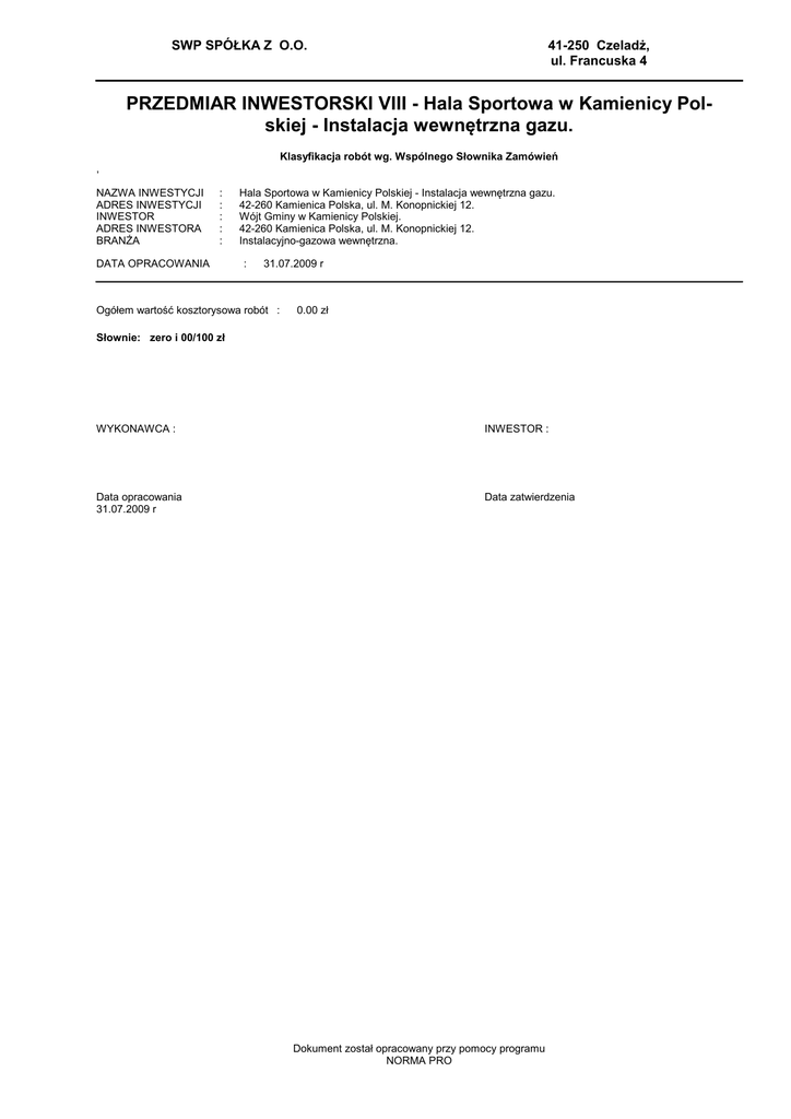 SWP SPÓŁKA Z O.O. 41-250 Czeladż, ul. Francuska 4 PRZEDMIAR INWESTORSKI VIII - Hala Sportowa w Kamienicy Polskiej - Instalacja wewnętrzna gazu. Klasyfikacja robót wg. Wspólnego Słownika Zamówień , NAZWA INWESTYCJI ADRES INWESTYCJI INWESTOR ADRES INWESTORA BRANŻA : : : : : DATA OPRACOWANIA Hala Sportowa w Kamienicy Polskiej - Instalacja wewnętrzna gazu. 42-260 Kamienica Polska, ul. M. Konopnickiej 12. Wójt Gminy w Kamienicy Polskiej. 42-260 Kamienica Polska, ul. M. Konopnickiej 12. Instalacyjno-gazowa wewnętrzna. : 31.07.2009 r Ogółem wartość kosztorysowa robót : 0.00 zł Słownie: zero i 00/100 zł WYKONAWCA : INWESTOR : Data opracowania 31.07.2009 r Data zatwierdzenia Dokument został opracowany przy pomocy programu NORMA PRO Kamienica Polska VIII - Instalacja wewnętrzna gazu. Lp. Podst 1 KNNR 4 0304-07 2 KNNR 4 0304-06 3 KNR 2-19 0216-06 4 KNNR 4 0312-06 5 KNNR 4 0307-04 6 KNNR 2 1404-05 7 KNR 7-08 0403-02 8 KNR 7-08 0403-02 PRZEDMIAR Opis i wyliczenia Rurociągi w instalacjach gazowych stalowe o połączeniach spawanych o śr.nom. 65 mm na ścianach w budynkach niemieszkalnych 7.00 j.m. m Rurociągi w instalacjach gazowych stalowe o połączeniach spawanych o śr.nom. 50 mm na ścianach w budynkach niemieszkalnych 7.00 m Przejścia gazociągu przez ściany murowane o grub.2 ceg.dla przyłączy o sr.nom.do 65 mm w tulejach z rur stal.o sr.do 100 mm 1.00 przej. Kurki gazowe przelotowe o śr. 50 mm o połączeniach gwintowanych - KURKI GAZOWE SFERYCZNE O ŚR. 50 MM O POŁĄCZENIACH GWINTOWYCH 2.00 szt. Próba instalacji gazowej na ciśnienie dla wykonawcy i dostawcy gazu przed gazomierzem w budynkach niemieszkalnych - śr. rurociągu do 65 mm 1.00 prob. Malowanie rur stalowych i blaszanych o śr.50-100 mm m 7.00+7.00 m Układy sygnalizacji przepływu - DETEKTOR GAZU DEX-1 ukl. 2.00 ukl. Układy sygnalizacji przepływu - MODUŁ ALARMOWY MD 2.Z ukl. 1.00 ukl. -2- Norma PRO Wersja 4.27 m m przej. szt. prob. Poszcz Razem 7.000 RAZEM 7.000 7.000 RAZEM 7.000 1.000 RAZEM 1.000 2.000 RAZEM 2.000 1.000 RAZEM 1.000 14.000 RAZEM 14.000 2.000 RAZEM 2.000 1.000 RAZEM 1.000 Kamienica Polska VIII - Instalacja wewnętrzna gazu. ZESTAWIENIE ROBOCIZNY Lp. Nazwa Jm 1. robocizna RAZEM r-g Słownie: zero i 00/100 zł -3- Norma PRO Wersja 4.27 Ilość 44.7724 Kamienica Polska VIII - Instalacja wewnętrzna gazu.ZESTAWIENIE MATERIAŁÓW Lp. 1. 2. 3. 4. 5. 6. 7. 8. 9. 10. 11. 12. 13. 14. 15. 16. 17. 18. 19. 20. Nazwa Detektor gazu DEX-1 Moduł alarmowy MD 2.Z asfalt izolacyjny wysokotopliwy IW-80,IW-100 Farba ftalowa do gruntowania p/rdzewna Farba ftalowa do gruntowania p/rdzewna Acetylen rozpuszczony techniczny Tlen sprężony techniczny Cement portl,zwykły b.dod. CEM I 32,5-work Rura stalowa czarna fi 60,3/3,6 mm Rura stalowa czarna fi 76,1/3,6 mm rury stalowe typ S inst. czarne śr.15 mm rury stalowe przewodowe ze szwem fi 133,0/4,0 mm łączniki z żeliwa ciągliwego czarne śr.15 mm kurki gazowe mosiężne śr.15 mm zawory sferyczne kulowe z kurkiem kulistym mos.do gazu o śr. 50 mm uchwyty do rurociągów stalowych o śr.nom. 65 mm uchwyty do rurociągów stalowych o śr.nom. 50 mm Sznur konopny - smołowany sygnalizator alarmowy materiały pomocnicze RAZEM Słownie: zero i 00/100 zł -4- Norma PRO Wersja 4.27 Jm szt szt kg dm3 dm3 kg m3 t m m m m szt szt szt szt szt kg szt zł Ilość 2.0000 1.0000 5.0000 0.3780 0.3780 0.0200 0.0900 0.0060 7.2100 7.1400 0.0500 0.6000 0.0100 0.0100 2.0000 3.2200 3.6400 2.7000 2.0000 Kamienica Polska VIII - Instalacja wewnętrzna gazu. Lp. 1. Samochód dostaw.do 0.9t (1) RAZEM ZESTAWIENIE SPRZĘTU Nazwa Jm m-g Słownie: zero i 00/100 zł -5- Norma PRO Wersja 4.27 Ilość 0.3200