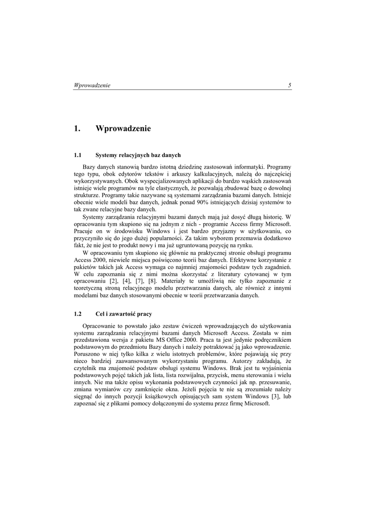 Wprowadzenie 1. Wprowadzenie 1.1 Systemy relacyjnych baz danych 5 Bazy danych stanowią bardzo istotną dziedzinę zastosowań informatyki. Programy tego typu, obok edytorów tekstów i arkuszy kalkulacyjnych, naleŜą do najczęściej wykorzystywanych. Obok wyspecjalizowanych aplikacji do bardzo wąskich zastosowań istnieje wiele programów na tyle elastycznych, Ŝe pozwalają zbudować bazę o dowolnej strukturze. Programy takie nazywane są systemami zarządzania bazami danych. Istnieje obecnie wiele modeli baz danych, jednak ponad 90% istniejących dzisiaj systemów to tak zwane relacyjne bazy danych. Systemy zarządzania relacyjnymi bazami danych mają juŜ dosyć długą historię. W opracowaniu tym skupiono się na jednym z nich - programie Access firmy Microsoft. Pracuje on w środowisku Windows i jest bardzo przyjazny w uŜytkowaniu, co przyczyniło się do jego duŜej popularności. Za takim wyborem przemawia dodatkowo fakt, Ŝe nie jest to produkt nowy i ma juŜ ugruntowaną pozycję na rynku. W opracowaniu tym skupiono się głównie na praktycznej stronie obsługi programu Access 2000, niewiele miejsca poświęcono teorii baz danych. Efektywne korzystanie z pakietów takich jak Access wymaga co najmniej znajomości podstaw tych zagadnień. W celu zapoznania się z nimi moŜna skorzystać z literatury cytowanej w tym opracowaniu [2], [4], [7], [8]. Materiały te umoŜliwią nie tylko zapoznanie z teoretyczną stroną relacyjnego modelu przetwarzania danych, ale równieŜ z innymi modelami baz danych stosowanymi obecnie w teorii przetwarzania danych. 1.2 Cel i zawartość pracy Opracowanie to powstało jako zestaw ćwiczeń wprowadzających do uŜytkowania systemu zarządzania relacyjnymi bazami danych Microsoft Access. Została w nim przedstawiona wersja z pakietu MS Office 2000. Praca ta jest jedynie podręcznikiem podstawowym do przedmiotu Bazy danych i naleŜy potraktować ją jako wprowadzenie. Poruszono w niej tylko kilka z wielu istotnych problemów, które pojawiają się przy nieco bardziej zaawansowanym wykorzystaniu programu. Autorzy zakładają, Ŝe czytelnik ma znajomość podstaw obsługi systemu Windows. Brak jest tu wyjaśnienia podstawowych pojęć takich jak lista, lista rozwijalna, przycisk, menu sterowania i wielu innych. Nie ma takŜe opisu wykonania podstawowych czynności jak np. przesuwanie, zmiana wymiarów czy zamknięcie okna. JeŜeli pojęcia te nie są zrozumiałe naleŜy sięgnąć do innych pozycji ksiąŜkowych opisujących sam system Windows [3], lub zapoznać się z plikami pomocy dołączonymi do systemu przez firmę Microsoft. 6 Wprowadzenie do projektowania baz danych Praca została napisana w formie kolejnych ćwiczeń do samodzielnego wykonania. KaŜdy zestaw ćwiczeń został poprzedzony opisem wprowadzającym do nowego materiału, który pozwala na ich realizację. Wykonanie kolejnych ćwiczeń doprowadza ostatecznie do realizacji gotowej aplikacji zarządzającej bazą danych “Biblioteka” i działającej w środowisku MS Access. Podstawowe załoŜenia tego projektu zostaną przedstawione w punkcie 1.3, a gotowa aplikacja zawierająca elementy opisane w tym opracowaniu oraz zrealizowane juŜ elementy opisane w ćwiczeniach jest udostępniona wraz z pracą. Opracowanie podzielone zostało na kilka rozdziałów opisujących kolejno: Rozdział 2. Podstawy programu Microsoft Access - opis podstawowych elementów bazy danych w programie Access, operacje na pliku bazy danych i główne okno bazy. Rozdział 3. Tabele - tworzenie struktury tabel i wypełnianie ich danymi. Rozdział 4. Kwerendy - podstawy tworzenia kwerend, kwerendy działające na pojedynczej i wielu tabelach. Rozdział 5. Formularze - tworzenie formularzy do tabel i kwerend, praca z wykorzystaniem asystenta i bez jego pomocy. Rozdział 6. Makrodefinicje - opis wybranych makrodefinicji. Rozdział 7. Menu uŜytkownika i start bazy danych - opis budowy menu aplikacji i określenie czynności wykonywanych przy otwieraniu bazy danych. Rozdział 8. Zaawansowane narzędzia opis kilku wybranych zaawansowanych czynności i metod usprawniających działanie projektu. Uzupełnienie stanowią dwa dodatki. Dodatek A jest zbiorem podstawowych pojęć i definicji najczęściej występujących w rozwaŜaniach na temat relacyjnych baz danych. Dodatek B natomiast przedstawia teoretyczną analizę projektu “Biblioteka”. MoŜna tam prześledzić kolejne etapy projektu od formy opisowej do trzeciej formy normalnej. Pracę kończy proponowana literatura uzupełniająca obejmująca nie tylko opis programu Access, ale równieŜ samego środowiska Windows. Wśród pozycji poświęconych programowi Access znajduje się takŜe kilka opracowań opisujących wcześniejsze wersje tego pakietu, poniewaŜ w wielu punktach zachowały one swoją aktualność. Obok wymienionych materiałów najłatwiej dostępnym i wartym polecenia źródłem informacji są pliki pomocy dołączone do programu, z których moŜna korzystać na kaŜdym etapie budowania projektu. 1.3 Analiza projektu “Biblioteka” Omawiana w opracowaniu przykładowa baza danych jest nieduŜym i nieskomplikowanym projektem. Został on dobrany tak, aby uwypuklić cechy programu Access jako systemu zarządzania bazą danych i nie przysłaniać ich problemami teoretycznymi, wynikającymi z relacyjnego modelowania danych. Więcej informacji na temat teoretycznej strony tego zagadnienia moŜna znaleźć w cytowanej literaturze. W projekcie “Biblioteka” przyjęto poniŜsze załoŜenia: Wprowadzenie 1. 7 Baza zawiera informacje na temat pewnej biblioteki uczelnianej. Przechowuje dane osób korzystających z wypoŜyczalni, ksiąŜek i historię wypoŜyczeń. 2. WypoŜyczający podzieleni są na kategorie (np. student, wykładowca) o róŜnych uprawnieniach. 3. KsiąŜkom przypisano słowa kluczowe ułatwiające ich poszukiwanie. 4. Historia wypoŜyczeń zawiera informacje o tym kiedy i przez kogo była wypoŜyczona dana ksiąŜka oraz kiedy