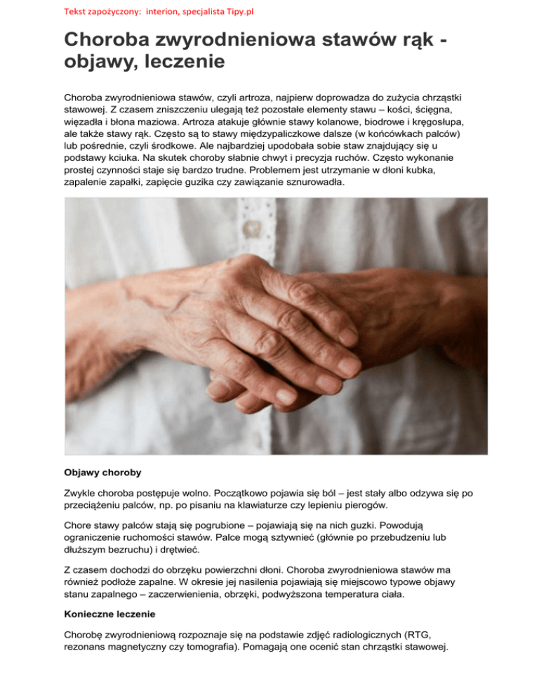 Tekst zapożyczony: interion, specjalista Tipy.pl Choroba zwyrodnieniowa stawów rąk objawy, leczenie Choroba zwyrodnieniowa stawów, czyli artroza, najpierw doprowadza do zużycia chrząstki stawowej. Z czasem zniszczeniu ulegają też pozostałe elementy stawu – kości, ścięgna, więzadła i błona maziowa. Artroza atakuje głównie stawy kolanowe, biodrowe i kręgosłupa, ale także stawy rąk. Często są to stawy międzypaliczkowe dalsze (w końcówkach palców) lub pośrednie, czyli środkowe. Ale najbardziej upodobała sobie staw znajdujący się u podstawy kciuka. Na skutek choroby słabnie chwyt i precyzja ruchów. Często wykonanie prostej czynności staje się bardzo trudne. Problemem jest utrzymanie w dłoni kubka, zapalenie zapałki, zapięcie guzika czy zawiązanie sznurowadła. Objawy choroby Zwykle choroba postępuje wolno. Początkowo pojawia się ból – jest stały albo odzywa się po przeciążeniu palców, np. po pisaniu na klawiaturze czy lepieniu pierogów. Chore stawy palców stają się pogrubione – pojawiają się na nich guzki. Powodują ograniczenie ruchomości stawów. Palce mogą sztywnieć (głównie po przebudzeniu lub dłuższym bezruchu) i drętwieć. Z czasem dochodzi do obrzęku powierzchni dłoni. Choroba zwyrodnieniowa stawów ma również podłoże zapalne. W okresie jej nasilenia pojawiają się miejscowo typowe objawy stanu zapalnego – zaczerwienienia, obrzęki, podwyższona temperatura ciała. Konieczne leczenie Chorobę zwyrodnieniową rozpoznaje się na podstawie zdjęć radiologicznych (RTG, rezonans magnetyczny czy tomografia). Pomagają one ocenić stan chrząstki stawowej. Tekst zapożyczony: interion, specjalista Tipy.pl W leczeniu stosuje się niesteroidowe leki przeciwzapalne (NLPZ) lub paracetamol. Zmniejszają one dolegliwości bólowe. Istotnymi sposobami wspomagającymi leczenie farmakologiczne są: masaże, hydroterapia, krioterapia (leczenie zimnem). Na obrzęk stawów, uśmierzenie bólu i zmniejszenie uczucia drętwienia pomagają domowe sposoby: ciepłe okłady z ręczników czy termoforów lub zimne kompresy i okłady z lodu. Nieodzowne ćwiczenia Zmniejszają ból, zwiększają elastyczność stawu i siłę okalających go mięśni. Zwiększ zakres ruchu w nadgarstku: siedząc przy stole, połóż ręce na blacie tak, by nadgarstki opierały się o jego krawędź, a dłonie luźno zwisały ku podłodze. Powoli unoś raz jedną, raz drugą dłoń, maksymalnie odwodząc ją ku górze. Ćwicz chwyt hakowy: zahacz o siebie palce obu dłoni i jak najmocniej rozciągaj je na zewnątrz. Zwiększaj zakres ruchu palców: dłoń z rozsuniętymi palcami połóż na blacie i odsuwaj kolejno jeden palec od drugiego (możesz pomóc sobie drugą ręką). Trenuj siłę chwytu: połóż przedramię na stole, dłonią chwyć kolisty przedmiot o dość dużej średnicy (np. gumową piłkę, gąbkę). Na zmianę ściskaj i rozluźniaj uchwyt. W miarę postępów zmniejszaj średnicę przedmiotu. Usprawniaj ruchomość palców: oprzyj dłoń na książce. Odwracaj jej kartki po kolei każdym palcem z osobna. Poprawiaj jakość chwytu: opuszkami kolejnych palców dociskaj kciuk.
