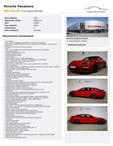 Porsche Panamera 609 500,00 zł [nr oferty 081342] Rok produkcji: 2016 Pojemność silnika: 4806 cm3 Moc: 440KM Typ nadwozia: sedan Liczba drzwi: 5 Kolor nadwozia: czerwony Wyposażenie standardowe Porsche Centrum Poznań • 4/5 zagłówki • ABS - system zapobiegający blokowaniu się kół podczas hamowania • Airbag 6 sztuk (czołowe poduszki kierowcy i pasażera, boczne poduszki - przód, kurtyny powietrzne) • Airbagi chroniące kolana kierowcy i pasażera • Alarm • ASR - system zapobiegający poślizgowi kół pojazdu podczas przyspieszania • Asystent hamowania • Asystent parkowania (przód i tył) • Asystent parkowania (tył) • Asystent włączania świateł • Czujnik deszczu • Dwie podwójne końcówki układu wydechowego • Dyfuzor tylnego zderzaka malowany w kolorze Platinum Silver Metallic • EDTC - system wspomagania hamowania silnikiem • El. podnoszenie szyb, przód i tył • Felgi aluminiowe 19 Panamera Turbo z ogum. przód: 255/45, tył: 285/40 • Filtr przeciwpyłkowy • Fotele przednie sportowe, adaptacyjne regulowane elektrycznie w 18-kierunkach z pamięcią • Fotele przednie z funkcją podgrzewania • Funkcja oświetlenia drogi do domu - Welcome Home • Immobilizer • Kierownica SportDesign • Klapa bagażnika unoszona automatycznie • Klimatyzacja automatyczna 2-strefowa • Kolumna kierownicy regulowana elektrycznie • Komputer pokładowy • Lakier uni • Lakierowane spoilery progowe • Lampy Bi-ksenonowe ze spryskiwaczami z Porsche Dynamic Light System (PDLS) • Lusterka boczne przyciemniające się automatycznie • Lusterka boczne regulowane elektrycznie i ogrzewane • Lusterka boczne składane elektrycznie • Nakładki progów w kolorze czarnym matowym • Nakładki progów wykonane ze szczotkowanego aluminium, przód • Obrotomierz • Pamięć ustawień foteli przednich, kolumny kierowniczej i lusterek bocznych • Pasy bezpieczeństwa z napinaczami, 3-punktowe • Podsufitka z Alcantary • Porsche Active Suspension Management (PASM) - zawieszenie aktywne • Porsche Stability Management (PSM) - system stabilizacji toru jazdy (ESP) • Porsche Traction Managemen (PTM) - system kontroli trakcji • Przedni podłokietnik ze schowkiem • Przekładki dystansowe 5 mm • Przycisk Strat-Stop • Radio CD/MP3 CDR-311 z dotykowym ekranem + 10 głośników • Sport Chrono - tryb sportowy z możliwością odtworzenia parametrów z jazdy • System Auto Start-Stop • System kontroli ciśnienia w oponach • System rekuperacji (odzyskiwania energii hamowania) • Szyba przednia i boczne przednie szyby z powłoką hydrofobową • Szyba przednia z szarym klinem przeciwsłonecznym • Szyby barwione • Światła do jazdy dziennej LED • Tapicerka łączona Alcantara/skóra w kolorach standardowych • Tempomat • Termometr zewnętrzny • Trzecie światło STOP • Tylne lampy wykonane w technologii LED • Tylny podłokietnik ze schowkiem • Tylny spojler - adaptacyjny (4-pozycyjny) • Uchwyty ISOFIX do montażu fotelika dziecięcego - tył • Wspomaganie układu kierowniczego • Wykończenie wnętrza - włókno węglowe • Zaciski hamulcowe - czerwone • Zamek centralny z pilotem • Zawieszenie pneumatyczne z systemem poziomowania i regulacją prześwitu (PASM) • Zbiornik paliwa 100 l • Zestaw do naprawy przebitej opony ul. Warszawska 67, Poznań Bartłomiej Suchorski