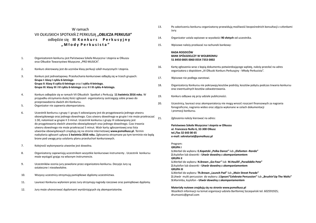 W ramach VII OLKUSKICH SPOTKAŃ Z PERKUSJĄ „OBLICZA PERKUSJI” odbędzie się III K o n k u r s P e r k u s y j n y „Młody Perkusista” 1. Organizatorem konkursu jest Państwowa Szkoła Muzyczna I stopnia w Olkuszu oraz Olkuskie Towarzystwo Muzyczne „PRO MUSICA”. 2. Konkurs skierowany jest do uczniów klasy perkusji szkół muzycznych I stopnia. 3. Konkurs jest jednoetapowy. Przesłuchania konkursowe odbędą się w trzech grupach: Grupa I: klasy I cyklu 6-letniego Grupa II: klasy II cyklu 6-letniego oraz I cyklu 4-letniego. Grupa III: klasy III i IV cyklu 6-letniego oraz II I III cyklu 4-letniego. 4. 5. 6. Konkurs odbędzie się w ramach VII Olkuskich Spotkań z Perkusją 11 kwietnia 2016 roku. W przypadku otrzymania dużej ilości zgłoszeń organizatorzy zastrzegają sobie prawo do przeprowadzenia dwóch dni Konkursu. Organizator nie zapewnia akompaniatora. Uczestnik konkursu z grupy I i grupy II zobowiązany jest do przygotowania jednego utworu obowiązkowego oraz jednego dowolnego. Czas utworu dowolnego w grupie I nie może przekraczać 1:30, natomiast w grupie II 3 minut. Uczestnik konkursu z grupy III zobowiązany jest do przygotowania dwóch utworów obowiązkowych oraz jednego dowolnego. Czas trwania utworu dowolnego nie może przekraczać 5 minut. Wzór karty zgłoszeniowej oraz lista utworów obowiązkowych znajdują się na stronie internetowej www.psmolkusz.pl. Termin nadsyłania zgłoszeń upływa 1 kwietnia 2016 roku. Zgłoszenia otrzymane po tym terminie nie będą brane pod uwagę przy ustalaniu planu przesłuchań konkursowych. 7. Kolejność wykonywania utworów jest dowolna. 8. Organizatorzy zapewniają uczestnikom wszystkie konkursowe instrumenty . Uczestnik konkursu może wystąpić grając na własnym instrumencie. 9. Uczestników ocenia jury powołane przez organizatora konkursu. Decyzje Jury są ostateczne i nieodwołalne. 10. Wszyscy uczestnicy otrzymują pamiątkowe dyplomy uczestnictwa. 11. Laureaci Konkursu wyłonieni przez Jury otrzymają nagrody rzeczowe oraz pamiątkowe dyplomy. 12. Jury może uhonorować dyplomami wyróżniających się akompaniatorów. 13. Po zakończeniu konkursu organizatorzy przewidują możliwość bezpośrednich konsultacji z członkami Jury. 14. Organizator ustala wpisowe w wysokości 90 złotych od uczestnika. 15. Wpisowe należy przekazać na rachunek bankowy: RADA RODZICÓW BANK SPÓŁDZIELCZY W WOLBROMIU 51 8450 0005 0060 0554 7353 0002 16. Kartę zgłoszenia wraz z kopią dokumentu potwierdzającego wpłatę, należy przesłać na adres organizatora z dopiskiem „III Olkuski Konkurs Perkusyjny - Młody Perkusista”. 17. Wpisowe nie podlega zwrotowi. 18. Organizatorzy Konkursu nie pokrywają kosztów podróży, kosztów pobytu podczas trwania konkursu oraz ewentualnych kosztów zakwaterowania. 19. Konkurs odbywa się przy udziale publiczności. 20. Uczestnicy, laureaci oraz akompaniatorzy nie mogą wnosić roszczeń finansowych za nagrania fonograficzne, nagrania wideo oraz zdjęcia wykonane w celach dokumentacji i promocji konkursu. 21. Zgłoszenia należy kierować na adres: Państwowa Szkoła Muzyczna I stopnia w Olkuszu ul. Francesco Nullo 6, 32-300 Olkusz tel./fax 32 643 00 65 e-mail: [email protected] Program: GRUPA I 1.Werbel do wyboru: E.Kopetzki „Polka Dance” lub „Elefanten -Rondo” 2.Ksylofon lub dzwonki - Utwór dowolny z akompaniamentem GRUPA II 1.Werbel do wyboru: N.Brown „Go-Four” lub M.Houllif „Paradiddle Pete” 2.Ksylofon lub dzwonki - Utwór dowolny z akompaniamentem GRUPA III 1.Werbel do wyboru: Th.Brown „Launch Pad” lub „Main Street Parade” 2.Utwór multi percussion do wyboru: J.Spears”Celebrate Percussion” lub „Brushin'Up The Waltz” 3.Marimba, ksylofon - Utwór dowolny z akompaniamentem Materiały nutowe znajdują się na stronie www.psmolkusz.pl Wszelkich informacji na temat organizacji udziela Bartłomiej Szczepański tel. 602591925; [email protected]