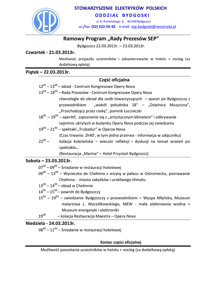 STOWARZYSZENIE ELEKTRYKÓW POLSKICH ODDZIAŁ BYDGOSKI ul. B. Rumioskiego 6, 85-030 Bydgoszcz tel./fax (52) 322-55-92 e-mail: [email protected] Ramowy Program „Rady Prezesów SEP” Bydgoszcz 22.03.2013r. – 23.03.2013r. Czwartek - 21.03.2013r. Możliwośd przyjazdu uczestników i zakwaterowanie w hotelu + nocleg (za dodatkową opłatą) Piątek – 22.03.2013r. Część oficjalna 00 00 12 – 13 – obiad - Centrum Kongresowe Opery Nova 1300 – 1800 – Rada Prezesów - Centrum Kongresowe Opery Nova równolegle do obrad dla osób towarzyszących – spacer po Bydgoszczy z przewodnikiem „wokół południka 18” – „Dzielnica Muzyczna”, „Przechodzący przez rzekę”, pomnik Łuczniczki 00 00 18 – 19 – aperitif, zapoznanie się z „artystycznym klimatem” i odkrywanie tajemnic ukrytych w budynku Opery Nova podczas jej zwiedzania 00 40 19 – 21 – spektakl „Trubadur” w Operze Nova (Czas trwania: 2h40', w tym jedna przerwa - informacja w załączniku) 00 22 – kolacja koleżeoska – wieczór refleksji i dyskusji na temat wrażeo po spektaklu… (Restauracja „Marina” – Hotel Przystao Bydgoszcz) Sobota – 23.03.2013r. 0700 – 0900 – Śniadanie w restauracji hotelowej 0900 – 1300 – Wycieczka do Chełmna z wizytą w pałacu w Ostromecku, poznawanie Chełmna - miasta zabytków i urokliwego klimatu 00 00 13 – 14 – obiad w Chełmnie 1400 – 1500 – powrót do Bydgoszczy 1500 – 1900 – zwiedzanie Bydgoszczy z przewodnikiem – Wyspa Młyoska, Muzeum malarstwa L. Wyczółkowskiego, MEW - mała elektrownia wodna + Muzeum energetyki i elektroniki 00 19 – kolacja Restauracja Maestra – Opera Nova Niedziela - 24.03.2013r. 0800 – 1100 – Śniadanie w restauracji hotelowej Koniec części oficjalnej Możliwośd pozostania uczestników w hotelu + nocleg (za dodatkową opłatą)