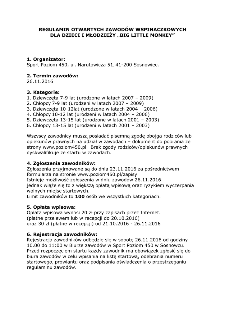 REGULAMIN OTWARTYCH ZAWODÓW WSPINACZKOWYCH DLA DZIECI I MŁODZIEŻY „BIG LITTLE MONKEY” 1. Organizator: Sport Poziom 450, ul. Narutowicza 51, 41-200 Sosnowiec. 2. Termin zawodów: 26.11.2016 3. Kategorie: 1. Dziewczęta 7-9 lat (urodzone w latach 2007 – 2009) 2. Chłopcy 7-9 lat (urodzeni w latach 2007 – 2009) 3. Dziewczęta 10-12lat (urodzone w latach 2004 – 2006) 4. Chłopcy 10-12 lat (urodzeni w latach 2004 – 2006) 5. Dziewczęta 13-15 lat (urodzone w latach 2001 – 2003) 6. Chłopcy 13-15 lat (urodzeni w latach 2001 – 2003) Wszyscy zawodnicy muszą posiadać pisemną zgodę obojga rodziców lub opiekunów prawnych na udział w zawodach – dokument do pobrania ze strony www.poziom450.pl Brak zgody rodziców/opiekunów prawnych dyskwalifikuje ze startu w zawodach. 4. Zgłoszenia zawodników: Zgłoszenia przyjmowane są do dnia 23.11.2016 za pośrednictwem formularza na stronie www.poziom450.pl/zapisy Istnieje możliwość zgłoszenia w dniu zawodów 26.11.2016 jednak wiąże się to z większą opłatą wpisową oraz ryzykiem wyczerpania wolnych miejsc startowych. Limit zawodników to 100 osób we wszystkich kategoriach. 5. Opłata wpisowa: Opłata wpisowa wynosi 20 zł przy zapisach przez Internet. (płatne przelewem lub w recepcji do 20.10.2016) oraz 30 zł (płatne w recepcji) od 21.10.2016 - 26.11.2016 6. Rejestracja zawodników: Rejestracja zawodników odbędzie się w sobotę 26.11.2016 od godziny 10.00 do 11:00 w Biurze zawodów w Sport Poziom 450 w Sosnowcu. Przed rozpoczęciem startu każdy zawodnik ma obowiązek zgłosić się do biura zawodów w celu wpisania na listę startową, odebrania numeru startowego, prowiantu oraz podpisania oświadczenia o przestrzeganiu regulaminu zawodów. 7. Świadczenia dla zawodników: - Prowiant - Medale za 3 pierwsze miejsca w każdej z kategorii. - Nagrody rzeczowe dla 3 pierwszych miejsc w każdej z kategorii. - Nagrody rzeczowe rozlosowane wśród uczestników zawodów. Pula nagród rzeczowych wynosi 3000zł. 8. Formuła zawodów oraz punktacja: Zawody będą rozegrane w jednej rundzie, w konkurencji wspinanie na trudność, z asekuracją górną (wędka). O zajętym miejscu decydować będzie suma zdobytych punktów, W przypadku miejsc ex-equo, pod uwagę bierzemy ilość Topów, w ostateczności sumę czasów przejścia. - ok. 8 dróg wspinaczkowych z asekuracją górną (wędka), dla wszystkich kategorii wiekowych. - Drogi o zróżnicowanym stopniu trudności. - Wszyscy uczestnicy startują w jednej grupie o godz. 11.30 - Wszyscy zawodnicy mają 1 próbę na każdej z dróg. - Obowiązuje brak Strefy izolacji oraz dowolna kolejność startów. - Punktacja: Przejście drogi jest klasyfikowane od startu do topu (za zaliczony Top uznaje się złapanie ostatniego chwytu na drodze dwoma rękami) punktowany będzie postęp na drodze, za każdy przytrzymany chwyt zawodnik otrzyma 1pkt. - Zawodnicy mają po 5min na przejście każdej z dróg. - W wypadku uzyskania przez zawodników takiej samej liczby punktów zawodnik mający zaliczoną większą liczbę topów uzyskuję wyższą lokatę. - Nagrody zostaną przyznane dla pierwszych trzech miejsc w każdej kategorii. 9. Harmonogram zawodów: 10:00 – 11:00 Rejestracja zawodników w biurze zawodów. 11:00 – 11:30 Prezentacja dróg wspinaczkowych oraz omówienie zasad punktacji. 11:30 – 15:30 Zawody. 16:00 Rozdanie nagród. 10. Informacje dodatkowe: Uwaga! Uprawianie wspinaczki może powodować ryzyko utraty zdrowia i życia nawet w przypadku respektowania wszelkich zasad bezpieczeństwa. W związku z czym uczestnicy zawodów zobowiązani są do bezwzględnego przestrzegania zasad powyższego regulaminu, regulaminu ściany wspinaczkowej Sport Poziom 450, oraz poleceń organizatorów i obsługi zawodów. - Za bezpieczeństwo podczas asekuracji odpowiedzialna jest obsługa zawodów wspinaczkowych. - Osoby biorące udział w zawodach nie powinny mieć przeciwwskazań do uprawiania sportów wysiłkowych. - Uczestnicy powinni być ubezpieczeni od ryzyka uprawiania sportów wysokiego ryzyka. - Organizator nie ponosi żadnej odpowiedzialności za wypadki wynikające z udziału w zawodach osób nieubezpieczonych, osób chorych oraz za skutki owych wypadków przed, po i w czasie zawodów. 11. Postanowienia końcowe: - Uczestnicy startują na własną odpowiedzialność. - Uczestnicy ubezpieczają się we własnym zakresie. - Podczas zgłoszenia się na zawody za pomocą formularza na stronie www.poziom450.pl uczestnik zgadza się na publikację na tej stronie swoich danych: imienia, nazwiska, klubu, miasta pochodzenia. Uczestnicy zawodów muszą zostawić w Biurze Zawodów zgodę rodziców/opiekunów prawnych na udział w zawodach. Nie podpisanie w/w dokumentów skutkuje skreśleniem z listy zawodników i brakiem możliwości udziału w zawodach. 12. Ostateczna interpretacja regulaminu należy do organizatorów.