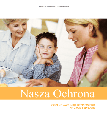 Prevoir – Vie Groupe Prevoir S.A. – Oddział w Polsce Nasza Ochrona OGÓLNE WARUNKI UBEZPIECZENIA NA ŻYCIE I ZDROWIE Nasza Ochrona OGÓLNE WARUNKI UBEZPIECZENIA NA ŻYCIE I ZDROWIE Prévoir – Vie Groupe Prévoir S.A. – Oddział w Polsce SKOROWIDZ POSTANOWIENIA OGÓLNE ...................................................................................................................3 DEFINICJE ...............................................................................................................................................3 W tym paragrafie zawarte są najważniejsze pojęcia użyte w Ogólnych Warunkach Ubezpieczenia. Wszystkie hasła pisane są wielką literą, co oznacza, że znaczenie tych słów użytych w treści OWU odpowiada dokładnie każdej definicji. PRZEDMIOT I ZAKRES UBEZPIECZENIA .............................................................................................4 Ten paragraf definiuje jakie zdarzenia będą objęte ochroną ubezpieczeniową. ZAWARCIE UMOWY UBEZPIECZENIA .................................................................................................4 Ten paragraf opisuje w jaki sposób można zawrzeć Umowę ubezpieczenia. POCZĄTEK OBOWIĄZYWANIA I CZAS TRWANIA UMOWY ................................................................5 Tutaj dowiesz się kiedy się zaczyna i ile trwa Umowa ubezpieczenia. Początek i koniec obowiązywania Umowy ubezpieczenia zostanie wskazany w Polisie ubezpieczeniowej. SKŁADKI...................................................................................................................................................5 Składki możesz opłacać miesięcznie, kwartalnie, półrocznie lub rocznie. Wypełniając wniosek o zawarcie Umowy ubezpieczenia, sam decydujesz, z jaką częstotliwością będziesz opłacać składki. Częstotliwość opłacania składki może zostać zmieniona w rocznicę umowy. USTALENIE WYSOKOŚCI ŚWIADCZEŃ (w zależności od wybranego wariantu) .................................6 WYŁĄCZENIA ODPOWIEDZIALNOŚCI ..................................................................................................6 Tutaj opisujemy szczegółowo sytuacje i zdarzenia, za które Ubezpieczyciel nie ponosi odpowiedzialności i w związku z tym, w przypadku ich zaistnienia, możemy odmówić wypłaty świadczenia. OSOBY UPRAWNIONE DO UZYSKANIA ŚWIADCZENIA .....................................................................6 WYPŁATA ŚWIADCZEŃ ..........................................................................................................................7 PRAWO ODSTĄPIENIA OD UMOWY .....................................................................................................8 ROZWIĄZANIE UMOWY UBEZPIECZENIA............................................................................................8 WYGAŚNIĘCIE UMOWY UBEZPIECZENIA ...........................................................................................9 PRAWA I OBOWIĄZKI UBEZPIECZYCIELA………………………………………………...…………………....…9 PRAWA I OBOWIĄZKI UBEZPIECZAJĄCEGO / UBEZPIECZONEGO..................................................9 W tym paragrafie zapoznasz się z prawami przysługującymi Ci z tytułu umowy oraz wynikającymi z niej obowiązkami. REKLAMACJE ..........................................................................................................................................9 W tym paragrafie dowiesz się w jaki sposób, gdzie oraz w jakim terminie możesz złożyć reklamację. Przysługuje Ci również prawo wniesienia skargi do Rzecznika Finansowego. WŁAŚCIWOŚĆ SĄDU ........................................................................................................................... 10 PRZEDAWNIENIE ................................................................................................................................. 10 PRAWO WŁAŚCIWE ............................................................................................................................ 10 OPODATKOWANIE ŚWIADCZEŃ ........................................................................................................ 10 ZAŁĄCZNIK NR 1: Szczególne Warunki Ubezpieczenia W pomarańczowych ramkach umieściliśmy objaśnienia niektórych pojęć, sformułowanych językiem prawniczym. Mamy nadzieję, że przyczynią się one do lepszego zrozumienia Ogólnych Warunków Ubezpieczenia „Nasza Ochrona” Jednocześnie informujemy, że objaśnienia są wyłącznie dodatkowym elementem i nie zastępują tekstu Ogólnych Warunków Ubezpieczenia „Nasza Ochrona”. 2 Prévoir – Vie Groupe Prévoir S.A. – Oddział w Polsce POSTANOWIENIA OGÓLNE §1 1. Niniejsze Ogólne Warunki Ubezpieczenia na życie i zdrowie „Nasza Ochrona” (dalej „OWU”) stosuje się do Umowy ubezpieczenia na życie i zdrowie „Nasza Ochrona” (dalej „Umowa ubezpieczenia” albo „Umowa”). 2. Definicje Poniższe definicje przedstawiają najważniejsze pojęcia użyte w Ogólnych Warunkach Ubezpieczenia. Wszystkie hasła pisane są wielką literą, co oznacza, że znaczenie tych słów użytych w treści OWU odpowiada dokładnie wskazanej poniżej definicji. Wyrażenia użyte w OWU, polisach oraz wszelkich innych dokumentach wystawionych przez Ubezpieczyciela w związku z Umową ubezpieczenia, zawartą na podstawie OWU oznaczają: UBEZPIECZYCIEL: Prévoir - Vie Groupe Prévoir S.A. - Oddział w Polsce, który zobowiązuje się wobec Ubezpieczającego do spełnienia świadczenia na rzecz Uposażonego albo Ubezpieczonego w przypadku zajścia zdarzenia objętego odpowiedzialnością Ubezpieczyciela, zgodnie z OWU. UBEZPIECZAJĄCY: Podmiot, który zawarł Umowę ubezpieczenia i który jest zobowiązany wobec Ubezpieczyciela do zapłaty składek ubezpieczeniowych. UBEZPIECZONY: Osoba fizyczna, której życie albo życie i zdrowie objęte są ochroną ubezp