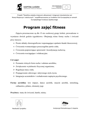 Projekt "Świetlica wiejska miejscem aktywizacji i integracji mieszkańców wsi Nowy Kłopoczyn i okolicznych " współfinansowany ze środków Unii Europejskiej w ramach Europejskiego Funduszu Społecznego Program zajęć fitness Zajęcia przeznaczone są dla 15-sto osobowej grupy kobiet, prowadzone w wymiarze dwóch godzin tygodniowo. Obejmują róŜne formy ruchu i ćwiczeń przy muzyce. • Proste układy choreograficzne wspomagające spalanie tkanki tłuszczowej; • Ćwiczenia wzmacniające poszczególne partie ciała; • Ćwiczenia poprawiające sprawność i koordynację ruchową; • Ćwiczenia rozciągające i relaksacyjne. Cel zajęć: Poznanie róŜnych form ruchu i odmian aerobiku; Zwiększenie wydolności fizycznej organizmu; Regulacja masy ciała; Propagowanie zdrowego i aktywnego stylu Ŝycia; Integracja uczestników i rozładowanie napięcia psychicznego. Formy aerobiku: low impact, dance aerobik, muscle aerobik, stretching, callanetics, pilates, elementy jogi. Przybory: maty do ćwiczeń, hantle, taśmy. Realizator projektu Instytucja Pośrednicząca 2 stopnia