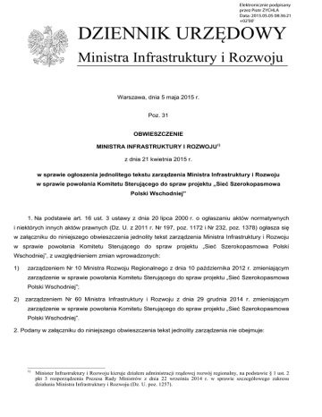 Elektronicznie podpisany przez Piotr ZYCHLA Data: 2015.05.05 08:36:21 +02'00' DZIENNIK URZĘDOWY Ministra Infrastruktury i Rozwoju Warszawa, dnia 5 maja 2015 r. Poz. 31 OBWIESZCZENIE MINISTRA INFRASTRUKTURY I ROZWOJU1) z dnia 21 kwietnia 2015 r. w sprawie ogłoszenia jednolitego tekstu zarządzenia Ministra Infrastruktury i Rozwoju w sprawie powołania Komitetu Sterującego do spraw projektu „Sieć Szerokopasmowa Polski Wschodniej” 1. Na podstawie art. 16 ust. 3 ustawy z dnia 20 lipca 2000 r. o ogłaszaniu aktów normatywnych i niektórych innych aktów prawnych (Dz. U. z 2011 r. Nr 197, poz. 1172 i Nr 232, poz. 1378) ogłasza się w załączniku do niniejszego obwieszczenia jednolity tekst zarządzenia Ministra Infrastruktury i Rozwoju w sprawie powołania Komitetu Sterującego do spraw projektu „Sieć Szerokopasmowa Polski Wschodniej”, z uwzględnieniem zmian wprowadzonych: 1) zarządzeniem Nr 10 Ministra Rozwoju Regionalnego z dnia 10 października 2012 r. zmieniającym zarządzenie w sprawie powołania Komitetu Sterującego do spraw projektu „Sieć Szerokopasmowa Polski Wschodniej”; 2) zarządzeniem Nr 60 Ministra Infrastruktury i Rozwoju z dnia 29 grudnia 2014 r. zmieniającym zarządzenie w sprawie powołania Komitetu Sterującego do spraw projektu „Sieć Szerokopasmowa Polski Wschodniej”. 2. Podany w załączniku do niniejszego obwieszczenia tekst jednolity zarządzenia nie obejmuje: 1) Minister Infrastruktury i Rozwoju kieruje działem administracji rządowej rozwój regionalny, na podstawie § 1 ust. 2 pkt 3 rozporządzenia Prezesa Rady Ministrów z dnia 22 września 2014 r. w sprawie szczegółowego zakresu działania Ministra Infrastruktury i Rozwoju (Dz. U. poz. 1257). Dziennik Urzędowy Ministra Infrastruktury i Rozwoju –2– Poz. 31 1) § 2 zarządzenia Nr 10 Ministra Rozwoju Regionalnego z dnia 10 października 2012 r. zmieniającego zarządzenie w sprawie powołania Komitetu Sterującego do spraw projektu „Sieć Szerokopasmowa Polski Wschodniej”, który stanowi: „2. Zarządzenie wchodzi w życie z dniem podpisania.”; 2) § 2 zarządzenia Nr 60 Ministra Infrastruktury i Rozwoju z dnia 29 grudnia 2014 r. zmieniającego zarządzenie w sprawie powołania Komitetu Sterującego do spraw projektu „Sieć Szerokopasmowa Polski Wschodniej” (Dz. Urz. Min. Inf. i Roz. poz. 4), który stanowi: „2. Zarządzenie wchodzi w życie z dniem następującym po dniu ogłoszenia.”. Minister Infrastruktury i Rozwoju: M. Wasiak Dziennik Urzędowy Ministra Infrastruktury i Rozwoju –3– Poz. 31 Załącznik do obwieszczenia Ministra Infrastruktury i Rozwoju z dnia 5 maja 2015 r. (poz. 31) ZARZĄDZENIE MINISTRA INFRASTRUKTURY i ROZWOJU1) w sprawie powołania Komitetu Sterującego do spraw projektu „Sieć Szerokopasmowa Polski Wschodniej” z dnia 29 grudnia 2014 r. Na podstawie art. 7 ust. 4 pkt 5 ustawy z dnia 8 sierpnia 1996 r. o Radzie Ministrów (Dz. U. z 2012 r. poz. 392) zarządza się, co następuje: § 1. 1. Powołuje się Komitet Sterujący do spraw projektu „Sieć Szerokopasmowa Polski Wschodniej”, zwany dalej „Komitetem”. 2.2) Komitet jest organem pomocniczym ministra właściwego do spraw rozwoju regionalnego i jest powołany na okres przygotowania i realizacji projektu „Sieć Szerokopasmowa Polski Wschodniej” obejmującego: 1) projekt „Sieć Szerokopasmowa Polski Wschodniej – województwo lubelskie”, 2) projekt „Sieć Szerokopasmowa Polski Wschodniej – województwo podkarpackie”, 3) projekt „Sieć Szerokopasmowa Polski Wschodniej – województwo podlaskie”, 4) projekt „Sieć Szerokopasmowa Polski Wschodniej – województwo świętokrzyskie”, 5) projekt „Sieć Szerokopasmowa Polski Wschodniej – województwo warmińsko-mazurskie” - zwanego dalej „Projektem”. § 2.3) 1. Do zadań Komitetu należy koordynacja i nadzór nad realizacją Projektu w ujęciu ponadregionalnym, w tym wydawanie rekomendacji i zaleceń dotyczących realizacji Projektu. 1) Obecnie działem administracji rządowej - rozwój regionalny kieruje Minister Infrastruktury i Rozwoju, na podstawie § 1 ust. 2 pkt 3 rozporządzenia Prezesa Rady Ministrów z dnia 22 września 2014 r. w sprawie szczegółowego zakresu działania Ministra Infrastruktury i Rozwoju (Dz. U. poz. 1257). 2) W brzmieniu ustalonym przez § 1 pkt 1 zarządzenia Nr 10 Ministra Rozwoju Regionalnego z dnia 10 października 2012 r. zmieniającego zarządzenie w sprawie powołania Komitetu Sterującego do spraw projektu „Sieć Szerokopasmowa Polski Wschodniej”, które weszło w życie z dniem 10 października 2012 r. 3) W brzmieniu ustalonym przez § 1 pkt 2 zarządzenia, o którym mowa w odnośniku 2. Dziennik Urzędowy Ministra Infrastruktury i Rozwoju –4– Poz. 31 § 3. 1. W skład Komitetu wchodzą: 1) Przewodniczący Komitetu – przedstawiciel ministra właściwego do spraw rozwoju regionalnego w randze sekretarza lub podsekretarza stanu, zwany dalej „Przewodniczącym”; 2) Wiceprzewodniczący Komitetu – wyznaczony przez Przewodniczącego członek Komitetu; 3) (uchylony)4); 4)5) Marszałek Województwa Podkarpackiego albo Członek Zarządu Województwa upoważniony do reprezentowania Województwa; 5) Marszałek Województwa Podlaskiego albo Członek Zarządu Województwa upoważniony do reprezentowania Województwa; 6) Marszałek Województwa Lubelskiego albo Członek Zarządu Województwa upoważniony do reprezentowania Województwa; 7) Marszałek Województwa Świętokrzyskiego albo Członek Zarządu Województwa upoważniony do reprezentowania Województwa; 8) Marszałek Województwa Warmińsko-Mazurskiego albo Członek Zarządu Województwa upoważniony do reprezentowania Województwa; 9)6) Prezes albo Zastępca Prezesa Polskiej Agencji Rozwoju Przedsiębiorczości; 10) Dyrektor albo Zastępca Dyrektora Departamentu Programów Ponadregionalnych w Ministerstwie Infrastruktury i Rozwoju. 2. (uchylony)7). 3. (uchylony)8). 4. Przewodniczący może zapraszać do