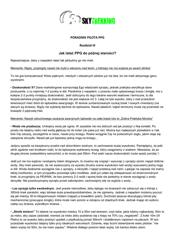 SKYTREKKING PORADNIK PILOTA PPG Rozdział III Jak latać PPG do późnej starości? Najważniejsze, żeby z napędem latać tak jakbyśmy go nie mieli. Memento: Nigdy, przenigdy nawet nie myśl o wleceniu nad teren, z którego nie ma wyjścia po awarii silnika! To nie gra komputerowa! Wielu pięknych, młodych i odważnych pilotów już nie lata, bo nie mieli aktywnego genu wyobraźni. • Doskonałość 9? Dane marketingowe wzmacniają Ego właścicieli sprzętu, jednak praktyka weryfikuje dane producenta, o co najmniej 1-2 punkty w dół. Paralotnia z napędem, z powodu mało opływowego kosza i śmigła, ma o kolejne 2-3 punkty mniejszą doskonałość. Jeśli doliczymy do tego lokalne warunki wiatrowe i termiczne, to dla bezpieczeństwa przyjmijmy, że doskonałość nie jest większa niż 3. Lataj na tyle wysoko, żeby z nad przeszkód terenowych mieć dolot do lądowiska awaryjnego. W terenie zurbanizowanym szukaj boisk i nowych cmentarzy (na starych są drzewa). Nigdy nie wybieraj dachów do lądowania. Nawet płaskich, bąbel termiczny może cię przenieść na krawędź 3 piętrowej Hali. Memento: Nawyk odruchowego szukania awaryjnych lądowisk na całej trasie lotu to „Dobra Praktyka Morska” • Woda nie przebacza. Unikajmy wody jak ognia. W zasadzie nie ma dobrych rad jak przeżyć z Nią kontakt. Po prostu nie latajmy nisko nad wodą głębszą niż do kolan (do pasa już nie). Można być najlepszym pływakiem a i tak linki Cię uduszą, szczególnie w rzece, nawet przy brzegu. Rzeka wciągnie Cię na podwodnym żaglu, jakim staje się zatopione skrzydło. Nawet jak już będziesz jedną nogą na brzegu… Jedyny sposób na bezpieczny przelot nad zbiornikiem wodnym, to zachowanie dużej wysokości. Pamiętajmy, że jeśli silnik zgaśnie nad środkiem rzeki, to do lądowania wybieramy brzeg, który osiągniemy z wiatrem. Nieważne, że po drugiej stronie zostawiliśmy samochód, a do mostu jest 50km. Pod wiatr nasza doskonałość może spaść poniżej 1. Jeśli już nie ma wyjścia i wodujemy lotem ślizgowym, to musimy się rozpiąć i wysunąć z uprzęży zanim napęd dotknie wody. Aby mieć pewność, że nie wyskoczymy za wysoko (trudna ocena wysokości nad wodą) wysuwamy jedną nogę w dół. Woda dosłownie wyciągnie nas z uprzęży, a skrzydło i napęd przelecą nad nami. Lądując na zapasie nie mamy takiej możliwości, w tym przypadku pozostaje tylko modlitwa. Jeśli już udało się odseparować od śmiercionośnych linek, to przyjmijmy za PEWNIK, że bez pomocy 2-3 osób i sporej łodzi nie jesteśmy w stanie wyciągnąć z wody skrzydła. Nie powstrzymujmy sprzętu przed zatonięciem, zachowajmy siły na wyjście z wody… • Las sprzyja tylko swobodnym. Jest prawie niemożliwe, żeby lądując na drzewach nie zahaczyć się o którąś z 300mb linek paralotni, więc istnieje duże prawdopodobieństwo, że nie zginiemy. Jednak z napędem możemy poczuć się jak miedzy 30-to kilogramowym młotem (napęd) a kowadłem (pień). Dochodzi jeszcze ekscytujący klimat piły mechanicznej (pracujące śmigło), które może nam pomóc w odcięciu od zbędnych linek. Jednak mając do wyboru rzekę czy drzewa, wybrałbym drzewa… • „Strefa śmierci” To latanie na wysokości miedzy 10 a 50m nad terenem, czyli takie, jakie lubimy najbardziej. 50m to za nisko, aby zapas zadziałał, również za nisko żeby pozbierać się z klapy na 70% czy „negatywki”. Z kolei 10m (III Pietro) to za wysoko żeby przeżyć upadek z prędkością ponad 30km/h i dodatkowym ciężarem na plecach. W tym przedziale wysokości latajmy tylko przy idealnych warunkach. Dziwnie, więc brzmi stwierdzenie wielu pilotów: ”nie latam wyżej niż 50m, bo nie mam zapasu”. Właśnie dlatego powinni latać wyżej, lub bardzo blisko ziemi. • Wiatr, przyjaciel rozważnych. Pamiętajmy, że zasięg rotorów od przeszkód terenowych rośnie do kwadratu z prędkością wiatru, a turbulencja sięga również wysoko NAD przeszkodami. Nawet niewinna 10-cio metrowa brzózka może przy 6m/s dać turbulencję sięgającą kilkudziesięciu metrów. Slalom miedzy drzewami można uprawiać tylko przy kompletnym bezwietrzu. • Lataj nisko i powoli pouczała mamusia pewnego kadeta z Dęblina. W PPG najbardziej uzależniającym narkotykiem jest latanie niskie, czyli lot „koszący”. Roztrącanie stopą „łanów zbóż”, wzniecanie tumanów kurzu w bruzdach po wykopkach, płoszenie zajęcy… To coś, co nas kręci do czasu, gdy nie poczujemy dziwnego ukłucia w lędźwiach leżąc na plecach na pracującym jeszcze silniku. A co to? A to „dobry wieczór” powiedziała nam niewidoczna linia (oby) niskiego napięcia, której nie zauważyliśmy na tle ciemnej ściany lasu. Dlatego „kosiaczymy” tylko nad terenem, który znamy, lub który wstępnie oblecieliśmy na bezpiecznej wysokości. NIGDY o zmierzchu. No i nie polecam „kosiaczyć” z wiatrem, ale to wie każdy, komu kiedykolwiek zgasł silnik w locie… • Z kolegami raźniej, czyli latanie w grupie. Wbrew pozorom BARDZO trudne i zaskakująco niebezpieczne. Praktycznie pomijane w szkoleniu. Trzeba na ziemi omówić cel lotu, sposób porozumiewania i szyk, oraz sposób rozejścia. W szyku musimy operować wszystkimi narzędziami (trymery, speed, gaz, sterówki), aby się utrzymać pośród paralotni o różnej prędkości. Robiąc zdjęcia i myśląc o niebieskich migdałach, możemy łatwo „zajechać’ w kolegę, który będąc w środku nie będzie miał gdzie uciekać. Najlepiej jest ustawić szyk z separacją i w pionie i poziomie tak, aby piloci mogli się widzieć. • Klapa w wieczornym „masełku”? Uskok wiatru przy bezwietrzu? Awaria skrzydła? Nie, po prostu wpadłeś we własne lub kolegi strugi zaśmigłowe. Ekstremalnie niebezpieczne będąc nisko. Łatwo w nie wpaść przy szybko następujących startach, lub lotach równoległych z zakrętem przed przeszkodą. Będąc wysoko można się łatwo odseparować w p