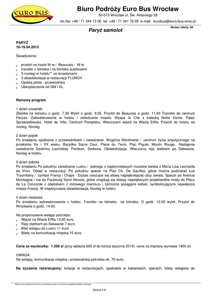 Biuro Podróży Euro Bus Wrocław 50-073 Wrocław ul. Św. Antoniego 28 tel./fax +48 / 71 344 13 00 tel. +48 / 71 341 76 05 e-mail: [email protected] Paryż samolot Numer oferty: 94 PARYŻ 16-19.04.2015 Świadczenia: • przelot na trasie W-w – Beauvais – W-w • transfer z lotniska i na lotnisko autobusem • 3 noclegi w hotelu** ze śniadaniami • 2 obiadokolacje w restauracji FLUNCH • Opieka pilota - przewodnika • Ubezpieczenie od NW i KL Ramowy program 1 dzień czwartek Zbiórka na lotnisku o godz. 7.30 Wylot o godz. 9.35. Przylot do Beauvais o godz. 11.40 Transfer do centrum Paryża. Zakwaterowanie w hotelu i zwiedzanie miasta: Wyspa la Cite z katedrą Notre Dame, Pałac Sprawiedliwości, Hotel de Ville, Centrum Pompidou. Wieczorem wjazd na Wieżę Eiffla. Powrót do hotelu na nocleg. Nocleg. 2 dzień piątek Po śniadaniu spotkanie z przewodnikiem i zwiedzanie: Wzgórze Montmarte – centrum życia artystycznego na przełomie Xix i XX wieku, Bazylika Sacre Ceur, Place du Terre, Plac Pigule, Moulin Rouge.. Następnie zwiedzanie Dzielnicy Łacińskiej: Panteon, Sorbona. Obiadokolacja. Wieczorny rejs statkiem po Sekwanie. Nocleg w hotelu. 3 dzień sobota Po śniadaniu Po południu zwiedzanie Luwru – jednego z najsłynniejszych muzeów świata z Mona Lisą Leonarda da Vinci. Obiad w restauracji. Po południu spacer na Plac Ch. De Gaullea, gdzie można podziwiać Łuk Tryumfalny – symbol Francji i Chaps - Elyses cieszące się sławą najpiękniejszej ulicy świata. Spacer po Avenue Montaigne i rue du Faubourg Saint Honore, gdzie znajdują się sklepy największych projektantów mody do Placu de La Concorde z obeliskiem z różowego marmuru i ośmioma posągami kobiet, symbolizującymi największe miasta Francji. W międzyczasie obiadokolacja. Nocleg w hotelu. 4 dzień niedziela Po śniadaniu wykwaterowanie z hotelu. Transfer na lotnisko. na lotnisko. O godz. 12.05 wylot. Przylot do Wrocławia o godz. 14.00. Na proponowane wstępy potrzeba: • Wjazd na Wieżę Eiffla 13,50 euro • Rejs statkiem po Sekwanie 7 euro • Bilet wstępu do Luwru 11 euro • Bilety na komunikację miejską 15 euro Cena za wycieczkę: 1.550 zł (przy wpłacie 600 zł do końca stycznia 2015r. cena za imprezę wyniesie 1450 zł) UWAGA: Na wstępy, komunikacje miejską i przewodnika potrzeba ok. 70 euro. Na życzenie rezerwujemy: kolacje w restauracjach, spektakle w kabaretach, operach, bilety wstępów do Wydruk oraz zawarte w nim ceny nie stanowią oferty w rozumieniu przepisów kodeksu cywilnego. Strona 1/2 Biuro Podróży Euro Bus Wrocław 50-073 Wrocław ul. Św. Antoniego 28 tel./fax +48 / 71 344 13 00 tel. +48 / 71 341 76 05 e-mail: [email protected] zwiedzanych obiektów, bilety na przejazdy komunikacją miejską. Wydruk oraz zawarte w nim ceny nie stanowią oferty w rozumieniu przepisów kodeksu cywilnego. Strona 2/2