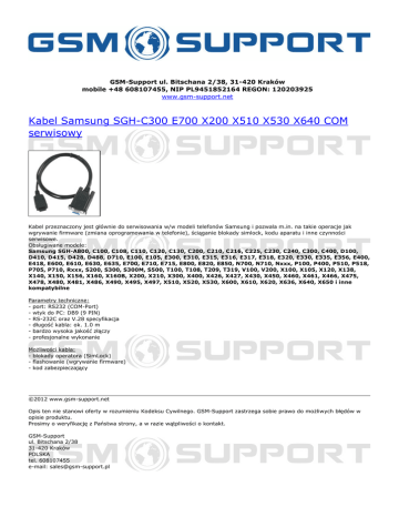 GSM-Support ul. Bitschana 2/38, 31-420 Kraków mobile +48 608107455, NIP PL9451852164 REGON: 120203925 www.gsm-support.net Kabel Samsung SGH-C300 E700 X200 X510 X530 X640 COM serwisowy Kabel przeznaczony jest głównie do serwisowania w/w modeli telefonów Samsung i pozwala m.in. na takie operacje jak wgrywanie firmware (zmiana oprogramowania w telefonie), ściąganie blokady simlock, kodu aparatu i inne czynności serwisowe. Obsługiwane modele: Samsung SGH-A800, C100, C108, C110, C120, C130, C200, C210, C216, C225, C230, C240, C300, C400, D100, D410, D415, D428, D488, D710, E100, E105, E300, E310, E315, E316, E317, E318, E320, E330, E335, E356, E400, E418, E600, E610, E630, E635, E700, E710, E715, E800, E820, E850, N700, N710, Nxxx, P100, P400, P510, P518, P705, P710, Rxxx, S200, S300, S300M, S500, T100, T108, T209, T319, V100, V200, X100, X105, X120, X138, X140, X150, X156, X160, X160B, X200, X210, X300, X400, X426, X427, X430, X450, X460, X461, X466, X475, X478, X480, X481, X486, X490, X495, X497, X510, X520, X530, X600, X610, X620, X636, X640, X650 i inne kompatybilne Parametry techniczne: - port: RS232 (COM-Port) - wtyk do PC: DB9 (9 PIN) - RS-232C oraz V.28 specyfikacja - długość kabla: ok. 1.0 m - bardzo wysoka jakość złączy - profesjonalne wykonanie Możliwości kabla: - blokady operatora (SimLock) - flashowanie (wgrywanie firmware) - kod zabezpieczający ©2012 www.gsm-support.net Opis ten nie stanowi oferty w rozumieniu Kodeksu Cywilnego. GSM-Support zastrzega sobie prawo do możliwych błędów w opisie produktu. Prosimy o weryfikację z Państwa strony, a w razie wątpliwości o kontakt. GSM-Support ul. Bitschana 2/38 31-420 Kraków POLSKA tel. 608107455 e-mail: [email protected] Powered by TCPDF (www.tcpdf.org)