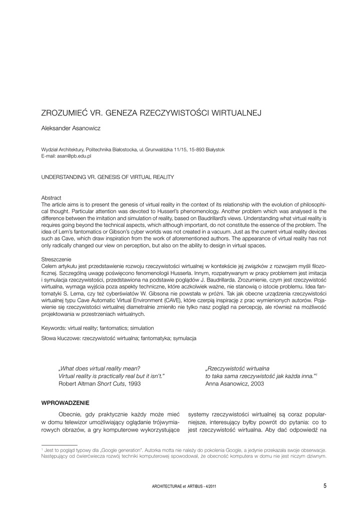ZROZUMIEĆ VR. GENEZA RZECZYWISTOŚCI WIRTUALNEJ Aleksander Asanowicz Wydział Architektury, Politechnika Białostocka, ul. Grunwaldzka 11/15, 15-893 Białystok E-mail: [email protected] UNDERSTANDING VR. GENESIS OF VIRTUAL REALITY Abstract The article aims is to present the genesis of virtual reality in the context of its relationship with the evolution of philosophical thought. Particular attention was devoted to Husserl’s phenomenology. Another problem which was analysed is the difference between the imitation and simulation of reality, based on Baudrillard’s views. Understanding what virtual reality is requires going beyond the technical aspects, which although important, do not constitute the essence of the problem. The idea of Lem’s fantomatics or Gibson’s cyber worlds was not created in a vacuum. Just as the current virtual reality devices such as Cave, which draw inspiration from the work of aforementioned authors. The appearance of virtual reality has not only radically changed our view on perception, but also on the ability to design in virtual spaces. Streszczenie Celem artykułu jest przedstawienie rozwoju rzeczywistości wirtualnej w kontekście jej związków z rozwojem myśli filozoficznej. Szczególną uwagę poświęcono fenomenologii Husserla. Innym, rozpatrywanym w pracy problemem jest imitacja i symulacja rzeczywistości, przedstawiona na podstawie poglądów J. Baudrillarda. Zrozumienie, czym jest rzeczywistość wirtualna, wymaga wyjścia poza aspekty techniczne, które aczkolwiek ważne, nie stanowią o istocie problemu. Idea fantomatyki S. Lema, czy też cyberświatów W. Gibsona nie powstała w próżni. Tak jak obecne urządzenia rzeczywistości wirtualnej typu Cave Automatic Virtual Environment (CAVE), które czerpią inspirację z prac wymienionych autorów. Pojawienie się rzeczywistości wirtualnej diametralnie zmieniło nie tylko nasz pogląd na percepcję, ale również na możliwość projektowania w przestrzeniach wirtualnych. Keywords: virtual reality; fantomatics; simulation Słowa kluczowe: rzeczywistość wirtualna; fantomatyka; symulacja „What does virtual reality mean? Virtual reality is practically real but it isn’t.” Robert Altman Short Cuts, 1993 „Rzeczywistość wirtualna to taka sama rzeczywistość jak każda inna.”1 Anna Asanowicz, 2003 WPROWADZENIE Obecnie, gdy praktycznie każdy może mieć w domu telewizor umożliwiający oglądanie trójwymiarowych obrazów, a gry komputerowe wykorzystujące systemy rzeczywistości wirtualnej są coraz popularniejsze, interesujący byłby powrót do pytania: co to jest rzeczywistość wirtualna. Aby dać odpowiedź na 1 Jest to pogląd typowy dla „Google generation”. Autorka motta nie należy do pokolenia Google, a jedynie przekazała swoje obserwacje. Następujący od ćwierćwiecza rozwój techniki komputerowej spowodował, że obecność komputera w domu nie jest niczym dziwnym. ARCHITECTURAE et ARTIBUS - 4/2011 5 A. ASANOWICZ to pytanie, należy rozpatrzyć nie tylko ewolucję naszego środowiska technologicznego, ale również aspekt ogólnokulturalny, zawierający problemy filozofii, literatury i filmu. Dla zrozumienia genezy rzeczywistości wirtualnej zasadnicze znaczenie ma odpowiedź na sformułowane przez Kanta pytanie – „Co mogę wiedzieć?”. Pytanie to, od którego zaczynają się wszystkie procesy poznawcze, możemy sformułować również w sposób następujący: czym jest świat, w którym żyjemy? Kant, definiując filozofię, jako jej główne zadanie widział realizację ludzkiej ciekawości świata, która przekształciła się w intelektualną potrzebę bezgranicznego poszerzenia ludzkiej wiedzy o świecie, syntezę wszelkiej dostępnej człowiekowi wiedzy. Myśl filozoficzna zawsze interesowała się możliwością wyjścia w nieznane, nieosiągalne dla ludzkiego doświadczenia obszary przestrzeni i czasu. Świadczy o tym rozwój filozofii, poczynając od starożytnej Grecji, po fenomenologię E. Husserla i filozofię techniki M. Heideggera i hermeneutyki G. Gadamera. 1. FILOZOFIA Poszerzając wiedzę, umysł człowieka pojmuje świat spekulatywnie, w sposób, który nie wynika, a nawet nie może wynikać z żadnego doświadczenia. Nie ulega wątpliwości, że doświadczenie nie daje możliwości zrozumienia świata jako całościowej, nie mającej czasoprzestrzennych granic i niezależnej od człowieka obiektywnej rzeczywistości. Fakt ten nieustannie powinien być brany pod uwagę. Ponieważ doświadczenie nie daje takiej wiedzy, filozofia, jako uogólniająca dyscyplina naukowa, musi podjąć to trudne zadanie. Postawione na początku tego artykułu pytanie implikuje dwa kolejne, odnoszące się do granic ludzkiego poznania: W jaki sposób formułuje się nasza wiedza o świecie, na podstawie jakich zdolności poznawczych i przy użyciu jakich metod? Jak upewnić się, że rezultat naszych działań poznawczych - to wiedza prawdziwa, a nie złudzenie? Są to kwestie, w których stale istnieje charakterystyczna dla filozofii zależność „świat - człowiek”. W poszukiwaniu odpowiedzi na pytanie o poznawalność świata istnieją dwa przeciwstawne podejścia: poznawczemu optymizmowi sprzeciwia się sceptycyzm i agnostycyzm. W różnych okresach rozwoju ludzkości były one rozpatrywane różnie. Analizując tylko trzy główne okresy starożytnej filozofii greckiej, znajdujemy wiele sprzecznych poglądów. Do V wieku p.n.e. uważano, że poznanie jest równoważne postrzeganiu (rzeczy można poznać tylko poprzez ich postrzeganie). Ale już Platon (427-347 p.n.e.), odpowiadając na pytanie – „Czym jest poznanie?”, powiedział, że rzeczy możemy widzieć, nie myśląc o nich, a o ideach możemy myśleć, ale nie możemy ich zobaczyć. Istnieją dwa typy bytów – idee i rzeczy i dwa odpowiadające im typy poznania – umysłowe i zmysłowe. Platon uważał, że proces poznania może ograniczyć się tylko do procesów umysłowych. Z kolei stoi