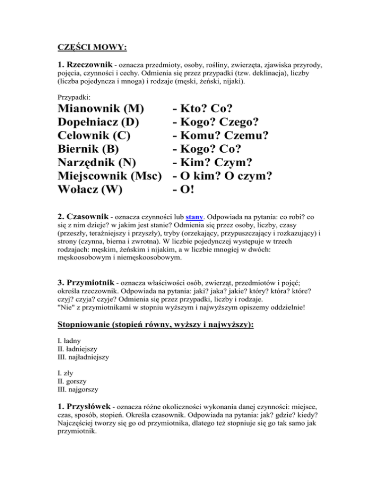 CZĘŚCI MOWY: 1. Rzeczownik - oznacza przedmioty, osoby, rośliny, zwierzęta, zjawiska przyrody, pojęcia, czynności i cechy. Odmienia się przez przypadki (tzw. deklinacja), liczby (liczba pojedyncza i mnoga) i rodzaje (męski, Ŝeński, nijaki). Przypadki: Mianownik (M) Dopełniacz (D) Celownik (C) Biernik (B) Narzędnik (N) Miejscownik (Msc) Wołacz (W) - Kto? Co? - Kogo? Czego? - Komu? Czemu? - Kogo? Co? - Kim? Czym? - O kim? O czym? - O! 2. Czasownik - oznacza czynności lub stany. Odpowiada na pytania: co robi? co się z nim dzieje? w jakim jest stanie? Odmienia się przez osoby, liczby, czasy (przeszły, teraźniejszy i przyszły), tryby (orzekający, przypuszczający i rozkazujący) i strony (czynna, bierna i zwrotna). W liczbie pojedynczej występuje w trzech rodzajach: męskim, Ŝeńskim i nijakim, a w liczbie mnogiej w dwóch: męskoosobowym i niemęskoosobowym. 3. Przymiotnik - oznacza właściwości osób, zwierząt, przedmiotów i pojęć; określa rzeczownik. Odpowiada na pytania: jaki? jaka? jakie? który? która? które? czyj? czyja? czyje? Odmienia się przez przypadki, liczby i rodzaje. "Nie" z przymiotnikami w stopniu wyŜszym i najwyŜszym opiszemy oddzielnie! Stopniowanie (stopień równy, wyŜszy i najwyŜszy): I. ładny II. ładniejszy III. najładniejszy I. zły II. gorszy III. najgorszy 1. Przysłówek - oznacza róŜne okoliczności wykonania danej czynności: miejsce, czas, sposób, stopień. Określa czasownik. Odpowiada na pytania: jak? gdzie? kiedy? Najczęściej tworzy się go od przymiotnika, dlatego teŜ stopniuje się go tak samo jak przymiotnik. 2. Przyimek - nie jest samodzielną częścią mowy. Występuje głównie z rzeczownikiem i razem tworzą całość znaczeniową (wyraŜenie przyimkowe) - np. na podstawie, na wycieczkę, pod względem. Przyimki dzielimy na proste (bez, do, z, za, o, w, dla, przed, pod, między, ku, po, przy, na, mimo, u, nad itd.) i złoŜone (ponad, pomiędzy, oprócz, spoza, obok, wbrew, zza, poprzez, pośród, pomimo itd.). Przyimki złoŜone z przyimków z prostych zawsze piszemy razem. CZĘŚCI ZDANIA: Podmiot z orzeczeniem tworzą w zdaniu związek główny. Pozostałe części mowy tworzą związki poboczne. Podmiot - nadrzędna część zdania. Jest wykonawcą czynności. Odpowiada na pytania; kto? co? WyróŜniamy następujące rodzaje podmiotów: - gramatyczny - wyraŜony w mianowniku, np. Malarz namalował piękny obraz. - logiczny - wyraŜony w dopełniaczu, np. Nie ma sukcesów bez cięŜkiej pracy. - domyślny - np. Pojechaliśmy do Krakowa. [my]; Pójdę do sklepu po zakupy. [ja] - szeregowy - np. Tomek, Łukasz i Jakub grają w piłkę noŜną. Orzeczenie - określa czynności lub stany osób albo rzeczy. WyróŜniamy dwa typy orzeczeń: - czasownikowe - wyraŜone osobową formą czasownika, np. Jutro pojedziemy do lasu na grzyby. Deszcz padał przez cały dzień. - imienne - złoŜone z łącznika (osobowa forma czasowników: być, stać się, zostać) i orzecznika (innej części mowy), np. Jarek będzie pierwszy. Ta ksiąŜka jest interesująca. Ania została aktorką. Ten dom jest z drewna. Przydawka - określa rzeczownik. Odpowiada na pytania: jaki? jaka? jakie? który? która? które? czyj? czyja? czyje? ile? czego? Z czego? Dopełnienie - określa czasownik. Odpowiada na pytania: kogo? co? czego? komu? czemu? kim? czym? itd. - odpowiada na pytania przypadków oprócz mianownika. Dopełnienie moŜe być bliŜsze lub dalsze. Okolicznik - określa czasownik. WyróŜniamy okoliczniki: miejsca, czasu, celu, przyczyny, sposobu, przyzwolenia, warunku.