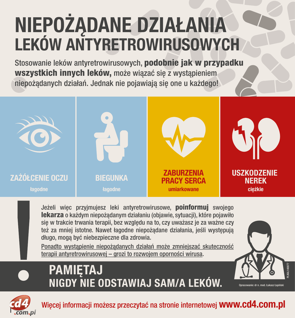 NIEPOŻĄDANE DZIAŁANIA LEKÓW ANTYRETROWIRUSOWYCH Stosowanie leków antyretrowirusowych, podobnie jak w przypadku wszystkich innych leków, może wiązać się z wystąpieniem niepożądanych działań. Jednak nie pojawiają się one u każdego! ZAŻÓŁCENIE OCZU BIEGUNKA ZABURZENIA PRACY SERCA USZKODZENIE NEREK łagodne łagodne umiarkowane ciężkie Jeżeli więc przyjmujesz leki antyretrowirusowe, poinformuj swojego lekarza o każdym niepożądanym działaniu (objawie, sytuacji), które pojawiło się w trakcie trwania terapii, bez względu na to, czy uważasz je za ważne czy też za mniej istotne. Nawet łagodne niepożądane działania, jeśli występują długo, mogą być niebezpieczne dla zdrowia. Ponadto wystąpienie niepożądanych działań może zmniejszać skuteczność terapii antyretrowirusowej – grozi to rozwojem oporności wirusa. NIGDY NIE ODSTAWIAJ SAM/A LEKÓW. PLKAL140077 PAMIĘTAJ Opracowanie: dr n. med. Łukasz Łapiński Więcej informacji możesz przeczytać na stronie internetowej www.cd4.com.pl DROGI ZAKAŻENIA HIV I OBJAWY AIDS Ludzki wirus niedoboru odporności (HIV ) prowadzi do rozwoju zespołu nabytego niedoboru odporności (AIDS). Objawy: Drogi zakażenia HIV: zapalenie mózgu i opon mózgowo-rdzeniowych powiększenie węzłów chłonnych trwające dłużej niż 1 miesiąc kontakty seksualne bez prezerwatywy, z osobą zakażoną HIV wspólne używanie przyborów (w tym igieł) do tatuażu lub piercingu przewlekłe/nawracające zapalenie płuc nawracająca grzybica jamy ustnej, przełyku, żołądka biegunka trwająca dłużej niż 1 miesiąc Mechanizm działania: 1. HIV wnika do organizmu człowieka. 2. Osłabienie układu immunologicznego, głównie komórek niszczących mikroorganizmy i komórki nowotworowe (limfocyty T i inne komórki zawierające receptor CD4). 3. Organizm staje się niezdolny do zwalczania zakażeń i nowotworów (rozwijają się groźne choroby oportunistyczne). AIDS JEST KOŃCOWYM ETAPEM ROZWOJU ZAKAŻENIA HIV, W KTÓRYM POJAWIAJĄ SIĘ: zakażenia oportunistyczne (np. gruźlica płuc i innych narządów, zapalenie płuc, posocznica) nowotwory związane z AIDS (np. mięsak Kaposiego, chłoniak mózgu, inwazyjny rak szyjki macicy) choroby ośrodkowego i obwodowego układu nerwowego wyniszczenie organizmu wspólne używanie strzykawek i/lub igieł Drogi niestwierdzone dotychczas w żadnym przypadku w Polsce: wspólne używanie szczoteczek do zębów, maszynek do golenia i innych przyrządów, przy udziale których doszło do skaleczenia i na których zabiegi chirurgiczne, stomatologiczne, a także transfuzje krwi, jeśli do organizmu dostanie się WIDOCZNA JEST GOŁYM OKIEM ŚWIEŻA KREW OSOBY HIV(+) ŚWIEŻA KREW OSOBY HIV(+) W ILOŚCI WIDOCZNEJ GOŁYM OKIEM ROZPOZNANIE PKD Bezpłatne i anonimowe badanie wykrywające przeciwciała anty-HIV oraz antygen p24 można wykonać w Punktach Konsultacyjno-Diagnostycznych (aktualna lista PKD znajduje się na stronie www.aids.gov.pl). Jest to jedyna możliwość rozpoznania/ wykluczenia zakażenia HIV. Organizm człowieka rozpoczyna produkcję przeciwciał anty-HIV 1/2 po od 4 tygodni do 12 tygodni od zakażenia, natomiast antygen p24 pojawia się po 2 tygodniach od dostania się HIV do organizmu. Badanie diagnostyczne jest w stanie wykryć zakażenie dopiero po pojawieniu się we krwi wystarczającej ilości przeciwciał lub antygenu p24. Czas od zakażenia do pojawienia się przeciwciał/antygenu p24 określa się jako „okienko diagnostyczne”. Jednak pamiętaj, że aby wykluczyć zakażenie HIV, musi upłynąć minimum 12 tygodni od sytuacji ryzykownej – dopiero po tym okresie wynik ujemny jest całkowicie pewny. nawracający i rozległy półpasiec gorączka trwająca dłużej niż 1 miesiąc utrata masy ciała o minimum 10% posocznica (sepsa) przewlekłe lub nawracające zakażenia wirusami, bakteriami lub pierwotniakami LECZENIE Dotychczas nie dysponujemy lekami, których stosowanie potrafiłoby w pełni usunąć wirusa z organizmu. Skuteczność aktualnych schematów leczenia jest jednak na tyle duża, że długość, a nawet jakość życia osób HIV(+), które w odpowiednim momencie rozpoczną właściwe leczenie, nie różnią się znacznie od osób niezakażonych. PLKAL140077 zakażenie dziecka przez matkę HIV(+) w czasie ciąży, porodu lub karmienia piersią Opracowanie: dr n. med. Łukasz Łapiński Więcej informacji możesz przeczytać na stronie internetowej www.cd4.com.pl