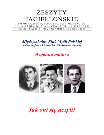 ZESZYTY JAGIELLOŃSKIE PISMO UCZNIÓW, NAUCZYCIELI I PRZYJACIÓŁ LO im. KRÓLA WŁADYSŁAWA JAGIEŁŁY W PŁOCKU NR 100 • MAJ 2015 • PISMO UKAZUJE SIĘ OD ROKU 2000 Międzyszkolny Klub Myśli Polskiej w Gimnazjum i Liceum im. Władysława Jagiełły Wojenna matura Jak oni się uczyli! Międzyszkolny Klub Myśli Polskiej w Gimnazjum i Liceum Ogólnokształcącym z Oddziałami Dwujęzycznymi im Władysława Jagiełły w Płocku Zgromadzone w tym numerze „Zeszytów” teksty ukazują, jak młodzież czasu wojny, kiedy nie było polskiej szkoły, przygotowywała się do egzaminu maturalnego, jak się intensywnie uczyła i jak zdawała wojenną maturę, nierzadko po dwa razy, gdyż często wyniki na skutek wojny ginęły, a czasami dlatego, ponieważ dwie matury – humanistyczną i przyrodniczą – nakazywała zdawać młodym… po prostu ambicja. Na okładce: K. K. Baczyński, Tadeusz Borowski i Tadeusz Gajcy. Zeszyty Jagiellońskie. Pismo Uczniów, Nauczycieli i Przyjaciół Liceum Ogólnokształcącego im. Króla Władysława Jagiełły w Płocku Redakcja: ul. 3 Maja 4, 09 – 402 Płock; ht t p: /w w w .ja g i ello n ka . plo c k. pl ; (024) 364-59-20 [email protected]; Opiekun merytoryczny projektu: Tomasz Zbrzezny. Opiekun zespołu: Wiesław Kopeć, [email protected] Zespół redakcyjny: członkowie Międzyszkolnego Klubu Myśli Polskiej. 2 Nadzieja Drucka [Nadzieja Drucka /Nadzieja O'Brien de Lacy księżniczka Drucka/, 1898-1986, polska pisarka, tłumaczka pochodzenia rosyjskiego. Urodziła się w rodzinie rosyjskiej w Warszawie na terenie Królestwa Polskiego jako córka Marii z Safonowiczów i Sergiusza księcia Druckiego, carskiego generała i profesora Wojskowej Akademii Prawnej. Wyszła za mąż za Polaka. Debiutowała jako pisarka w XX-leciu międzywojennym. W czasie wojny zaangażowana w tajne nauczanie. Doświadczenia z wojennej działalności edukacyjnej opisała w powieści Niedaleki brzeg oraz w książce Szkoła w podziemiu. Z dziejów polskiego tajnego nauczania w latach okupacji hitlerowskiej, Warszawa 1973. Autorka książek biograficznych o Juliuszu Vernie („Czarodziej z Nantes”), Mozarcie („Droga do sławy”), Michaile Glince („Michel”) oraz o Mariuszu Zaruskim, pionierze polskiego żeglarstwa i wychowania morskiego („Kurs na Słońce”). Przełożyła na język polski m.in. „Obłomowa” Iwana Gonczarowa.] Wojenne matury [Fragment powieści Niedaleki brzeg; Przedruk z antologii Pisarze o szkole, Warszawa 1980.] Luty czterdziestego pierwszego roku był bardzo zimny. Zofia trzęsąc się w swej jesionce podszytej wiatrem prawie biegiem zdążała od tramwaju do szkoły. Poprzedniego dnia lekcje miała na kompletach w Śródmieściu. W szkole na Pradze nie była. Hiobowa wieść spotkała ją na progu nauczycielskiego pokoju. Już przedtem zauważyła gromadę dziewczynek stłoczonych w korytarzu. Podniecone głosy, wypieki na bladych zwykle twarzach. Niemcy zabierają im lokal! W ciągu 48 godzin ma się wynieść meble, cały sprzęt, dokumenty, pomoce szkolne. Dokąd? To Niemców nie obchodzi. Budynek ma być opróżniony, zajmie go jakiś oddział wojska. Od wczoraj dyrektor molestuje polskich inspektorów w Schulamcie, był zresztą i u kierownika Biura Schultza, ale nic, absolutnie nic nie wskórał. Młodsze klasy rozparceluje się w dwóch szkołach prawobrzeżnej Warszawy, tamtejsi dyrektorzy zgadzają się powiększyć klasy i zorganizować południowe lekcje. Starszym stworzy się komplety. Nauki nie wolno przerwać. Ale co zrobić z ławkami, tablicami, papierami? Całym dobytkiem szkolnym, gromadzonym od lat? Jeśli nie wykona się rozkazu w terminie, Niemcy usuną cały inwentarz na ulicę, nie fatygując się wynoszeniem z górnych pięter, tylko wyrzucając go przez okna, jak już nieraz miało to miejsce w grudniu trzydziestego dziewiątego roku. Małecki już znalazł częściowo radę, przynajmniej doraźną. Ma znajomego właściciela składu drzewa. Właśnie przybiegł od niego i referuje dyrektorowi: 3 — Zgadza się mój Kruczek umieścić ławki u siebie w szopie i nawet wóz da z furmanem, będzie tu za pół godziny. Na razie dobre i to. Potem zastanowimy się, która ze szkół przyjmie nasz dobytek. Starsze dziewczynki zaraz zaczną wynosić pulpity. — Proszę pani — zgłasza się Rózia Wyporek — mój brat ma rikszę, pobiegnę po niego. Przyda się, prawda? Może książki i drobne rzeczy wozić. — Ja sprowadzę tatusia, w sklepie zostanie moja starsza siostra — proponuje inna. Przychodzi jeszcze kilku ojców. Nie wiadomo, skąd dowiedzieli się, zgłaszają pomoc. Ktoś musi kierować całą akcją. Drągal, nauczyciel od fizyki, obejmuje dowództwo. Bibliotekę szkolną, z niedozwolonymi podręcznikami, ładuje się na rikszę Wyporka, na wierzch dla niepoznaki kładzie się stolik i jedno krzesło, z boku sadowi się Zofia Strazdas i brat Rózi pedałuje co sił, by zdążyć obrócić kilka razy. Zofia wiezie książki do siebie. Nie bardzo wie, gdzie je umieścić w ciasnym mieszkaniu, na razie składa to na podłodze w sypialni. Potem będzie wszystkie segregować i wtłaczać do przepełnionej już szafy z własnymi książkami, a resztę gdziekolwiek bądź. Wraca rikszą do szkoły. Jacyś nieznajomi mężczyźni, chyba ojcowie uczennic, wynoszą już ławki, stoły, tablice. Kruczek sam furmanuje, żeby nic nie zginęło i nie popsuło się. — Pan tu pewnie ma córkę? — pyta Zofia. — Ale, paniusiu, moje to już dorosłe, córka za mężem, syn był w wojsku, poszedł do niewoli, pisze ze stalagu. Ja tak po dobrej woli. Oni, psiakrew, z dziećmi chcą wojować, chcą, żeby to ciemne było jak te dzikusy. Jak posłyszałem od pana Małeckiego, to aż mnie zatrzęsło. Ale i tak nie damy się. Uważajcie, panowie — woła przejęty — nogi od tablicy połamiecie, nie kłaść tyle na raz, obrócę, ile razy będzie trzeba! Uczennice traktują przeprowadzkę jak świetną przygodę, biega