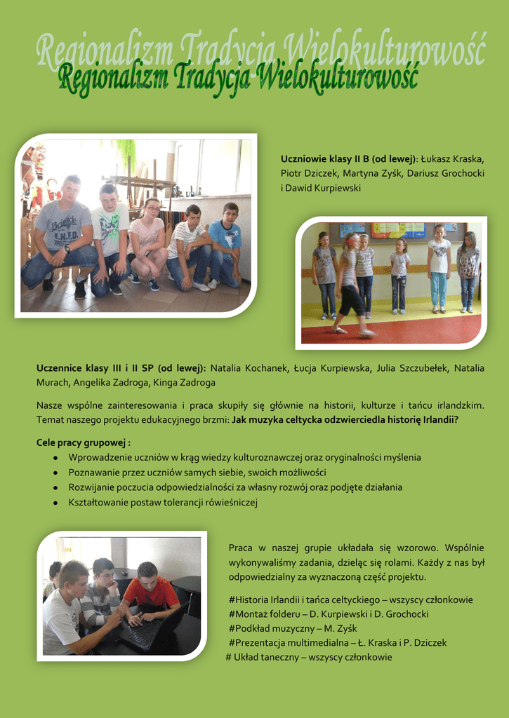 Uczniowie klasy II B (od lewej): Łukasz Kraska, Piotr Dziczek, Martyna Zyśk, Dariusz Grochocki i Dawid Kurpiewski Uczennice klasy III i II SP (od lewej): Natalia Kochanek, Łucja Kurpiewska, Julia Szczubełek, Natalia Murach, Angelika Zadroga, Kinga Zadroga Nasze wspólne zainteresowania i praca skupiły się głównie na historii, kulturze i tańcu irlandzkim. Temat naszego projektu edukacyjnego brzmi: Jak muzyka celtycka odzwierciedla historię Irlandii? Cele pracy grupowej : Wprowadzenie uczniów w krąg wiedzy kulturoznawczej oraz oryginalności myślenia Poznawanie przez uczniów samych siebie, swoich możliwości Rozwijanie poczucia odpowiedzialności za własny rozwój oraz podjęte działania Kształtowanie postaw tolerancji rówieśniczej Praca w naszej grupie układała się wzorowo. Wspólnie wykonywaliśmy zadania, dzieląc się rolami. Każdy z nas był odpowiedzialny za wyznaczoną część projektu. #Historia Irlandii i tańca celtyckiego – wszyscy członkowie #Montaż folderu – D. Kurpiewski i D. Grochocki #Podkład muzyczny – M. Zyśk #Prezentacja multimedialna – Ł. Kraska i P. Dziczek # Układ taneczny – wszyscy członkowie W ramach projektu uczniowie naszej grupy pracowali z sześcioma dziewczętami z trzeciej klasy szkoły podstawowej ucząc je tańca irlandzkiego. Dziewczęta z ogromnym entuzjazmem uczestniczyły w zajęciach, przygotowując krótki układ taneczny, który zostanie zaprezentowany na Festynie Rodzinnym. Nasze działania wspierała ubiegłoroczna stypendystka z języka angielskiego – Agnieszka Kwiatkowska, uczennica klasy IIIA. Opiekunowie: Dorota Śledzik i Dorota Piersa. Historia tańca irlandzkiego ujawnia ciągłe zmiany ludności, jakie zachodziły przez migrację i inwazje. Wszyscy przynosili ze sobą odmienny styl tańca i muzyki. Ponad 2000 lat temu Celtowie przybyli ze środkowej Europy do Irlandii, przywiedli ze sobą swój własny narodowy taniec. W połowie XVI w. tancerze występowali w wielkich salach nowo wybudowanych zamków. Niektóre z tańców zostały przejęte przez angielskich najeźdźców i dotarły do dworu Królowej Elżbiety. Od tego czasu wstąpił inny styl tańca, który był popularny, gdzie tancerki puszczają się wokół swoich partnerów. W XVIII w. pojawili się w Irlandii Mistrzowie Tańca. Byli to wędrowni nauczyciele, którzy podróżując, uczyli tańczyć prostych ludzi. Mieli żywiołowe charaktery, co przejawiało się w noszonych przez nich strojach o jasnych barwach. Podróżowali od wioski do wioski mając za towarzystwo całe grono swoich uczniów. Najmłodsi tancerze nie wiedzieli jeszcze jaka jest różnica między prawą a lewą nogą, więc żeby temu zaradzić, nauczyciel wiązał źdźbło trawy lub siana na prawej lub lewej nodze i pouczał: "podnieś lewą trawiastą nogę", "podnieś prawą sianową nogę" itd. Ci młodzi ludzie nauczeni byli wzajemnej pomocy w tańcu, tak by nawet najmniej uzdolnieni mogli wynieść z niego radość.
