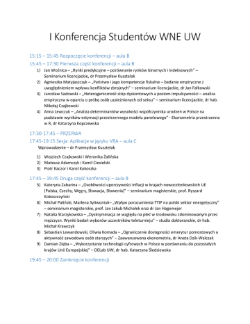 I Konferencja Studentów WNE UW 15:15 – 15:45 Rozpoczęcie konferencji – aula B 15:45 – 17:30 Pierwsza część konferencji – aula B 1) Jan Woźnica – „Rynki predykcyjne – porównanie rynków binarnych i indeksowych” – Seminarium licencjackie, dr Przemysław Kusztelak 2) Agnieszka Matyjaszczyk – „Państwo i jego kompetencje fiskalne – badanie empiryczne z uwzględnieniem wpływu konfliktów zbrojnych” – seminarium licencjackie, dr Jan Fałkowski 3) Jarosław Sadowski – „Heterogeniczność stóp dyskontowych a poziom impulsywności – analiza empiryczna w oparciu o próbę osób uzależnionych od seksu” – seminarium licencjackie, dr hab. Mikołaj Czajkowski 4) Anna Lewczuk – „Analiza determinantów wysokości współczynnika urodzeń w Polsce na podstawie wyników estymacji przestrzennego modelu panelowego” - Ekonometria przestrzenna w R, dr Katarzyna Kopczewska 17:30-17:45 – PRZERWA 17:45-19:15 Sesja: Aplikacje w języku VBA – aula C Wprowadzenie – dr Przemysław Kusztelak 1) Wojciech Czajkowski i Weronika Żalińska 2) Mateusz Adamczyk i Kamil Ciesielski 3) Piotr Kaczor i Karol Kokoszka 17:45 – 19:45 Druga część konferencji – aula B 5) Kateryna Zabarina – „Osobliwości uporczywości inflacji w krajach nowoczłonkowskich UE (Polska, Czechy, Węgry, Słowacja, Słowenia)” – seminarium magisterskie, prof. Ryszard Kokoszczyński 6) Michał Paliński, Marlena Syliwoniuk– „Wpływ porozumienia TTIP na polski sektor energetyczny” – seminarium magisterskie, prof. Jan Jakub Michałek oraz dr Jan Hagemejer 7) Natalia Starzykowska – „Dyskryminacja ze względu na płeć w środowisku zdominowanym przez mężczyzn. Wyniki badań wyborów uczestników teleturnieju” – studia doktoranckie, dr hab. Michał Krawczyk 8) Sebastian Lewandowski, Oliwia Komada – „Ograniczenie dostępności emerytur pomostowych a aktywność zawodowa osób starszych” – Zaawansowana ekonometria, dr Aneta Dzik-Walczak 9) Damian Zięba – „Wykorzystanie technologii cyfrowych w Polsce w porównaniu do pozostałych krajów Unii Europejskiej” – DELab UW, dr hab. Katarzyna Śledziewska 19:45 – 20:00 Zamknięcie konferencji