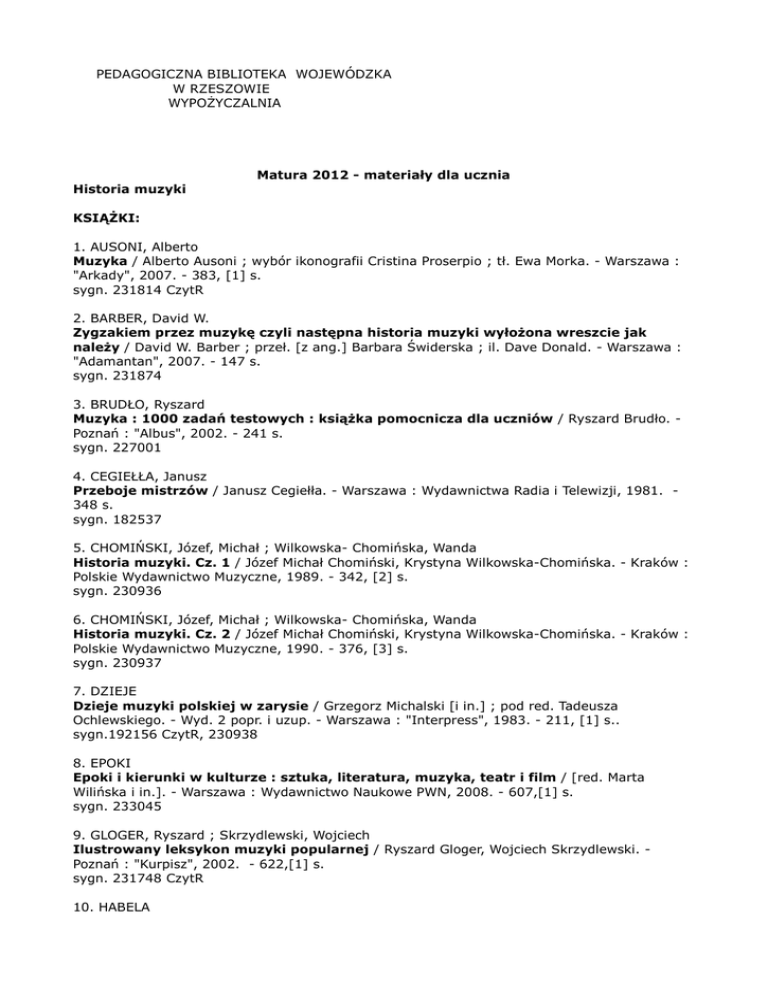 PEDAGOGICZNA BIBLIOTEKA WOJEWÓDZKA W RZESZOWIE WYPOŻYCZALNIA Matura 2012 - materiały dla ucznia Historia muzyki KSIĄŻKI: 1. AUSONI, Alberto Muzyka / Alberto Ausoni ; wybór ikonografii Cristina Proserpio ; tł. Ewa Morka. - Warszawa : "Arkady", 2007. - 383, [1] s. sygn. 231814 CzytR 2. BARBER, David W. Zygzakiem przez muzykę czyli następna historia muzyki wyłożona wreszcie jak należy / David W. Barber ; przeł. [z ang.] Barbara Świderska ; il. Dave Donald. - Warszawa : "Adamantan", 2007. - 147 s. sygn. 231874 3. BRUDŁO, Ryszard Muzyka : 1000 zadań testowych : książka pomocnicza dla uczniów / Ryszard Brudło. Poznań : "Albus", 2002. - 241 s. sygn. 227001 4. CEGIEŁŁA, Janusz Przeboje mistrzów / Janusz Cegiełła. - Warszawa : Wydawnictwa Radia i Telewizji, 1981. 348 s. sygn. 182537 5. CHOMIŃSKI, Józef, Michał ; Wilkowska- Chomińska, Wanda Historia muzyki. Cz. 1 / Józef Michał Chomiński, Krystyna Wilkowska-Chomińska. - Kraków : Polskie Wydawnictwo Muzyczne, 1989. - 342, [2] s. sygn. 230936 6. CHOMIŃSKI, Józef, Michał ; Wilkowska- Chomińska, Wanda Historia muzyki. Cz. 2 / Józef Michał Chomiński, Krystyna Wilkowska-Chomińska. - Kraków : Polskie Wydawnictwo Muzyczne, 1990. - 376, [3] s. sygn. 230937 7. DZIEJE Dzieje muzyki polskiej w zarysie / Grzegorz Michalski [i in.] ; pod red. Tadeusza Ochlewskiego. - Wyd. 2 popr. i uzup. - Warszawa : "Interpress", 1983. - 211, [1] s.. sygn.192156 CzytR, 230938 8. EPOKI Epoki i kierunki w kulturze : sztuka, literatura, muzyka, teatr i film / [red. Marta Wilińska i in.]. - Warszawa : Wydawnictwo Naukowe PWN, 2008. - 607,[1] s. sygn. 233045 9. GLOGER, Ryszard ; Skrzydlewski, Wojciech Ilustrowany leksykon muzyki popularnej / Ryszard Gloger, Wojciech Skrzydlewski. Poznań : "Kurpisz", 2002. - 622,[1] s. sygn. 231748 CzytR 10. HABELA Słowniczek muzyczny / Jerzy Habela. - Wyd. 14. - Kraków : Polskie Wydawnictwo Muzyczne, 1998. - 222, [2] s. sygn. 224842 11. HEJMEJ, Andrzej Muzyka w literaturze : perspektywy komparatystyki interdyscyplinarnej / Andrzej Hejmej. - Kraków : "Universitas", cop. 2008. - 351 s. sygn. 231953 12. JACHIMECKI, Zdzisław Muzyka polska w rozwoju historycznym : od czasów najdawniejszych do doby obecnej. T. 1, Od Bogurodzicy do Chopina włącznie / Zdzisław Jachimecki. - Kraków : Księgarnia Stefana Kamińskiego, 1948.- 227 s. sygn. 2833, 72453 13. JANKOWSKI, Bogdan M. Rozmyślania nad pięciolinią / Bogdan M. Jankowski. - Warszawa : Centralny Ośrodek Metodyki Upowszechniania Kultury, 1983. - 144 s. sygn.188021 14. KOMOROWSKA, Małgorzata Zaproszenie do muzyki / Małgorzata Komorowska. - Warszawa : Państwowe Zakłady Wydawnictw Szkolnych, 1973. - 243,[5] s. sygn. 137274, 137480 CzytR 15. KOWALSKA, Małgorzata ABC historii muzyki / Małgorzata Kowalska. - Kraków : Musica Iagiellonica, 2001 – 692, [1] s. sygn. 229238 16. LASOCKI, Józef Karol Podstawowe wiadomości z nauki o muzyce : popularny podręcznik dla uczniów i samouków / Józef Karol Lasocki. - Wyd. 15. - Kraków : Polskie Wydawnictwo Muzyczne, 2006. - 171 s. sygn.230566 17. LISSA, Zofia Zarys nauki o muzyce / Zofia Lissa ; wstęp i komentarz Iwona Lindstedt. - Wyd. 6. Warszawa ; Rzeszów : "Ad Oculos", 2007. - 383, [1] s. sygn. 230524 18. MAŁA Mała encyklopedia muzyki / red. nacz. Stefan Śledziński. - Warszawa : Państw. Wydaw. Naukowe, 1968. – 1269 s. sygn. 105955-956 19. MUCHENBERG, Bohdan Pogadanki o muzyce. [Cz.] 2 / Bohdan Muchenberg. - Kraków : Polskie Wydawnictwo Muzyczne, 1966. - 316, [1] s. sygn. 89908 CzytR, 89909 20. MUZYKA Muzyka : kompozytorzy i wykonawcy, prądy i kierunki, dzieła / [red. Sławomir Żurawski]. - Warszawa : Wydawnictwo Naukowe PWN, 2007. - 879,[1] s. sygn. 231689 CzytR 21. PANEK, Wacław Encyklopedia muzyki rozrywkowej / Wacław Panek. - Warszawa : "Świat Książki", 2000. 470 s. sygn. 223703 22. PANEK, Wacław Mały słownik muzyki rozrywkowej. – Warszawa : ZAKR, 1986. – 124 s. sygn. 124 sygn. 201296 23. PIĄTKOWSKI, Dionizy Jazz. [1], A-J / Dionizy Piątkowski. - Wyd. 4. - Poznań : "Atena", 2005. - 768 s. sygn. 231744 24. PONIATOWSKA, Irena Słownik szkolny : muzyka / Irena Poniatowska. - Wyd. 2 popr. - Warszawa : Wydawnictwa Szkolne i Pedagogiczne, 1997. - 154, [3] s. sygn. 220304 CzytR 25. REISS, Józef, Władysław Mała historia muzyki : popularny podręcznik dla uczniów i samouków / Józef Władysław Reiss. - Wyd. 4. - Kraków : Polskie Wydawnictwo Muzyczne, 1965. - 202 s. sygn. 79379 26. ROGALA, Jacek Muzyka polska XX wieku / Jacek Rogala. - Kraków : Polskie Wydawnictwo Muzyczne, 2000. - 102, [2] s. sygn. 230581 CzytR, 230582 27. RUDZIŃSKI, Witold Muzyka naszego stulecia / Witold Rudziński. - Warszawa : Wydawnictwa Szkolne i Pedagogiczne, 1995. - 195, [1] s. sygn. 218035 CzytR 28. SCHAFFER, Bogusław Historia muzyki - style i twórcy / Bogusław Schaffer. - Poznań : Młodzieżowy Ruch Miłośników Muzyki Pro Sinfonika, 1979. - 530, [1] s. sygn. 172563 CzytR 29. SCHAFFER, Bogusław Mały informator muzyki XX wieku / Bogusław Schaffer. – Wyd. 4 - Kraków : Państw. Wydaw. Muz., 1987. – 412 s. sygn. 204251 30. SCHAFFER, Bogusław Muzyka XX wieku : twórcy i problemy / Bogusław Schaeffer. - Kraków : Wydawnictwo Literackie, 1975. - 397, [3] s. sygn. 146721 CzytR 31. SŁOWNIK Słownik muzyków polskich. T. 1, A-Ł / red. Józef Michał Chomiński ; Instytut Sztuki PAN. Kraków : Polskie Wydawnictwo Muzyczne, 1964. - 346, [3] s. sygn. 73319 32. SŁOWNIK Słownik muzyków polskich. T. 2, M-Z / red. Józef Chomiński ; Instytut Sztuki PAN. Kraków : Polskie Wydawnictwo Muzyczne, 1967. - 319, [3] s. sygn. 95356 33. SŁOWNIK Słownik wiedzy o kulturze : [sztuka, muzyka, teatr, film, antropologia kultury / aut. haseł] Wojciech Antosik [i in. ; red.: Krystyna Kubalska-Sulkiewicz i in.]. - Warszawa : "Arkady", 2009. - 727 s. sygn. 234134 34. SMOŁKA, Tomasz Inwazja decybeli : czyli muzyka rockowa i okolice / Tomasz Smołka. - Tychy : "Maternus Media", cop. 2003. - 142 s, sygn. 228