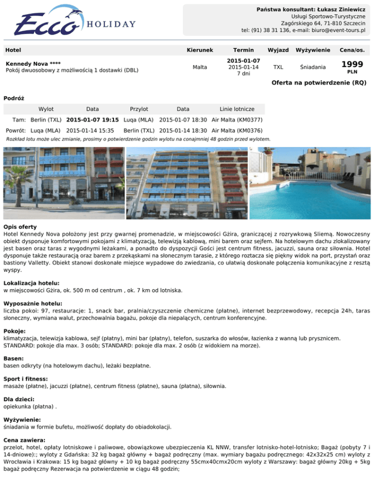 Państwa konsultant: Łukasz Ziniewicz Usługi Sportowo-Turystyczne Zagórskiego 64, 71-810 Szczecin tel: (91) 38 31 136, e-mail: [email protected] Hotel Kierunek Termin Wyjazd Wyżywienie Cena/os. Malta 2015-01-07 2015-01-14 7 dni TXL Śniadania 1999 Kennedy Nova **** Pokój dwuosobowy z możliwością 1 dostawki (DBL) PLN Oferta na potwierdzenie (RQ) Podróż Wylot Data Przylot Data Linie lotnicze Tam: Berlin (TXL) 2015-01-07 19:15 Luqa (MLA) 2015-01-07 18:30 Air Malta (KM0377) Powrót: Luqa (MLA) 2015-01-14 15:35 Berlin (TXL) 2015-01-14 18:30 Air Malta (KM0376) Rozkład lotu może ulec zmianie, prosimy o potwierdzenie godzin wylotu na conajmniej 48 godzin przed wylotem. Opis oferty Hotel Kennedy Nova położony jest przy gwarnej promenadzie, w miejscowości Gżira, graniczącej z rozrywkową Sliemą. Nowoczesny obiekt dysponuje komfortowymi pokojami z klimatyzacją, telewizją kablową, mini barem oraz sejfem. Na hotelowym dachu zlokalizowany jest basen oraz taras z wygodnymi leżakami, a ponadto do dyspozycji Gości jest centrum fitness, jacuzzi, sauna oraz siłownia. Hotel dysponuje także restauracją oraz barem z przekąskami na słonecznym tarasie, z którego roztacza się piękny widok na port, przystań oraz bastiony Valletty. Obiekt stanowi doskonałe miejsce wypadowe do zwiedzania, co ułatwią doskonałe połączenia komunikacyjne z resztą wyspy. Lokalizacja hotelu: w miejscowości Gżira, ok. 500 m od centrum , ok. 7 km od lotniska. Wyposażnie hotelu: liczba pokoi: 97, restauracje: 1, snack bar, pralnia/czyszczenie chemiczne (płatne), internet bezprzewodowy, recepcja 24h, taras słoneczny, wymiana walut, przechowalnia bagażu, pokoje dla niepalących, centrum konferencyjne. Pokoje: klimatyzacja, telewizja kablowa, sejf (płatny), mini bar (płatny), telefon, suszarka do włosów, łazienka z wanną lub prysznicem. STANDARD: pokoje dla max. 3 osób; STANDARD: pokoje dla max. 2 osób (z widokiem na morze). Basen: basen odkryty (na hotelowym dachu), leżaki bezpłatne. Sport i fitness: masaże (płatne), jacuzzi (płatne), centrum fitness (płatne), sauna (płatna), siłownia. Dla dzieci: opiekunka (płatna) . Wyżywienie: śniadania w formie bufetu, możliwość dopłaty do obiadokolacji. Cena zawiera: przelot, hotel, opłaty lotniskowe i paliwowe, obowiązkowe ubezpieczenia KL NNW, transfer lotnisko-hotel-lotnisko; Bagaż (pobyty 7 i 14-dniowe):; wyloty z Gdańska: 32 kg bagaż główny + bagaż podręczny (max. wymiary bagażu podręcznego: 42x32x25 cm) wyloty z Wrocławia i Krakowa: 15 kg bagaż główny + 10 kg bagaż podręczny 55cmx40cmx20cm wyloty z Warszawy: bagaż główny 20kg + 5kg bagaż podręczny Rezerwacja na potwierdzenie w ciągu 48 godzin; Cena nie zawiera: W przypadku pobytów 3 i 4-dniowych:; wyloty z Krakowa i Wrocławia: dopłaty do bagażu głównego 15 kg (wyloty w kwietniu, czerwcu, lipcu, sierpniu, wrześniu - 270 zł; wyloty w maju, październiku - 165 zł); wyloty z Gdańska: dopłaty do bagażu głównego do 32kg - 335zł; Obsługa w miejscu docelowym: Ograniczona obsługa w języku polskim (kontakt telefoniczny). Niedostępna 30.11 - 7.12. ; Informacje zamieszczone w niniejszym dokumencie nie stanowią oferty handlowej w rozumieniu art. 543 Kodeksu Cywilnego. Data wygenerowania do druku: 18-12-2014 20:25. Wystawił: Łukasz Ziniewicz. Więcej informacji o ofercie na www.eccoholiday.com