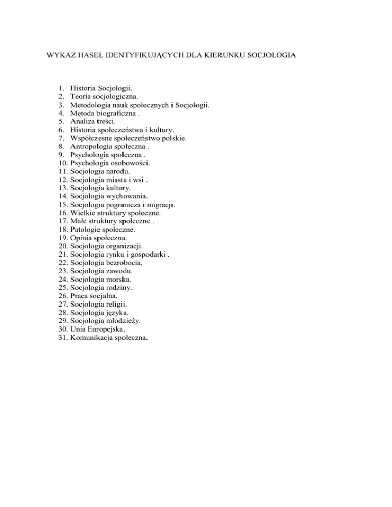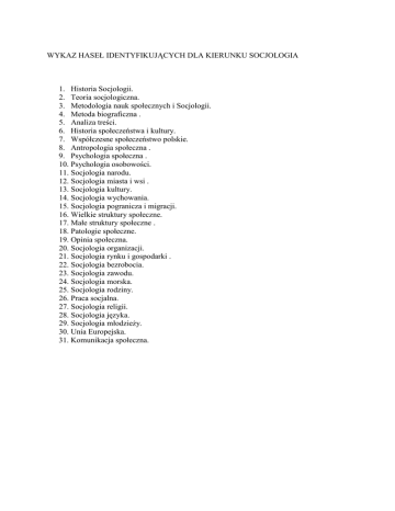 WYKAZ HASEŁ IDENTYFIKUJĄCYCH DLA KIERUNKU SOCJOLOGIA 1. Historia Socjologii. 2. Teoria socjologiczna. 3. Metodologia nauk społecznych i Socjologii. 4. Metoda biograficzna . 5. Analiza treści. 6. Historia społeczeństwa i kultury. 7. Współczesne społeczeństwo polskie. 8. Antropologia społeczna . 9. Psychologia społeczna . 10. Psychologia osobowości. 11. Socjologia narodu. 12. Socjologia miasta i wsi . 13. Socjologia kultury. 14. Socjologia wychowania. 15. Socjologia pogranicza i migracji. 16. Wielkie struktury społeczne. 17. Małe struktury społeczne . 18. Patologie społeczne. 19. Opinia społeczna. 20. Socjologia organizacji. 21. Socjologia rynku i gospodarki . 22. Socjologia bezrobocia. 23. Socjologia zawodu. 24. Socjologia morska. 25. Socjologia rodziny. 26. Praca socjalna. 27. Socjologia religii. 28. Socjologia języka. 29. Socjologia młodzieŜy. 30. Unia Europejska. 31. Komunikacja społeczna.