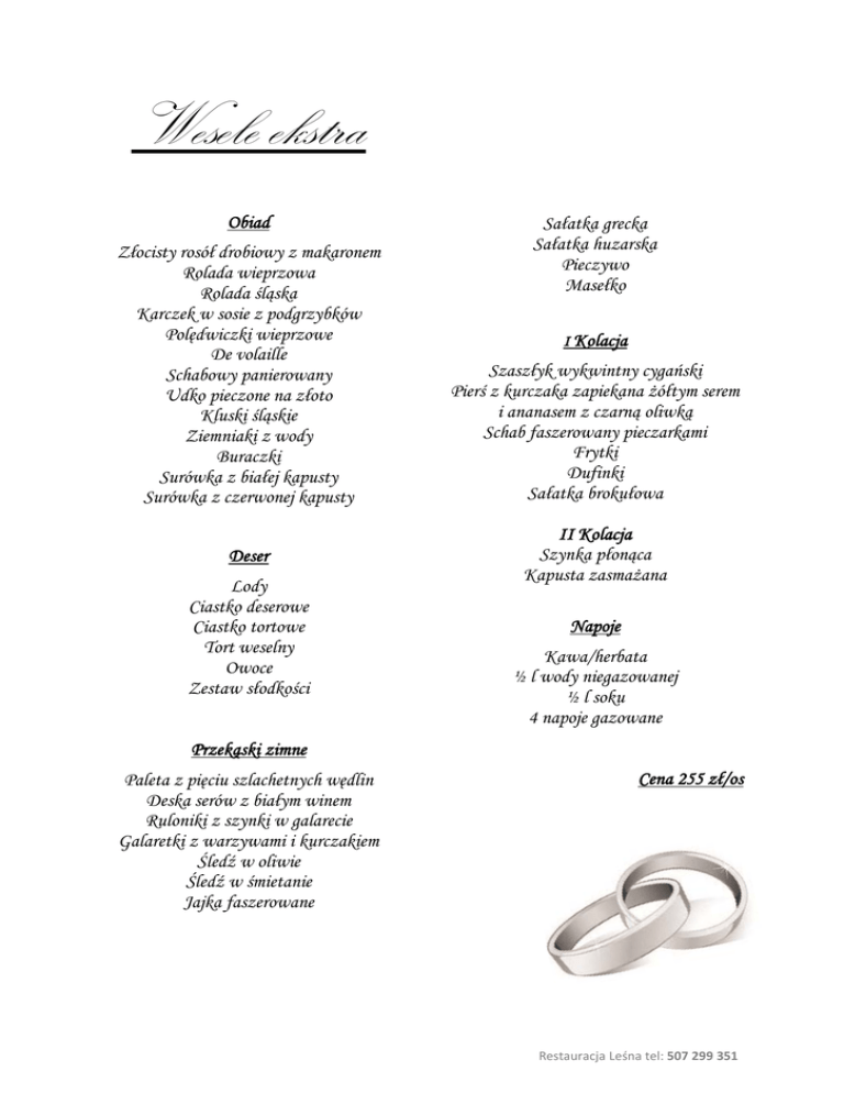 Wesele ekstra Obiad Złocisty rosół drobiowy z makaronem Rolada wieprzowa Rolada śląska Karczek w sosie z podgrzybków Polędwiczki wieprzowe De volaille Schabowy panierowany Udko pieczone na złoto Kluski śląskie Ziemniaki z wody Buraczki Surówka z białej kapusty Surówka z czerwonej kapusty Deser Lody Ciastko deserowe Ciastko tortowe Tort weselny Owoce Zestaw słodkości Sałatka grecka Sałatka huzarska Pieczywo Masełko I Kolacja Szaszłyk wykwintny cygański Pierś z kurczaka zapiekana żółtym serem i ananasem z czarną oliwką Schab faszerowany pieczarkami Frytki Dufinki Sałatka brokułowa II Kolacja Szynka płonąca Kapusta zasmażana Napoje Kawa/herbata ½ l wody niegazowanej ½ l soku 4 napoje gazowane Przekąski zimne Paleta z pięciu szlachetnych wędlin Deska serów z białym winem Ruloniki z szynki w galarecie Galaretki z warzywami i kurczakiem Śledź w oliwie Śledź w śmietanie Jajka faszerowane Cena 255 zł/os Restauracja Leśna tel: 507 299 351
