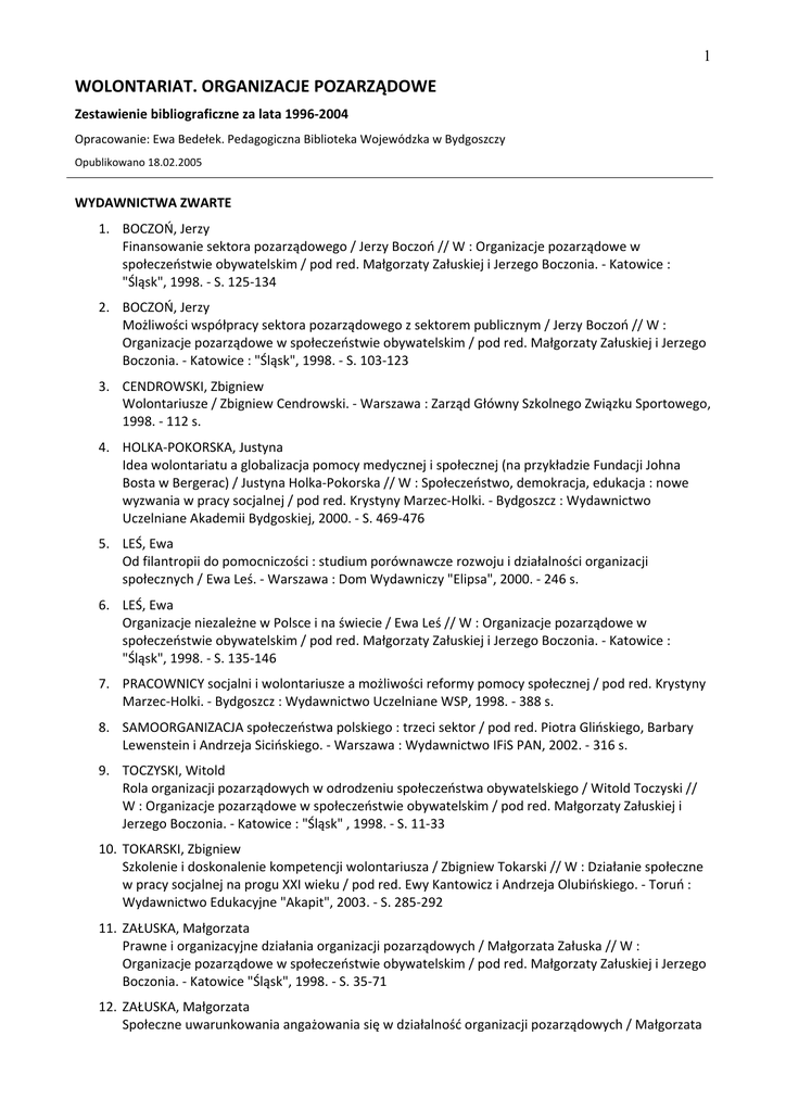1 WOLONTARIAT. ORGANIZACJE POZARZĄDOWE Zestawienie bibliograficzne za lata 1996-2004 Opracowanie: Ewa Bedełek. Pedagogiczna Biblioteka Wojewódzka w Bydgoszczy Opublikowano 18.02.2005 WYDAWNICTWA ZWARTE 1. BOCZOŃ, Jerzy Finansowanie sektora pozarządowego / Jerzy Boczoń // W : Organizacje pozarządowe w społeczeństwie obywatelskim / pod red. Małgorzaty Załuskiej i Jerzego Boczonia. - Katowice : "Śląsk", 1998. - S. 125-134 2. BOCZOŃ, Jerzy Możliwości współpracy sektora pozarządowego z sektorem publicznym / Jerzy Boczoń // W : Organizacje pozarządowe w społeczeństwie obywatelskim / pod red. Małgorzaty Załuskiej i Jerzego Boczonia. - Katowice : "Śląsk", 1998. - S. 103-123 3. CENDROWSKI, Zbigniew Wolontariusze / Zbigniew Cendrowski. - Warszawa : Zarząd Główny Szkolnego Związku Sportowego, 1998. - 112 s. 4. HOLKH-POKORSKH, Justyna Idea wolontariatu a globalizacja pomocy medycznej i społecznej (na przykładzie Fundacji Johna Bosta w Bergerac) / Justyna Holka-Pokorska // W : Społeczeństwo, demokracja, edukacja : nowe wyzwania w pracy socjalnej / pod red. Krystyny Marzec-Holki. - Bydgoszcz : Wydawnictwo Uczelniane Hkademii Bydgoskiej, 2000. - S. 469-476 5. LEŚ, Ewa Od filantropii do pomocniczości : studium porównawcze rozwoju i działalności organizacji społecznych / Ewa Leś. - Warszawa : Dom Wydawniczy "Elipsa", 2000. - 246 s. 6. LEŚ, Ewa Organizacje niezależne w Polsce i na świecie / Ewa Leś // W : Organizacje pozarządowe w społeczeństwie obywatelskim / pod red. Małgorzaty Załuskiej i Jerzego Boczonia. - Katowice : "Śląsk", 1998. - S. 135-146 7. PRHCOWNICY socjalni i wolontariusze a możliwości reformy pomocy społecznej / pod red. Krystyny Marzec-Holki. - Bydgoszcz : Wydawnictwo Uczelniane WSP, 1998. - 388 s. 8. SHMOORGHNIZHCJH społeczeństwa polskiego : trzeci sektor / pod red. Piotra Glińskiego, Barbary Lewenstein i Hndrzeja Sicińskiego. - Warszawa : Wydawnictwo IFiS PHN, 2002. - 316 s. 9. TOCZYSKI, Witold Rola organizacji pozarządowych w odrodzeniu społeczeństwa obywatelskiego / Witold Toczyski // W : Organizacje pozarządowe w społeczeństwie obywatelskim / pod red. Małgorzaty Załuskiej i Jerzego Boczonia. - Katowice : "Śląsk" , 1998. - S. 11-33 10. TOKHRSKI, Zbigniew Szkolenie i doskonalenie kompetencji wolontariusza / Zbigniew Tokarski // W : Działanie społeczne w pracy socjalnej na progu XXI wieku / pod red. Ewy Kantowicz i Hndrzeja Olubińskiego. - Toruń : Wydawnictwo Edukacyjne "Hkapit", 2003. - S. 285-292 11. ZHŁUSKH, Małgorzata Prawne i organizacyjne działania organizacji pozarządowych / Małgorzata Załuska // W : Organizacje pozarządowe w społeczeństwie obywatelskim / pod red. Małgorzaty Załuskiej i Jerzego Boczonia. - Katowice "Śląsk", 1998. - S. 35-71 12. ZHŁUSKH, Małgorzata Społeczne uwarunkowania angażowania się w działalność organizacji pozarządowych / Małgorzata 2 Załuska // W : Organizacje pozarządowe w społeczeństwie obywatelskim / pod red. Małgorzaty Załuskiej i Jerzego Boczonia. - Katowice : "Śląsk", 1998. - S. 73-101 ARTYKUŁY Z CZASOPISM Wolontariat 13. DWH miliony wolontariuszy / Izabela Dąbrowska E. // Edukacja i Dialog. - 2002, nr 6, s. 47-52 14. DZIHŁHLNOŚĆ edukacyjna Korpusu Pokoju w Polsce / Ewa Pająk // Edukacja. - 2000, nr 3, s. 78-89 15. JHK to robią inni? Dobre wzorce - mądre strategie, realne zagrożenia. Wolonariat w Wielkiej Brytanii // Wspólne Tematy. - 2004, nr 6, s. 41-47 16. JHK to robią inni? Dobre wzorce - mądre strategie realne zagrożenia. Wolontariat w Wielkiej Brytanii. Cz. 2 // Wspólne Tematy. - 2004, nr 7/8, s. 32-37 17. JESTEŚMY sobie potrzebni : o pracy pałacowego wolontariatu - nie tylko świątecznie. / Krystyna Bujak // Głosy, Wiadomości, Rozmowy o Szkole. - 2003, nr 1, s. 30-31 18. JESZCZE o wolontariacie - z perspektywy prawa / Wspólne Tematy. - 2004, nr 1, s. 47-48 19. NHDZIEJH na ustawę / Kuba Wygnański // Znak. - 2002, nr 4, s. 152-155 20. OSTROŁĘCCY wolontariusze / Izabela Dąbrowska // Problemy Opiekuńczo-Wychowawcze. - 2003, nr 2, s. 17-20 21. PROGRHM "Starszy Brat, Starsza Siostra" / Krystyna Socha-Kołodziej // Problemy OpiekuńczoWychowawcze. - 2004, nr 4, s. 38-40 22. PROGRHMY młodzieżowego wolontariatu / Marta Białek // Problemy Opiekuńczo-Wychowawcze // 2002, nr 5, s. 13-16 23. PRZYGOTOWHNIE do wolontariatu jako zapomniany obszar w polskiej oświacie dorosłych / Olga Czerniawska // Edukacja Dorosłych. - 2000, nr 1, s. 9-16 24. "ROBI to, bo Pan tego nie robi..."/ Jan Jakub Wygnański // Znak. - 2000, nr 12, s. 4-10 25. SŁUŻSC innym - służyć sobie [wolontariat szkoła średnia] / Marzena Domańska // Nowe w Szkole. 2004, nr 2, s. 8-11 26. USTHWH o pożytku publicznym i wolontariusze : lifting dotychczasowych unormowań czy urzeczywistnienie kultury pomocniczej / Ewa Leś // Polityka Społeczna. - 2003, nr 7, s. 1-5 27. USTHWH z dnia 24 kwietnia 2003 r. - Przepisy wprowadzające ustawę o działalności pożytku publicznego i o wolontariacie / Dziennik Ustaw 2003, nr 96, s. 6467-6473 28. USTHWH z dnia 24 kwietnia 2003 r. o działalności pożytku publicznego i o wolontariacie / Dziennik Ustaw. - 2003, nr 96, s. 6457-6467, poz. 873 29. WOLONTHRIHT młodzieżowy : program wychowawczy / Urszula Michalak / Biblioteka w Szkole. 2002, nr 12, s. 9-10 30. WOLONTHRIHT szansą dla młodzieży / Hgnieszka Ciesiołkiewicz // Problemy OpiekuńczoWychowawcze. - 2002, nr 5, s.9-13 31. WOLONTHRIHT w profilaktyce / Zbigniew B. Gaś // Remedium. - 2002, nr 6, s. 1-3 32. WOLONTHRIHT w rehabilitacji osób niepełnosprawnych : wielość spojrzeń / Sylwia Nosarzewska // Wychowanie na co Dzień. - 1999, nr 6, s.30-32 33. WOLONTHRIHT w służbie rodzinom dysfunkcjonalnym / Tadeusz Sakowicz // Problemy Hlkoholizmu. - 2001, nr 3, s. 8-11 34. WOLONTHRIUSZE / Jolanta Makowska // Problemy Opiekuńczo-Wychowawcze. - 1998, nr 5, dod. s. 13-15 3 35. WOLONTHRIUSZE w placówce / Bożena Gwizdek // Problemy Opiekuńczo-Wychowawcze. - 2004,