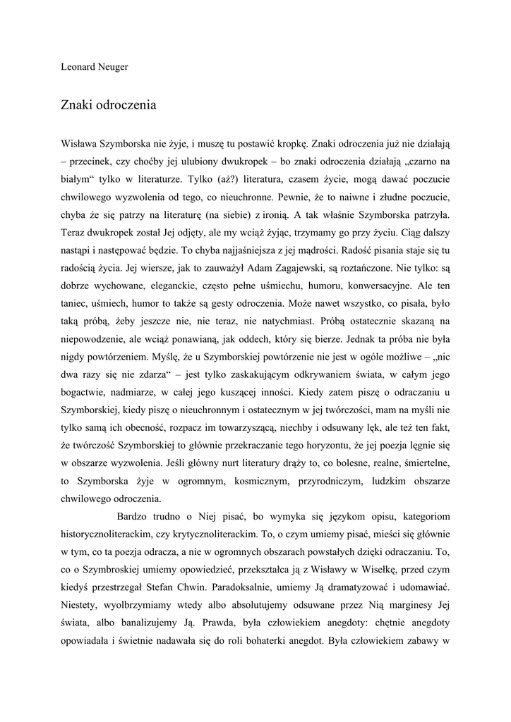 Leonard Neuger Znaki odroczenia Wisława Szymborska nie żyje, i muszę tu postawić kropkę. Znaki odroczenia już nie działają – przecinek, czy choćby jej ulubiony dwukropek – bo znaki odroczenia działają „czarno na białym“ tylko w literaturze. Tylko (aż?) literatura, czasem życie, mogą dawać poczucie chwilowego wyzwolenia od tego, co nieuchronne. Pewnie, że to naiwne i złudne poczucie, chyba że się patrzy na literaturę (na siebie) z ironią. A tak właśnie Szymborska patrzyła. Teraz dwukropek został Jej odjęty, ale my wciąż żyjąc, trzymamy go przy życiu. Ciąg dalszy nastąpi i następować będzie. To chyba najjaśniejsza z jej mądrości. Radość pisania staje się tu radością życia. Jej wiersze, jak to zauważył Adam Zagajewski, są roztańczone. Nie tylko: są dobrze wychowane, eleganckie, często pełne uśmiechu, humoru, konwersacyjne. Ale ten taniec, uśmiech, humor to także są gesty odroczenia. Może nawet wszystko, co pisała, było taką próbą, żeby jeszcze nie, nie teraz, nie natychmiast. Próbą ostatecznie skazaną na niepowodzenie, ale wciąż ponawianą, jak oddech, który się bierze. Jednak ta próba nie była nigdy powtórzeniem. Myślę, że u Szymborskiej powtórzenie nie jest w ogóle możliwe – „nic dwa razy się nie zdarza“ – jest tylko zaskakującym odkrywaniem świata, w całym jego bogactwie, nadmiarze, w całej jego kuszącej inności. Kiedy zatem piszę o odraczaniu u Szymborskiej, kiedy piszę o nieuchronnym i ostatecznym w jej twórczości, mam na myśli nie tylko samą ich obecność, rozpacz im towarzyszącą, niechby i odsuwany lęk, ale też ten fakt, że twórczość Szymborskiej to głównie przekraczanie tego horyzontu, że jej poezja lęgnie się w obszarze wyzwolenia. Jeśli główny nurt literatury drąży to, co bolesne, realne, śmiertelne, to Szymborska żyje w ogromnym, kosmicznym, przyrodniczym, ludzkim obszarze chwilowego odroczenia. Bardzo trudno o Niej pisać, bo wymyka się językom opisu, kategoriom historycznoliterackim, czy krytycznoliterackim. To, o czym umiemy pisać, mieści się głównie w tym, co ta poezja odracza, a nie w ogromnych obszarach powstałych dzięki odraczaniu. To, co o Szymbroskiej umiemy opowiedzieć, przekształca ją z Wisławy w Wisełkę, przed czym kiedyś przestrzegał Stefan Chwin. Paradoksalnie, umiemy Ją dramatyzować i udomawiać. Niestety, wyolbrzymiamy wtedy albo absolutujemy odsuwane przez Nią marginesy Jej świata, albo banalizujemy Ją. Prawda, była człowiekiem anegdoty: chętnie anegdoty opowiadała i świetnie nadawała się do roli bohaterki anegdot. Była człowiekiem zabawy w stanie czystym, to znaczy bezinteresownej i purnonsensowej: na urządzanych przez Nią dla najbliższych przyjaciół przyjęciach obowiązkowe były loteryjki, gdzie każdy (oprócz gospodyni) wygrywał jakąś bezużyteczną rzecz. I Szymborska zbierała te bibeloty, przygotowywała się do tej zabawy, bo Ona była serio, czyli dla przyjaciół. Mam dotąd w domu wygrane przez mnie: maleńką puszkę do herbaty, gdzie mieszczą się maksimum dwie porcje, papierową maskę Japonki, czy jakieś bliżej niezindetyfikowane przedmioty o niejasnej użyteczności. Bawiła się, bawiliśmy się jak dzieci: niepokoje były odsunięte. Śmialiśmy się i patrzyliśmy z zachwytem w jej czarne, inteligentne, błyszczące humorem i ciepłem oczy. A po spotkaniach wysyłała nam wyklejanki, każdą z Jej liniami papilarnymi, surrealistyczne, ale właśnie do nas skierowane. Zawsze na Boże Narodzenie, niekiedy na specjalne okazje. Ale to były chwile odroczenia. Szymborska spotykała się z nami – u siebie czy na mieście – tylko wtedy, kiedy była w dobrej formie. Spotykała się z każdym przyjacielem z osobna, choćbyśmy siedzieli w osiem osób. Cieszyła się z każdego spotkania, jakby stanowiło cud. I cudem było. Nie słyszałem nigdy, żeby się na coś skarżyła. Niepowodzenia, lęki, smutki zostawiała gdzieś indziej. Nie na tyle jednak daleko, żeby udawać nieistnienie: odroczenie nie oznacza – głupiej w gruncie rzeczy – negacji. Oznacza chwilowe zawieszenie dominacji nicości. Wiedziała także o trudnych problemach Jej przyjaciół, tych problemów się nie negowało, tylko na tę chwilę spotkania – odsuwało. Także wiersze, które pisała, w więkoszości lądowały w koszu. Ale kosz nie był nigdy ośrodkiem jej poezji. On tam był, ale poza polem widzenia. W 1996 roku w związku z uroczystościami Noblowskimi przyszło mi prowadzić spotkanie z nią dla Polonii. Sala była, rzecz jasna, nabita, o to się nie martwiłem. Martwiłem się o dwie – bagatela! – rzeczy: jak nie zamienić Wisławy Szymborskiej w Wisełkę. I jak skłonić Ją do mówienia w sytuacji bardzo przez Nią nielubianej, to znaczy – wystawienia na pokaz. Ten pierwszy problem musiałem wziąć na siebie. Zdawałem sobie bowiem sprawę z tego, że Szymborska, jeżeli w ogóle coś powie, to natychmiast zdusi ton serio, patos, pompę i hołdownictwo i zauroczy salę. Ba, ale jako kto? Zatem uznałem, że muszę jednak powiedzieć o wielkości tej poezji. Ten drugi problem wzięła na siebie Teresa Walas. Nie pamiętam już, co takiego powiedziałem, na pewno nie mówiłem długo, jakieś pięć minut. I wtedy Szymborska wtrąciła się: Leonie, ja nie jestem taka całkiem dramatyczna. Sam Miłosz napisał, że w moim świecie daje się żyć. Teraz przyszła już kolej na Teresę Walas, która wymyśliła pytanie-ideał: – Wisełko, gdyby tak się zdarzyło, że jakiś inny poeta dostałby Nobla, a ty byś się znalazła w takiej sytuacji jak tu zgromadzeni, to jakie byś takiemu Nobliście zadała pytanie? Wisława zaczęła się śmiać i powiedziała (jaka ulga!), że nie sądzi, żeby się odważyła przyjść na takie spotkanie, a jeśli już, to na pewno przycupnęłaby w ostatnim rzędzie i na pewno nie zadałaby żadnego pytania. Ten rodzaj lęku miał wstęp do jej