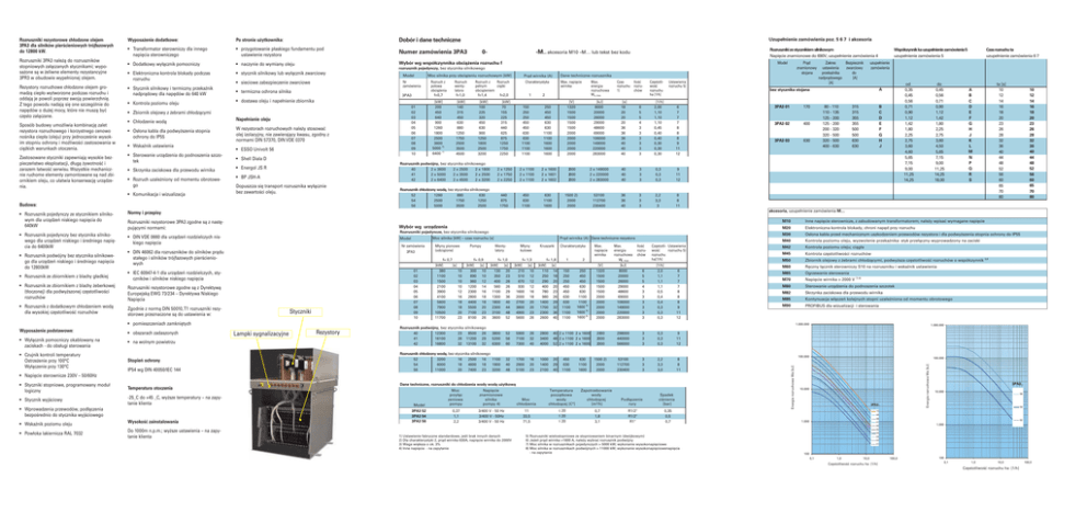 Rezystory rozruchowe chłodzone olejem gromadzą ciepło wytworzone podczas rozruchu i oddają je powoli poprzez swoją powierzchnię. Z tego powodu nadają się one szczególnie do napędów o dużej mocy, które nie muszą być często załączane. Sposób budowy umożliwia kombinację zalet rezystora rozruchowego i korzystnego cenowo nośnika ciepła (oleju) przy jednocześnie wysokim stopniu ochrony i możliwości zastosowania w ciężkich warunkach otoczenia. Zastosowane styczniki zapewniają wysokie bezpieczeństwo eksploatacji, długą żywotność i zarazem łatwość serwisu. Wszystkie mechanicznie ruchome elementy zamontowane są nad zbiornikiem oleju, co ułatwia konserwację urządzenia. Po stronie użytkownika: Dobór i dane techniczne • Transformator sterowniczy dla innego napięcia sterowniczego • przygotowanie płaskiego fundamentu pod ustawienie rezystora Numer zamówienia 3PA3 • Dodatkowy wyłącznik pomocniczy • naczynie do wymiany oleju Wybór wg współczynnika obciążenia rozruchu f • Elektroniczna kontrola blokady podczas rozruchu • stycznik silnikowy lub wyłącznik zwarciowy • Stycznik silnikowy i termiczny przekaźnik nadprądowy dla napędów do 640 kW • termiczna ochrona silnika • Kontrola poziomu oleju • dostawa oleju i napełnienie zbiornika Model Nr zamówienia • sieciowe zabezpieczenie zwarciowe 3PA3 • Chłodzenie wodą Napełnianie oleju • Osłona kabla dla podwyższenia stopnia ochrony do IP55 W rezystorach rozruchowych należy stosować olej izolacyjny, nie zawierający kwasu, zgodny z normami DIN 57370, DIN VDE 0370 • Wskaźnik ustawienia • Shell Diala D • Skrzynka zaciskowa dla przewodu wirnika • Energol JS R • Rozruch uzależniony od momentu obrotowego • BP JSH-A Dopuszcza się transport rozrusznika wyłącznie bez zawartości oleju. Rozruch z połowa obciążenia f=0,7 Rozruch wentylatora f=1,0 [kW] 200 450 640 900 1260 1800 2500 3600 7) 5000 7) 6400 [kW] 140 315 450 630 880 1250 1750 2500 3500 4500 2 x 1100 2 x 1100 2 x 1100 Rozrusznik chłodzony wodą, bez stycznika silnikowego 52 1260 880 630 54 2500 1750 1250 56 5000 3500 2500 440 875 1750 450 630 1100 • Rozrusznik pojedynczy bez stycznika silnikowego dla urządzeń niskiego i średniego napięcia do 6400kW • DIN VDE 0660 dla urządzeń rozdzielczych niskiego napięcia Model 3PA3 • Wyłącznik pomocniczy okablowany na zaciskach - do obsługi sterowania • na wolnym powietrzu • Czujnik kontroli temperatury Ostrzeżenie przy 100°C Wyłączenie przy 130°C Stopień ochrony IP54 wg DIN 40050/IEC 144 Młyny pionowe (odciążone) f= 0,7 [kW] [s] 01 02 03 04 05 06 07 08 09 10 Styczniki • pomieszczeniach zamkniętych • obszarach zadaszonych Czas rozruchu 1) [V] 1320 1500 1500 1500 1500 2000 2000 2000 2000 2000 [kJ] 8000 20000 26000 29000 48600 69000 106000 149000 220000 283000 [s] 18 20 20 20 36 36 36 40 40 40 6 5 5 4 3 3 3 3 3 3 [1/h] 2,00 1,10 1,10 1,10 0,45 0,40 0,40 0,30 0,30 0,30 6 7 7 7 8 8 8 9 11 12 2000 2000 2000 2 x 149000 2 x 220000 2 x 283000 40 40 40 3 3 3 0,3 0,3 0,3 9 11 12 1500 2) 2000 2000 53100 112700 230400 36 36 40 3 3 3 2,2 3,3 3 8 8 11 2 250 450 450 630 630 1100 1100 1600 1600 1600 2 x 1600 2 x 1601 2 x 1602 630 1100 1600 Moc silnika [kW] – czas rozruchu [s] Nr zamówienia Zgodnie z normą DIN 50010, T1 rozruszniki rezystorowe przeznaczone są do ustawienia w: Wyposażenie podstawowe: Max. energia rozruchowa Wa_max Ilość rozruchów Częstotliwość rozruchu ha [1/h] Ustawienia rozruchu 5) Rozruszniki pojedyncze, bez stycznika silnikowego • DIN 46062 dla rozruszników do silników prądu stałego i silników trójfazowych pierścieniowych Rozruszniki rezystorowe zgodne są z Dyrektywą Europejską EWG 73/234 – Dyrektywa Niskiego Napięcia Max. napięcie wirnika Lampki sygnalizacyjne Rezystory 380 1100 1500 2100 3900 4100 5600 7900 10500 11700 Pompy Wentylatory f= 0,9 [kW] [s] 10 10 10 10 12 16 18 18 20 23 300 890 960 1200 2300 2800 4400 5500 7100 8100 Prąd wirnika (A) Dane techniczne rezystora 10 10 12 14 16 18 18 20 23 26 Rozrusznik podwójny, bez stycznika silnikowego 40 12300 23 8500 26 41 16100 26 11200 29 42 16800 32 13100 32 f= 1,0 [kW] [s] 130 350 400 560 1100 1300 1800 2300 3100 3600 Młyny kulowe [kW] 20 23 26 26 29 36 40 44 48 52 f= 1,3 [s] 210 510 670 930 1600 2000 2700 3800 4900 5600 10 12 12 12 16 18 20 20 23 26 Kruszarki [kW] Charakterystyka f= 1,8 [s] 110 250 290 400 780 980 1400 1700 2300 2600 14 18 20 20 23 26 29 32 36 40 1 150 250 250 450 450 630 630 1100 1100 1100 [V] Max. energia rozruchowa Wa_max [kJ] 1320 1500 1500 1500 1500 2000 2000 2000 2000 2000 8000 20000 26000 29000 48600 69000 106000 149000 220000 283000 2 250 450 450 630 630 1100 1100 6) 1600 6) 1600 6) 1600 3800 5200 6300 52 56 60 5900 7100 7300 26 32 40 2800 3400 4000 40 2 x 1100 2 x 1600 48 2 x 1100 2 x 1600 52 2 x 1100 2 x 1600 Rozrusznik chłodzony wodą, bez stycznika silnikowego 52 3200 16 2500 16 1100 54 6000 18 4600 18 1900 56 11000 20 7400 23 3200 32 40 48 1700 2900 5100 16 20 23 1000 1400 2100 20 29 40 450 630 1100 Max. napięcie wirnika 630 1100 1600 Ilość rozruchów Częstotli- Ustawienia rozruchu 5) wość rozruchu ha[1/h] [1/h] 6 5 5 4 3 3 3 3 3 3 2,0 1,1 1,1 1,1 0,5 0,4 0,4 0,3 0,3 0,3 6 7 7 7 8 8 8 9 11 12 2000 2000 2000 298000 440000 566000 3 3 3 0,3 0,3 0,3 9 11 12 1500 2) 2000 2000 53100 112700 230400 3 3 3 2,2 3,3 3,0 8 8 11 • Napięcie sterownicze 230V – 50/60Hz • Styczniki stopniowe, programowany moduł logiczny Temperatura otoczenia • Stycznik wyjściowy -25_C do +45 _C, wyższe temperatury – na zapytanie klienta • Wprowadzenia przewodów, podłączenia bezpośrednio do stycznika wyjściowego • Powłoka lakiernicza RAL 7032 Wysokość zainstalowania Zakres Bezpiecznik ustawienia zwarciowy przekaźnika do nadprądowego [A] [A] Współczynnik ka uzupełnienie zamówienia 5 uzupełnienie zamówienia 5 uzupełnienie zamówienia od 0,35 0,45 0,56 0,71 0,90 1,12 1,42 1,80 2,25 2,75 3,60 4,60 5,65 7,15 9,00 11,