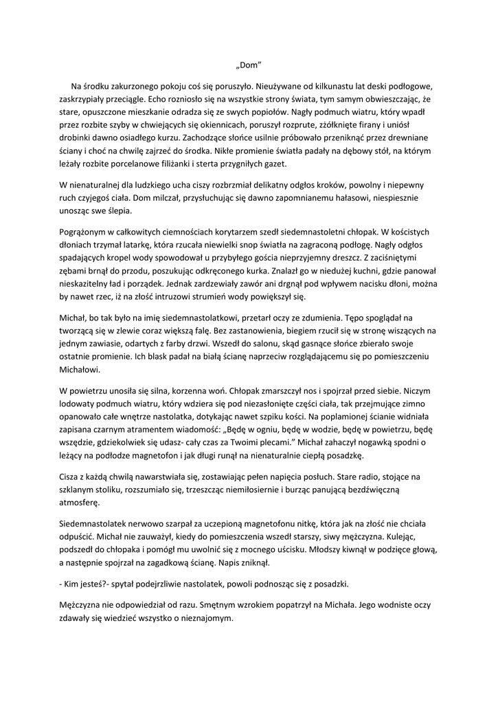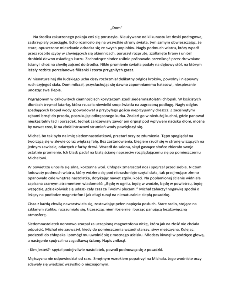 „Dom” Na środku zakurzonego pokoju coś się poruszyło. Nieużywane od kilkunastu lat deski podłogowe, zaskrzypiały przeciągle. Echo rozniosło się na wszystkie strony świata, tym samym obwieszczając, że stare, opuszczone mieszkanie odradza się ze swych popiołów. Nagły podmuch wiatru, który wpadł przez rozbite szyby w chwiejących się okiennicach, poruszył rozprute, zżółknięte firany i uniósł drobinki dawno osiadłego kurzu. Zachodzące słońce usilnie próbowało przeniknąć przez drewniane ściany i choć na chwilę zajrzeć do środka. Nikłe promienie światła padały na dębowy stół, na którym leżały rozbite porcelanowe filiżanki i sterta przygniłych gazet. W nienaturalnej dla ludzkiego ucha ciszy rozbrzmiał delikatny odgłos kroków, powolny i niepewny ruch czyjegoś ciała. Dom milczał, przysłuchując się dawno zapomnianemu hałasowi, niespiesznie unosząc swe ślepia. Pogrążonym w całkowitych ciemnościach korytarzem szedł siedemnastoletni chłopak. W kościstych dłoniach trzymał latarkę, która rzucała niewielki snop światła na zagraconą podłogę. Nagły odgłos spadających kropel wody spowodował u przybyłego gościa nieprzyjemny dreszcz. Z zaciśniętymi zębami brnął do przodu, poszukując odkręconego kurka. Znalazł go w niedużej kuchni, gdzie panował nieskazitelny ład i porządek. Jednak zardzewiały zawór ani drgnął pod wpływem nacisku dłoni, można by nawet rzec, iż na złość intruzowi strumień wody powiększył się. Michał, bo tak było na imię siedemnastolatkowi, przetarł oczy ze zdumienia. Tępo spoglądał na tworzącą się w zlewie coraz większą falę. Bez zastanowienia, biegiem rzucił się w stronę wiszących na jednym zawiasie, odartych z farby drzwi. Wszedł do salonu, skąd gasnące słońce zbierało swoje ostatnie promienie. Ich blask padał na białą ścianę naprzeciw rozglądającemu się po pomieszczeniu Michałowi. W powietrzu unosiła się silna, korzenna woń. Chłopak zmarszczył nos i spojrzał przed siebie. Niczym lodowaty podmuch wiatru, który wdziera się pod niezasłonięte części ciała, tak przejmujące zimno opanowało całe wnętrze nastolatka, dotykając nawet szpiku kości. Na poplamionej ścianie widniała zapisana czarnym atramentem wiadomość: „Będę w ogniu, będę w wodzie, będę w powietrzu, będę wszędzie, gdziekolwiek się udasz- cały czas za Twoimi plecami.” Michał zahaczył nogawką spodni o leżący na podłodze magnetofon i jak długi runął na nienaturalnie ciepłą posadzkę. Cisza z każdą chwilą nawarstwiała się, zostawiając pełen napięcia posłuch. Stare radio, stojące na szklanym stoliku, rozszumiało się, trzeszcząc niemiłosiernie i burząc panującą bezdźwięczną atmosferę. Siedemnastolatek nerwowo szarpał za uczepioną magnetofonu nitkę, która jak na złość nie chciała odpuścić. Michał nie zauważył, kiedy do pomieszczenia wszedł starszy, siwy mężczyzna. Kulejąc, podszedł do chłopaka i pomógł mu uwolnić się z mocnego uścisku. Młodszy kiwnął w podzięce głową, a następnie spojrzał na zagadkową ścianę. Napis zniknął. - Kim jesteś?- spytał podejrzliwie nastolatek, powoli podnosząc się z posadzki. Mężczyzna nie odpowiedział od razu. Smętnym wzrokiem popatrzył na Michała. Jego wodniste oczy zdawały się wiedzieć wszystko o nieznajomym. - Nie potrzeba ci wiedzieć. Niedługo o mnie zapomnisz, chłopcze.- Kiedy przemówił, zdawało się, jakby zamiast zwyczajnego głosu posiadał na własność rechot ropuchy połączony z szorstką drewnianą powierzchnią. - Nie rozumiem pana. - Zaufaj swoim przypuszczeniom. Ja, jako duch tego domu, nie mogę zdradzić swojej tożsamości.umilkł. Na jego twarzy pojawił się cień uśmiechu, który szybko znikł. Można by nawet powiedzieć, iż był tylko przywidzeniem. W milczeniu lustrował wzrokiem zdezorientowanego Michała. Podobał mu się grymas świeżo wschodzącego strachu i niepewności. Czuł wyraźnie, bijące od młodzieńca zagubienie, uczucie, które on- strażnik domu, umiłował najbardziej. Wiedział jednak, że czym prędzej musi wykonać swoją misję, nie mógł już dłużej zwlekać. W innym wypadku gorzko pożałowałby swojego nieposłuszeństwa. Na samą myśl mężczyznę oblały zimne poty. Staruszek z cichym westchnieniem ruszył przed siebie, a następnie wszedł w niewielki korytarz po lewej. Chłopak poszedł za nim. Z sufitu zwisały obrośnięte zielonym grzybem lampy, a zgniłe ściany sprawiały odpychające wrażenie tak, jakby to one były winne wszystkim epidemiom na całym świecie. Starszy człowiek zatrzymał się u progu pomieszczenia, z wnętrza którego biła potężna ciemność. Mężczyzna wszedł do środka. Michał z wahaniem zrobił to samo i natychmiast fala strachu przebiegła po jego kręgosłupie. Delikatny odgłos szurania dobiegł do jego przewrażliwionych uszu. Kiedy chciał się cofnąć i uciec jak najprędzej, coś mu przeszkodziło, coś, co zaczęło wspinać się po jego nogawkach i pięło się w górę w niebezpiecznie szybkim tempie. Nagle płomień ognia wystrzelił w górę po drugiej stronie pokoju, tym samym zapalając się w miejscu, gdzie znajdował się przestarzały kominek. Snop światła, który przy tym się utworzył, oświetlił pomieszczenie tajemniczym blaskiem. Pokój przypominał dawno opuszczony salon. Nastolatek spojrzał na swoją bluzę, po której pełzły dwa pająki wielkości połowy ręki dorosłego człowieka. Michał szukał wzrokiem starszego pana, który na nieszczęście gdzieś przepadł. Gdy rozbrzmiał ciężki odgłos czegoś masywnego, spadającego na ziemię, zwierzęta ustąpiły, w pośpiechu uciekając w zakurzone kąty. Nastolatek zaczął się powoli wycofywać. Jednak znieruchomiał, widząc przed sobą, śledzące jego ruchy, obrzydliwe żółte ślepia tak duże, jak napompowana opona roweru. W jednej sekundzie ogień zgasł, 