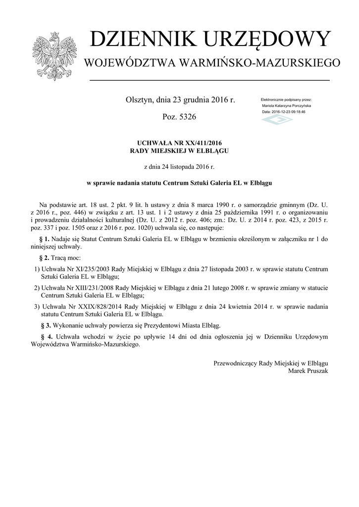 DZIENNIK URZĘDOWY WOJEWÓDZTWA WARMIŃSKO-MAZURSKIEGO Olsztyn, dnia 23 grudnia 2016 r. Elektronicznie podpisany przez: Mariola Katarzyna Porczyńska Data: 2016-12-23 09:18:46 Poz. 5326 UCHWAŁA NR XX/411/2016 RADY MIEJSKIEJ W ELBLĄGU z dnia 24 listopada 2016 r. w sprawie nadania statutu Centrum Sztuki Galeria EL w Elblągu Na podstawie art. 18 ust. 2 pkt. 9 lit. h ustawy z dnia 8 marca 1990 r. o samorządzie gminnym (Dz. U. z 2016 r., poz. 446) w związku z art. 13 ust. 1 i 2 ustawy z dnia 25 października 1991 r. o organizowaniu i prowadzeniu działalności kulturalnej (Dz. U. z 2012 r. poz. 406; zm.: Dz. U. z 2014 r. poz. 423, z 2015 r. poz. 337 i poz. 1505 oraz z 2016 r. poz. 1020) uchwala się, co następuje: § 1. Nadaje się Statut Centrum Sztuki Galeria EL w Elblągu w brzmieniu określonym w załączniku nr 1 do niniejszej uchwały. § 2. Tracą moc: 1) Uchwała Nr XI/235/2003 Rady Miejskiej w Elblągu z dnia 27 listopada 2003 r. w sprawie statutu Centrum Sztuki Galeria EL w Elblągu; 2) Uchwała Nr XIII/231/2008 Rady Miejskiej w Elblągu z dnia 21 lutego 2008 r. w sprawie zmiany w statucie Centrum Sztuki Galeria EL w Elblągu; 3) Uchwała Nr XXIX/828/2014 Rady Miejskiej w Elblągu z dnia 24 kwietnia 2014 r. w sprawie nadania statutu Centrum Sztuki Galeria EL w Elblągu. § 3. Wykonanie uchwały powierza się Prezydentowi Miasta Elbląg. § 4. Uchwała wchodzi w życie po upływie 14 dni od dnia ogłoszenia jej w Dzienniku Urzędowym Województwa Warmińsko-Mazurskiego. Przewodniczący Rady Miejskiej w Elblągu Marek Pruszak Dziennik Urzędowy Województwa Warmińsko-Mazurskiego –2– Poz. 5326 Załącznik do Uchwały Nr XX/411/2016 Rady Miejskiej w Elblągu z dnia 24 listopada 2016 r. STATUT CENTRUM SZTUKI GALERIA EL W ELBLĄGU Rozdział 1. Postanowienia ogólne § 1. 1. Centrum Sztuki Galeria EL, zwana dalej Galerią EL, jest samorządową instytucją kultury za pomocą której Miasto Elbląg wykonuje zadania własne z zakresu prowadzenia działalności kulturalnej 2. Galeria EL została utworzona uchwałą Nr 82/555/72 Prezydium Miejskiej Rady Narodowej w Elblągu z dnia 28.08.1972 r. i działa na podstawie: 1) ustawy z dnia 8 marca 1990 r. o samorządzie gminnym (t. j. Dz. U. z 2016 r. poz. 446). 2) ustawy z dnia 25 października 1991 r. o organizowaniu i prowadzeniu działalności kulturalnej.(Dz. U. z 2012 r. poz. 406; zm.: Dz. U. z 2014 r. poz. 423, z 2015 r. poz. 337 i poz. 1505 oraz z 2016 r. poz. 1020); 3) ustawy z dnia 27 sierpnia 2009 r. o finansach publicznych Dz. U. z 2016 poz. 1454; 4) aktu utworzenia oraz statutu nadanego przez Organizatora. § 2. 1. Organizatorem Centrum Sztuki Galeria EL jest Gmina Miasto Elbląg, zaś nadzór nad Galerią EL sprawuje Prezydent Miasta Elbląg. 2. Galeria EL jest samorządową instytucja kultury, wyodrębnioną pod względem organizacyjnym oraz ekonomiczno-finansowym, posiadającym osobowość prawną i wpisaną do rejestru instytucji kultury, prowadzona przez Organizatora. § 3. 1. Siedziba Galerii EL mieści się w Elblągu przy ul. Kuśnierskiej 6. Terenem działania Galerii EL jest obszar Rzeczypospolitej Polskiej. W celu realizacji zadań statutowych Galeria EL może działać również poza jej granicami. 2. Galeria EL używa pieczęci podłużnej, zawierającą pełną nazwę oraz dane teleadresowe. Rozdział 2. Przedmiot i zakres działania § 4. Galeria EL jest instytucją kultury, której celem jest prezentacja szeroko pojętych działań w zakresie sztuk wizualnych. § 5. Galeria EL działa w szczególności poprzez 1) prezentację i propagowanie współczesnej twórczości artystycznej w jej różnych dziedzinach - zgodnie z ideą działania interdyscyplinarnego: a) organizację wystaw w kraju i poza granicami; b) prowadzenie działalności wydawniczej; c) organizację przedsięwzięć artystycznych, kulturalnych i naukowych, takich jak konferencje, sympozja, koncerty, wykłady, projekcje filmowe oraz innych imprez kulturalno-artystycznych zleconych przez organizatora; 2) edukację kulturalną oraz kształtowanie postawy aktywnego uczestnictwa w kulturze; 3) współpracę z innymi instytucjami, stowarzyszeniami twórczymi i fundacjami działającymi w zakresie prezentacji i popularyzacji sztuk wizualnych, muzyki i edukacji kulturalnej; 4) dokonywanie zakupów dzieł sztuki współczesnej, wydawnictw oraz innych dóbr kultury i gromadzenie ich we własnych zbiorach i kolekcjach; Dziennik Urzędowy Województwa Warmińsko-Mazurskiego –3– Poz. 5326 5) gromadzenie i naukowe opracowanie dokumentacji z zakresu działalności Galerii EL oraz środowiska elbląskiego; 6) obrót dziełami sztuki oraz wydawnictwami z zakresu sztuki oraz pośrednictwo w ich zdobywaniu 7) udostępnianie zbiorów oraz archiwum Galerii EL do celów wystawienniczych, naukowych i edukacyjnych; 8) prowadzenie działalności w zakresie usług scenicznych, muzycznych, teatralnych; 9) sprawowanie mecenatu nad formami przestrzennymi powstałymi podczas Biennale Form Przestrzennych w latach 1965-1973 oraz innych plenerów organizowanych przez Galerię EL - gromadzenie i opracowywanie dokumentacji dotyczącej form przestrzennych i jej promocję. Rozdział 3. Organizacja i kierownictwo § 6. 1. Zasady wewnętrznej organizacji, strukturę i zakres działania komórek organizacyjnych Galerii EL określa regulamin organizacyjny nadawany przez Dyrektora Galerii EL po zasięgnięciu opinii Organizatora oraz opinii działających w niej organizacji związkowych i stowarzyszeń twórców § 7. 1. Galerią EL zarządza i reprezentuje ją na zewnątrz Dyrektor 2. Dyrektor organizuje pracę Galerii EL, zapewnia właściwe wykonywanie zadań statutowych oraz ponosi pełną odpowiedzialność za prawidłową gospodarkę środkami finansowymi § 8. Dyrektora powołuje i odwołuje Prezydent Miasta Elbląg w trybie i na zasadach przewidzianych w obowiązujących przepisach Rozdział 4. Majątek i finanse Galerii EL § 9. 1. Galeria EL prowadzi samodzielnie gospodar