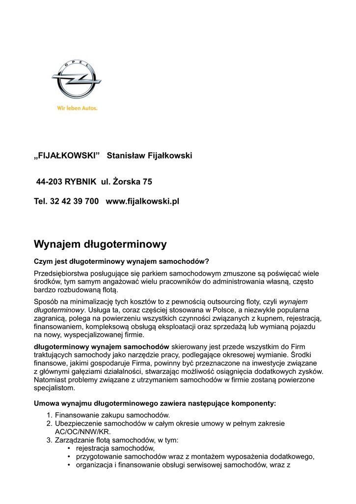 „FIJAŁKOWSKI” Stanisław Fijałkowski 44-203 RYBNIK ul. Żorska 75 Tel. 32 42 39 700 www.fijalkowski.pl Wynajem długoterminowy Czym jest długoterminowy wynajem samochodów? Przedsiębiorstwa posługujące się parkiem samochodowym zmuszone są poświęcać wiele środków, tym samym angażować wielu pracowników do administrowania własną, często bardzo rozbudowaną flotą. Sposób na minimalizację tych kosztów to z pewnością outsourcing floty, czyli wynajem długoterminowy. Usługa ta, coraz częściej stosowana w Polsce, a niezwykle popularna zagranicą, polega na powierzeniu wszystkich czynności związanych z kupnem, rejestracją, finansowaniem, kompleksową obsługą eksploatacji oraz sprzedażą lub wymianą pojazdu na nowy, wyspecjalizowanej firmie. długoterminowy wynajem samochodów skierowany jest przede wszystkim do Firm traktujących samochody jako narzędzie pracy, podlegające okresowej wymianie. Środki finansowe, jakimi gospodaruje Firma, powinny być przeznaczone na inwestycje związane z głównymi gałęziami działalności, stwarzając możliwość osiągnięcia dodatkowych zysków. Natomiast problemy związane z utrzymaniem samochodów w firmie zostaną powierzone specjalistom. Umowa wynajmu długoterminowego zawiera następujące komponenty: 1. Finansowanie zakupu samochodów. 2. Ubezpieczenie samochodów w całym okresie umowy w pełnym zakresie AC/OC/NNW/KR. 3. Zarządzanie flotą samochodów, w tym: • rejestracja samochodów, • przygotowanie samochodów wraz z montażem wyposażenia dodatkowego, • organizacja i finansowanie obsługi serwisowej samochodów, wraz z zapewnieniem samochodu zastępczego na czas niesprawności samochodu właściwego, • organizacja likwidacji szkód komunikacyjnych wraz z zapewnieniem samochodu zastępczego na czas wyłączenia z ruchu samochodu właściwego (dotyczy również szkód kradzieżowych i całkowitych), • organizacja i finansowanie sezonowej wymiany ogumienia, oraz wymiany ogumienia na skutek jego eksploatacyjnego zużycia, • organizacja i finansowanie opieki assistance w razie awarii na drodze (holowanie samochodu, opieka nad kierowcą). 4. Odbiór samochodów po okresie umowy. 5. Sprzedaż samochodów po okresie umowy. Korzyści dla Klienta, jakie daje długoterminowy wynajem samochodów: • Brak obciążania zdolności kredytowej, wynajem długoterminowy pozwala zachować płynność finansową. • Możliwość przeznaczenia środków finansowych na rozwój głównej działalności. • Precyzyjny budżet, stałe − niezmienne − koszty w czasie trwania umowy. • Wszystkie opłaty ujęte w ratach czynszowych (miesięcznych). • Opłata za wynajem zaliczana w koszty uzyskania przychodu. • Samochód zastępczy w przypadku wszelkich napraw, przeglądów okresowych bądź napraw blacharsko – lakierniczych. • Pokrywamy wszystkie koszty eksploatacyjne (klient zakupuje jedynie paliwo oraz płyn do spryskiwacza). Zainteresowany? Skontaktuj się z nami Henryk Pineles samochody dostawcze i flota B2B & Fleet manager [email protected] +48 609 69 31 32 +48 / 32 42 39 700
