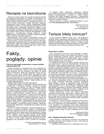 uniwersytet zielonogórski Q k w i e c i e ń - m a j Recepta na bezrobocie Obecnie na terenie całego kraju została zainicjowana kampania organizacji społecznych pt. „Recepta na bezrobocie”. Zespół ekspertów pracujących społecznie w ramach Centrum im. Adama Smitha stworzył Ustawę o likwidacji bezrobocia i naprawie finansów publicznych, będącą kamieniem węgielnym przygotowanej przez Centrum spójnej i długofalowej strategii wychodzenia z kryzysu. W chwili obecnej budowana jest szeroka Koalicja osób i organizacji społecznych mająca na celu wprowadzenie do Sejmu projektu ustawy, trwa zbieranie podpisów obywateli popierających projekt ustawy. Biorąc pod uwagę brak zaufania wielu cennych środowisk obywatelskich do partii politycznych i skomplikowaną sytuację polityczną, została podjęta decyzja o wprowadzeniu do Sejmu projektu popartego, przez co najmniej 100 tysięcy obywateli. Najważniejszym celem wydania projektowanej ustawy jest praktyczna likwidacja fiskalnych przyczyn bezrobocia w Polsce. Druga kwestia to zasady finansowania sektora publicznego. Zamierzeniem projektu jest takie ich skonstruowanie, by sektor samorządowy mógł mieć przypisane dochody w całości finansujące jego wydatki. Tylko w taki sposób może zostać realizowana idea niezależności samorządów. Fakty, poglądy, opinie Francuzi zapraszają naukowców z nowych państw członkowskich UE Francja przewiduje po rozszerzeniu UE okres przejściowy do pięciu lat, nim pracownicy z Polski i innych nowych krajów będą mogli swobodnie się tam zatrudniać. Nie będzie on jednak dotyczyć naukowców. Mogą bez ograniczeń ruszyć nad Sekwanę już 1 maja. W ten sposób Paryż chce wesprzeć swoją naukę i zapełnić miejsca po tych, którzy wyjeżdżają za ocean. Być może wcześniej niż inni do pracy we Francji będą mogli wyjechać także pracownicy służby zdrowia. Decyzję w tej sprawie pozostawiono władzom lokalnym - będzie zależna od miejscowego zapotrzebowania. Dymisje wśród szefów francuskich laboratoriów Konflikt między rządem a naukowcami, którzy finansowani są w większości z publicznych pieniędzy, narastał od początku roku. Naukowcy są oburzeni, że rząd nie realizuje obietnic zwiększenia nakładów na badania naukowe, a - wręcz przeciwnie - redukuje środki i zatrudnienie w tej dziedzinie. W styczniu naukowcy z najbardziej znanych ośrodków, m.in. medycznego Insermu, Instytutu Pasteura, Instytutu Pierre'a i Marie Curie, biomedycznego Instytutu Cochin, umieścili w internecie petycję do rządu. Do dziś podpisało ją już ponad 66 tys. ze 105 tys. naukowców zatrudnianych w sektorze publicznym. Rząd próbował łagodzić nastroje, proponując dodatkowe 3 mld euro na naukę w latach 2005-07. Zapowiedział też stworzenie nowej instytucji, podobnej do polskiego Komitetu Badań Naukowych, która oceniałaby i finansowała projekty badawcze. Naukowcy przyjęli jednak deklarację o pieniądzach jako kolejną obietnicę bez pokrycia. (...) Ponad 2 tys. szefów laboratoriów i zespołów badawczych zebrało się w budynku paryskiego ratusza. W przytłaczającej większości zagłosowali za tym, by wspólnie podać się do dymisji z pełnionych przez siebie funkcji administracyjnych. Decyzje składali następnie na piśmie. Przed ratuszem demonstrowało 1,5 tys. badaczy, którzy popierają decyzję swoich szefów. Później wyruszyli pod ministerstwo nauki.Demonstracje odbyły się także w innych silnych ośrodkach naukowych Francji Strasburgu (we wschodniej Francji) i Nantes (na zachodzie). (...) Dominika Pszczółkowska, afp, ap Gazeta Wyborcza, 10 marca nr 4-5 (122-123) 2 0 0 4 45 W Zielonej Górze planowana inauguracja kampanii (31.03.2004) rozpocznie się od przyjazdu do naszego miasta dr Roberta Gwiazdowskiego z Centrum im. Adama Smitha. W planach jest ogólno dostępne spotkanie z mieszkańcami Zielonej Góry i studentami Uniwersytetu Zielonogórskiego oraz spotkanie z lokalnymi mediami. Więcej informacji nt. kampanii znajdziecie Państwo na stronach: www.odpowiedzialnosc.org i www.smith.pl Bartłomiej Kobiernik tel. 692-85-09-09 mail: [email protected] Tańsze bilety lotnicze? Grupa studentów (WSB-NLU Nowy Sącz i AB Bydgoszcz) stworzyła serwis internetowy www.flyclever.com umożliwiający zamawianie najtańszych biletów lotniczych (kto tego nie szuka bardziej od studentów) do krajów z Europy. I nie tylko. Serwis zapewnia również niezbędne informacje potrzebne w czasie podróży samolotem. Oto link: http://www.flyclever.com/index1.htm ap Dziennikarz w klatce Znani dziennikarze, wśród nich Jacek Żakowski z „Polityki”, dali się zamknąć w klatce, która stanęła przed Sejmem. W ten sposób protestowali przeciwko karaniu więzieniem Andrzeja Marka z „Wieści Polickich” za krytykę władzy. Jasne, że dziennikarze próbują chronić swój zawód, ale czy sędziowie pozbawieni są całkowicie racji w tym sporze? To zresztą nie pierwszy i nie jedyny wypadek iskrzenia między dziennikarzami i wymiarem sprawiedliwości. Emerytowany dziennikarz został właśnie prawomocnie skazany za to, że w książce o olsztyńskiej Solidarności przytoczył za podziemnym pismem związkowym poniżającą opinię o pani sędzi, przez której rzekomą nadgorliwość miał ktoś z powodów politycznych stracić pracę. Dziennikarz popełnił błąd; nie sprawdził rzetelności źródła (żeby choć zaznaczył, że to cytat...). Chciał publicznie przeprosić, sprostować, ale tryby machiny sprawiedliwości już ruszyły. Efekt? Osiem miesięcy kary pozbawienia wolności z warunkowym zawieszeniem jej wykonania na dwa lata. (...) Co zaś różni dwie opisane przez media dziennikarskie sprawy? Stosunek podsądnego zarówno do pokrzywdzonego jak i do wyroku. Olsztyński dziennikarz przeprosił, sprostował, będzie zabiegał o kasację w przewidzianym trybie. Dziennikarz z Polic nie przeprosi za nic, nie ubiegał się o kasację, bo to sądy narobiły 