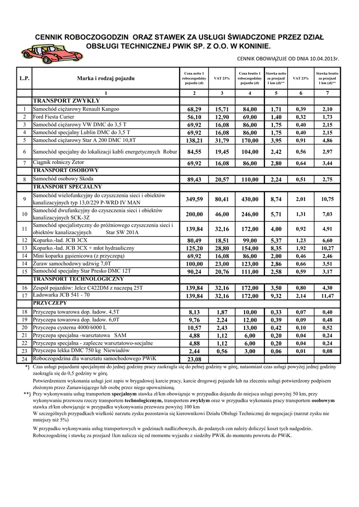 CENNIK ROBOCZOGODZIN ORAZ STAWEK ZA USŁUGI ŚWIADCZONE PRZEZ DZIAŁ OBSŁUGI TECHNICZNEJ PWIK SP. Z O.O. W KONINIE. CENNIK OBOWIĄZUJE OD DNIA 10.04.2013r. L.P. Marka i rodzaj pojazdu Cena netto 1 roboczogodziny pojazdu (zł) VAT 23% Cena brutto 1 roboczogodziny pojazdu (zł) Stawka netto za przejazd 1 km (zł)** VAT 23% Stawka brutto za przejazd 1 km (zł)** 1 2 3 4 5 6 7 TRANSPORT ZWYKŁY 1 2 3 4 5 Samochód ciężarowy Renault Kangoo Ford Fiesta Curier Samochód ciężarowy VW DMC do 3,5 T Samochód specjalny Lublin DMC do 3,5 T Samochod ciężarowy Star A 200 DMC 10,8T 68,29 56,10 69,92 69,92 138,21 15,71 12,90 16,08 16,08 31,79 84,00 69,00 86,00 86,00 170,00 1,71 1,40 1,75 1,75 3,95 0,39 0,32 0,40 0,40 0,91 2,10 1,73 2,15 2,15 4,86 6 Samochód specjalny do lokalizacji kabli energetycznych Robur 84,55 19,45 104,00 2,42 0,56 2,97 7 Ciągnik rolniczy Zetor TRANSPORT OSOBOWY Samochód osobowy Skoda TRANSPORT SPECJALNY 69,92 16,08 86,00 2,80 0,64 3,44 89,43 20,57 110,00 2,24 0,51 2,75 349,59 80,41 430,00 8,74 2,01 10,75 200,00 46,00 246,00 5,71 1,31 7,03 139,84 32,16 172,00 4,00 0,92 4,91 80,49 125,20 69,92 100,00 90,24 18,51 28,80 16,08 23,00 20,76 99,00 154,00 86,00 123,00 111,00 5,37 8,35 2,00 2,86 2,58 1,23 1,92 0,46 0,66 0,59 6,60 10,27 2,46 3,51 3,17 139,84 139,84 32,16 32,16 172,00 172,00 3,50 9,32 0,80 2,14 4,30 11,47 8,13 9,76 10,57 4,88 4,88 2,44 23,08 1,87 2,24 2,43 1,12 1,12 0,56 10,00 12,00 13,00 6,00 6,00 3,00 0,33 0,39 0,42 0,20 0,20 0,06 0,07 0,09 0,10 0,04 0,04 0,01 0,40 0,48 0,52 0,24 0,24 0,08 8 9 10 11 12 13 14 14 15 Samochód wielofunkcyjny do czyszczenia sieci i obiektów kanalizacyjnych typ 13,0/229 P-WRD IV MAN Samochód dwufunkcyjny do czyszczenia sieci i obiektów kanalizacyjnych SCK-3Z Samochód specjalistyczny do próżniowego czyszczenia sieci i obiektów kanalizacyjnych Star SW 201A Koparko.-ład. JCB 3CX Koparko.-ład. JCB 3CX + młot hydrauliczny Mini koparka gąsienicowa (z przyczepą) Żuraw samochodowy udżwig 7,0T Samochód specjalny Star Presko DMC 12T TRANSPORT TECHNOLOGICZNY 16 Zespół pojazdów: Jelcz C422DM z naczepą 25T 17 Ładowarka JCB 541 - 70 PRZYCZEPY 18 19 20 21 22 23 24 *) Przyczepa towarowa dop. ładow. 4,5T Przyczepa towarowa dop. ładow. 6,0T Przyczepa cysterna 4000/6000 L Przyczepa specjalna -warsztatowa SAM Przyczepa specjalna - zaplecze warsztatowo-socjalne Przyczepa lekka DMC 750 kg Niewiadów Roboczogodzina dla warsztatu samochodowego PWiK Czas usługi pojazdami specjalnymi do jednej godziny pracy zaokragla się do pełnej godziny w górę, nataomiast czas usługi powyżej jednej godziny zaokrągla się do 0,5 godziny w górę. Potwierdzeniem wykonania usługi jest zapis w brygadowej karcie pracy, karcie drogowej pojazdu lub na zleceniu usługi potwierdzony podpisem złożonym przez Zamawiającego lub osobę przez niego upoważnioną. **) Przy wykonywaniu usług transportem specjalnym stawka zł/km obowiązuje w przypadku dojazdu do miejsca uslugi powyżej 50 km, przy wykonywaniu przewozu rzeczy transportem technologicznym, transportem zwykłym oraz w przypadku wykonania pracy transportem osobowym stawka zł/km obowjązuje w przypadku wykonywania przewozu powyżej 100 km W szczególnych przypadkach wielkość narzutu zysku pozostawia się kierownikowi Działu Obsługi Technicznej do negocjacji (narzut zysku nie mniejszy niż 5%) W przypadku wykonywania usług transportowych w godzinach nadliczbowych, do podanych cen należy doliczyć koszt tych nadgodzin . Roboczogodzinę i stawkę za przejazd 1km nalicza się od momentu wyjazdu z siedziby PWiK do momentu powrotu do PWiK.
