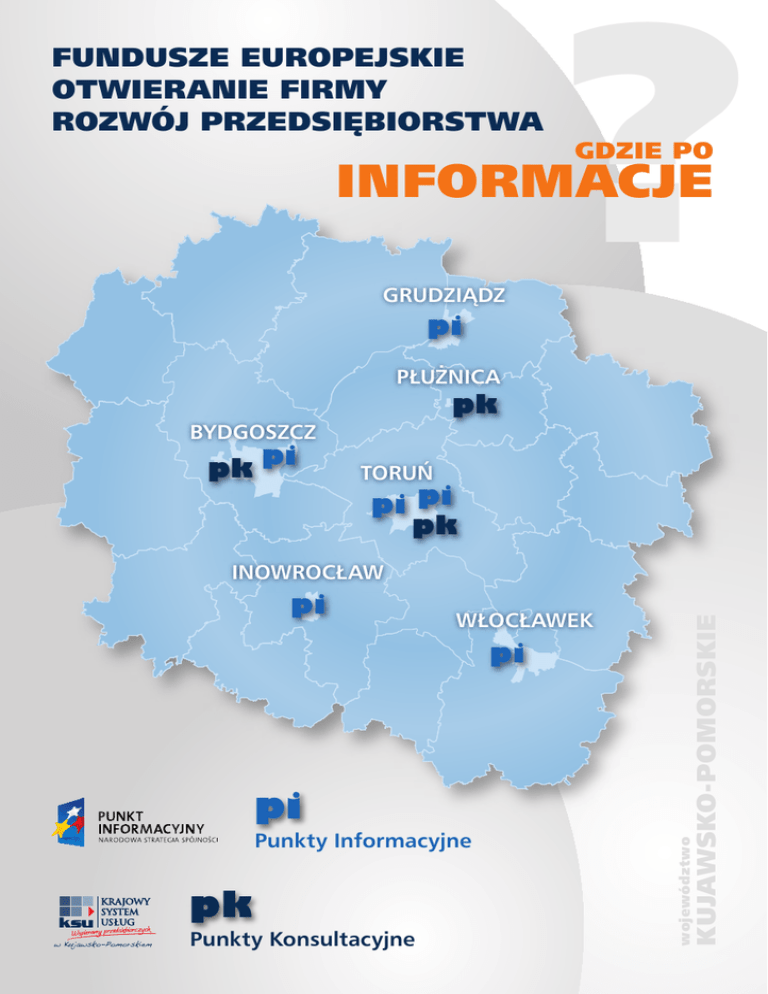 FUNDUSZE EUROPEJSKIE OTWIERANIE FIRMY ROZWÓJ PRZEDSIĘBIORSTWA ? GDZIE PO INFORMACJE GRUDZIĄDZ pi PŁUŻNICA pk BYDGOSZCZ pk pi TORUŃ pi pi pk WŁOCŁAWEK pi pi Punkty Informacyjne pk Punkty Konsultacyjne województwo pi KUJAWSKO-POMORSKIE INOWROCŁAW Punkty Informacyjne Funduszy Europejskich W ramach informacji o pozyskiwaniu funduszy europejskich oferujemy: • doradztwo w zakresie możliwości rozpoczęcia działalności gospodarczej ze środków europejskich; • zaklasyfikowanie pomysłu na projekt do konkretnych działań w programach Narodowej Strategii Spójności; • konsultacje w zakresie podstawowych procedur, a także warunków i kryteriów dofinansowania projektu. Ponadto: • pomagamy w procesie rozliczania projektów, informując o wymogach formalnych i opisach dokumentów; • zapoznajemy z zakresem realizacji projektów z zastosowaniem formuły partnerstwa publiczno-prywatnego; • udzielamy podstawowych informacji o funduszach pożyczkowych i poręczeniowych. Oferujemy Państwu także: • spotkania informacyjne i szkolenia; • konsultacje podczas dyżurów w urzędach gmin i miast oraz starostwach powiatowych, a także na stoiskach funduszowych podczas plenerowych imprez promocyjnych; • nieodpłatne publikacje dotyczące funduszy europejskich. Dla kogo informacje: – dla przedsiębiorców, – dla jednostek samorządu terytorialnego, – dla stowarzyszeń i organizacji pozarządowych, – dla uczniów i studentów, – dla osób zainteresowanych udziałem w szkoleniach dofinansowanych ze środków Europejskiego Funduszu Społecznego, – dla wszystkich chcących pozyskać informacje o funduszach europejskich. Wszystkie wymienione usługi oferujemy Państwu bezpłatnie. Nasi konsultanci dokładają wszelkich starań, aby usługi informacyjno-promocyjne Sieci Punktów Informacyjnych Funduszy Europejskich pomagały Państwu w realizacji funduszowych pomysłów i projektów. Zapraszamy do osobistego, telefonicznego lub e-mailowego kontaktu z Siecią PIFE. Projekt współfinansowany ze środków Europejskiego Funduszu Rozwoju Regionalnego oraz środków budżetu państwa w ramach Programu Operacyjnego Pomoc Techniczna na lata 2007-2013 Punkty Konsultacyjne Krajowego Systemu Usług Planujesz OTWARCIE firmy? Posiadamy specjalną ofertę dla osób przedsiębiorczych, które zamierzają spróbować sił we własnym biznesie. W jednym miejscu możesz uzyskać informacje z zakresu zakładania działalności, m.in. na temat: • kolejnych kroków, które należy wykonać przed rejestracją działalności gospodarczej; • dokumentów niezbędnych do rejestracji działalności; • dostępnych na rynku środków finansowych na otwarcie firmy, np. pożyczek. Następnie możesz skorzystać z pomocy doradcy, który poprowadzi Cię przez wszystkie etapy związane z procesem otwierania firmy oraz pomoże wypełnić niezbędne dokumenty. Zakres doradztwa obejmuje m.in. pomoc w: • doborze profilu planowanej działalności; • pozyskaniu środków finansowych na założenie przedsiębiorstwa; • wyborze odpowiedniej formy opodatkowania; • przygotowaniu biznesplanu przedsięwzięcia; • przygotowaniu dokumentów niezbędnych do rejestracji firmy; • rejestracji działalności gospodarczej w bazie CEIDG. Jesteś PRZEDSIĘBIORCĄ i chcesz rozwinąć działalność? Oferujemy informacje dla przedsiębiorstw z zakresu prowadzenia działalności gospodarczej, na temat usług oferowanych przez inne instytucje otoczenia biznesu oraz doradztwo, które obejmuje: • wymogi formalno-prawne dotyczące prowadzenia działalności gospodarczej, np. pomoc w składaniu dokumentów do ZUS, Urzędu Skarbowego, jednostek administracji rządowej i samorządowej; • marketing – w tym konsultacje w zakresie przygotowania planu marketingowego, budowania relacji z klientami i podwykonawcami, opracowanie materiałów promocyjnych (np. ulotki), wykorzystanie nowoczesnych narzędzi marketingowych; • organizacja przedsiębiorstwa – m.in. konsultacje nt.: doboru personelu, podziału obowiązków i odpowiedzialności, struktury organizacyjnej; • finanse przedsiębiorstwa – m.in. pomoc w opracowaniu kosztorysu przedsięwzięcia, pozyskaniu finansowania zewnętrznego, w tym: kredyty kupieckie, factoring, pożyczki i kredyty z sektora pozabankowego, kredyty bankowe długoterminowe, leasing; konsultacje nt. porównywania źródeł finansowania pod względem korzyści ekonomicznych, wyboru formy opodatkowania, postępowania w przypadku zagrożenia utraty płynności finansowej. Usługi informacyjne są bezpłatne. Usługi doradcze są dofinansowane w 90%, a Twój wkład własny wyniesie zaledwie 10 zł netto za godzinę doradztwa. Jako osoba otwierająca firmę, możesz skorzystać maksymalnie z 16 godzin doradztwa, jako przedsiębiorca – z 24 godzin. Całkowity wkład własny będzie wynosił maksymalnie 160 zł lub 240 zł netto. Liczba godzin doradztwa jest uzależniona od indywidualnej diagnozy potrzeb klienta. Projekt współfinansowany ze środków Unii Europejskiej w ramach Europejskiego Funduszu Społecznego Punkty Informacyjne Funduszy Europejskich w województwie kujawsko-pomorskim TORUŃ TORUŃ Główny Punkt Informacyjny Funduszy Europejskich Urząd Marszałkowski Województwa Kujawsko-Pomorskiego Plac Teatralny 2, 87-100 Toruń tel. 56 6218409, 56 6218341 e-mail: [email protected] Główny Punkt Informacyjny Funduszy Europejskich Urząd Marszałkowski Województwa Kujawsko-Pomorskiego ul. Marii Skłodowskiej-Curie 73, 87-100 Toruń tel. 56 6561050, 56 6561055, 56 6561100 e-mail: [email protected] BYDGOSZCZ WŁOCŁAWEK Lokalny Punkt Informacyjny Funduszy Europejskich Przedstawicielstwo Urzędu Marszałkowskiego ul. Jagiellońska 9, 85-950 Bydgoszcz tel. 52 3214059 e-mail: [email protected] Lokalny Punkt Informacyjny Funduszy Europejskich Przedstawicielstwo Urzędu Marszałkowskiego ul. Bechiego 2, 87-800 Włocławek tel. 54 2356712, 54 2356721 e-mail: [email protected] GRUDZIĄDZ INOW
