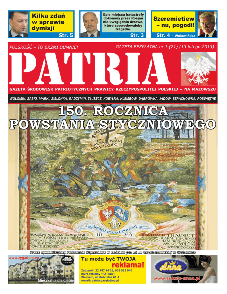 „PATRIA” Kilka zdań w sprawie dymisji Str. 5 POLSKOŚĆ – TO BRZMI DUMNIE! Numer 1 (21), luty 2013 Opis miejsca katastrofy dokonany przez Rosjan nie uwzględnia drzewa, które spowodowałoby tragedię. Str. 3 Szeremietiew – nu, pogodi! Str. 4 1 – Wołomińska GAZETA BEZPŁATNA nr 1 (21) (13 lutego 2013) PATRIA GAZETA ŚRODOWISK PATRIOTYCZNYCH PRAWICY RZECZYPOSPOLITEJ POLSKIEJ – NA MAZOWSZU WOŁOMIN, ZĄBKI, MARKI, ZIELONKA, RADZYMIN, TŁUSZCZ, KOBYŁKA, KLEMBÓW, DĄBRÓWKA, JADÓW, STRACHÓWKA, POŚWIĘTNE 150. ROCZNICA POWSTANIA STYCZNIOWEGO Fresk symbolizujący Powstanie Styczniowe w kościele pw. M. B. Częstochowskiej w Wołominie [email protected] www.gazetapatria.pl 2 Numer 1 (21), luty 2013 „PATRIA” Pożegnaliśmy ks. Kardynała Prymasa Polski Józefa Glempa Prymas Polski Józef Glemp zmarł 23 stycznia 2013 r. wieczorem w warszawskim Wilanowie przeżywszy 83 lat. Drugiego lutego obchodziłby 30 rocznicę kardynalatu. W swojej duszpasterskiej posłudze przez 28 lat był prymasem Polski, a przez ćwierć wieku arcybiskupem metropolitą warszawskim. Śp. Jozef Glemp to także biskup rzymskokatolicki oraz diecezjalny warmiński, a także arcybiskup metropolita gnieźnieński. Kazimierz Andrzej Zych Był prawnikiem, doktoryzował się z obojga praw – świeckiego i kanonicznego. Kawaler Orderu Orła Białego przyznanego w 2009 roku przez śp. Prezydenta RP Lecha Kaczyńskiego. Kilkakrotnie na zaproszenie śp. ks. prałata Jana Sikory gościł w Wołominie w Parafii p.w. MB Częstochowskiej, a także poświęcił Kościół p.w. Św. Józefa Robotnika. Księdza Prymasa mieliśmy zaszczyt gościć w Ossowie, ostatnio w 90. rocznicę Bitwy Warszawskiej i rocznicę śmierci narodowego bohatera ks. mjr Ignacego Skorupki Powstania Styczniowego z jego dyktatorem Sługą Bożym Romualdem Trauguttem. Było to bardzo wymowne i pouczające przemówienie gdyż właśnie 14 sierpnia 2010 r. w 90. rocznicę pokonania Armii Czerwonej władze samorządowe Wołomina w porozumieniu z Kancelarią Prezydenta Komorowskiego usiłowały odsłonić pomnik najeźdźców bolszewickich w Ossowie. Wcześniej w dniu 15 marca 1999 r. tuż przed wyjazdem do Watykanu, delegacja samorządowa miasta i powiatu wołomińskiego gościła u Jego Eminencji z zaproszeniem i prośbą o przyjęcie patronatu honorowego nad 80 rocznicą Bitwy Warszawskiej i uro- Kobylka – nadanie tytułu Bazyliki Mniejszej kośćiołowi pw. Św. Trójcy. Kobylka – nadanie tytułu Bazyliki Mniejszej kośćiołowi pw. Św. Trójcy. oraz podczas uroczystego nadania Tytułu Bazyliki Mniejszej kościołowi Św. Trójcy w Kobyłce. To 14 sierpnia w dniu nadania pośmiertnie Orderu Orła Białego Księdzu Skorupce, przemawiając do wiernych Ks. Prymas przypomniał zasługi tego bohaterskiego kapłana, który poległ pod Ossowem podczas zwycięskiego boju z bolszewikami. Upomniał się również o godne upamiętnienie pomnikiem miejsca Bitwy pod Olszynką Grochowską oraz www.gazetapatria.pl czystościami odsłonięcia pierwszego w Polsce pomnika ks. Ignacego Skorupki. Samorządowcy otrzymali od Ks. Prymasa list polecający do Ojca Świętego Jana Pawła II z prośbą o audiencję, na której Papieżowi Polakowi zostało wręczone zaproszenie na uroczystości rocznicowe Cudu nad Wisłą w Ossowie 15 sierpnia 1999 roku. Jak wszyscy pamiętamy Ojciec Święty lecąc helikopterem do Radzymina nisko nadleciał nad miejsce śmierci Księ- dza Skorupki, kilkakrotnie okrążając licznie zebranych wiernych, pozdrawiając ich z okna papieskiego śmigłowca. Podczas wspomnianego spotkania z Ks. Prymasem, delegacja z Wołomina została zaproszona do wspólnego zdjęcia pod olbrzymim obrazem-arrasem autorstwa Jana Henryka Rosena z 1936r. przedstawiającego Polskę – jako tarczę i przedmurze chrześcijaństwa. W delegacji uczestniczyli: ówczesny burmistrz Wołomina Paweł Solis, starosta Konrad Rytel, przewodniczący Rady Miasta Krzysztof Wytrykus, Kazimierz Andrzej Zych, Mieczysław Romejko, śp. Tadeusz Rosochacki, Waldemar Majewski, Ryszard Walczak oraz ks. sekretarz Grzegorz Kalwarczyk. Następnego dnia tj. 16 marca 1999 roku Jego Eminencja Ks. Prymas Józef Glemp przyjął Honorowy Patronat nad uroczystościami Komitetu „Ossów 2000” Księdza Prymasa , Kardynała Józefa Glempa, wierni z całego kraju zegnali 28 stycznia w Archikatedrze Św. Jana w Warszawie. Przyjechali do Warszawy by towarzyszyć Prymasowi w Jego ostatniej drodze. Pomimo siarczystego mrozu i sypiącego śniegu na zapełnionym po brzegi Placu Zamkowym stało tysiące ludzi przybyłych z różnych zakątków Polski. Mszę żałobną koncelebrował kardynał Stanisław Dziwisz przypominając wiernym drogę życiową zmarłego, oraz Jego zasługi i roztropność w kierowaniu Kościołem w Polsce. W wypełnionym po brzegi kościele w ławach oprócz kilkudziesięciu kardynałów i biskupów można było dostrzec wielu polityków oraz przedstawicieli władzy. Prymas Józef Glemp zgodnie ze swoją wolą spoczął w Krypcie Arcybiskupów Warszawskich w podziemiach archikatedry na warszawskiej Starówce. Kardynał Kazimierz Nycz żegnając Prymasa Glempa odczytał część testamentu zmarłego, które teraz po śmierci zmarłego mają wyjątkową wymowę. TEKST TESTAMENTU Z testamentu ks. kard. Józefa Glempa, Prymasa Polski Najpierw dziękuję Bogu za łaskę wiary i skutki z niej płynące, które mnie niegodnego doprowadziły do przyjęcia sukcesji prymasowskiej, po Słudze Bożym Prymasie Tysiąclecia kard. Stefanie Wyszyńskim, arcybiskupie gnieźnieńskim i warszawskim. (…) Zachowałem zawsze żywą więź z Bogiem, cześć do Matki Najświętszej i świadomość przynależności do Kościoła katolickiego. Przechodząc ze stanu świeckiego do kapłaństwa, zawierzyłem Ossów 14 sierpnia 2010 r. Dwaj prymasi Józef Glemp i Józef Kowalczyk, senator Andrzejewski, ks. pr. Jan Andrzejewski i prof. Józef Szaniawski. moją służbę św. Wojciechowi. Był to akt m
