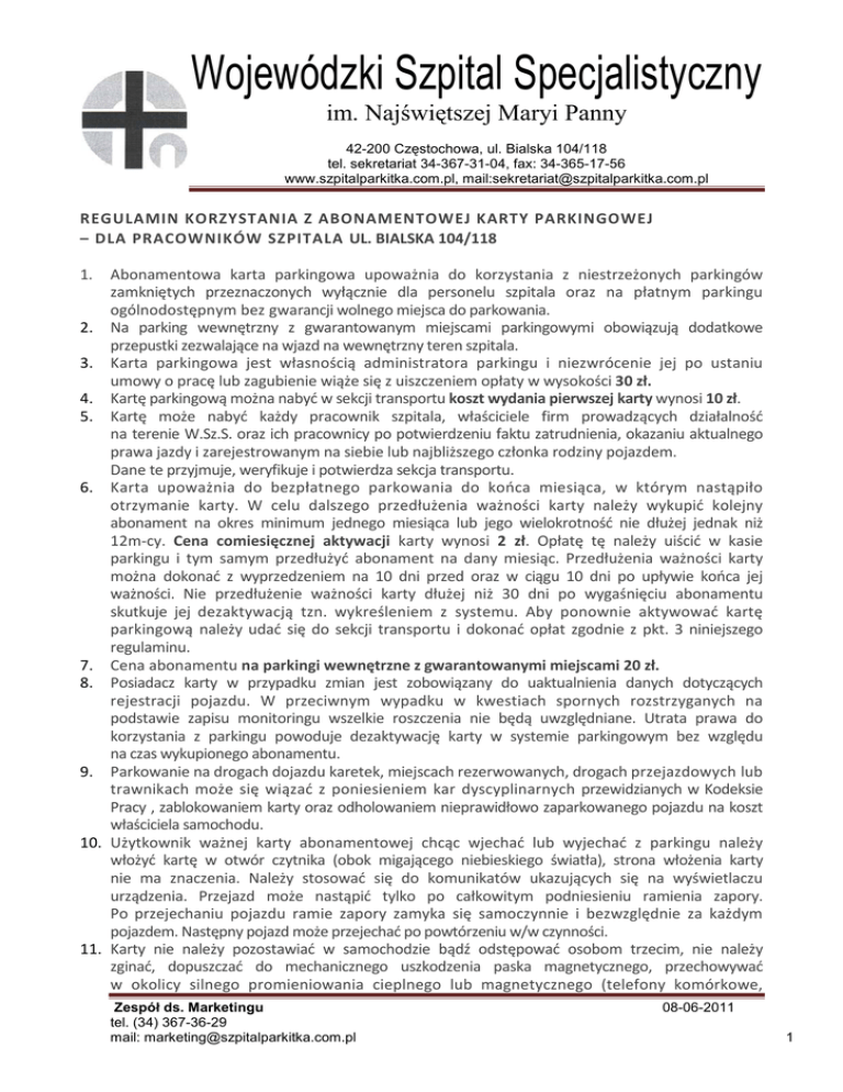 Wojewódzki Szpital Specjalistyczny im. Najświętszej Maryi Panny 42-200 Częstochowa, ul. Bialska 104/118 tel. sekretariat 34-367-31-04, fax: 34-365-17-56 www.szpitalparkitka.com.pl, mail:[email protected] REGULAMIN KORZYSTANIA Z ABONAMENTOWEJ KARTY PARKINGOWEJ – DLA PRACOWNIKÓW SZPITALA UL. BIALSKA 104/118 1. Abonamentowa karta parkingowa upoważnia do korzystania z niestrzeżonych parkingów zamkniętych przeznaczonych wyłącznie dla personelu szpitala oraz na płatnym parkingu ogólnodostępnym bez gwarancji wolnego miejsca do parkowania. 2. Na parking wewnętrzny z gwarantowanym miejscami parkingowymi obowiązują dodatkowe przepustki zezwalające na wjazd na wewnętrzny teren szpitala. 3. Karta parkingowa jest własnością administratora parkingu i niezwrócenie jej po ustaniu umowy o pracę lub zagubienie wiąże się z uiszczeniem opłaty w wysokości 30 zł. 4. Kartę parkingową można nabyć w sekcji transportu koszt wydania pierwszej karty wynosi 10 zł. 5. Kartę może nabyć każdy pracownik szpitala, właściciele firm prowadzących działalność na terenie W.Sz.S. oraz ich pracownicy po potwierdzeniu faktu zatrudnienia, okazaniu aktualnego prawa jazdy i zarejestrowanym na siebie lub najbliższego członka rodziny pojazdem. Dane te przyjmuje, weryfikuje i potwierdza sekcja transportu. 6. Karta upoważnia do bezpłatnego parkowania do końca miesiąca, w którym nastąpiło otrzymanie karty. W celu dalszego przedłużenia ważności karty należy wykupić kolejny abonament na okres minimum jednego miesiąca lub jego wielokrotność nie dłużej jednak niż 12m-cy. Cena comiesięcznej aktywacji karty wynosi 2 zł. Opłatę tę należy uiścić w kasie parkingu i tym samym przedłużyć abonament na dany miesiąc. Przedłużenia ważności karty można dokonać z wyprzedzeniem na 10 dni przed oraz w ciągu 10 dni po upływie końca jej ważności. Nie przedłużenie ważności karty dłużej niż 30 dni po wygaśnięciu abonamentu skutkuje jej dezaktywacją tzn. wykreśleniem z systemu. Aby ponownie aktywować kartę parkingową należy udać się do sekcji transportu i dokonać opłat zgodnie z pkt. 3 niniejszego regulaminu. 7. Cena abonamentu na parkingi wewnętrzne z gwarantowanymi miejscami 20 zł. 8. Posiadacz karty w przypadku zmian jest zobowiązany do uaktualnienia danych dotyczących rejestracji pojazdu. W przeciwnym wypadku w kwestiach spornych rozstrzyganych na podstawie zapisu monitoringu wszelkie roszczenia nie będą uwzględniane. Utrata prawa do korzystania z parkingu powoduje dezaktywację karty w systemie parkingowym bez względu na czas wykupionego abonamentu. 9. Parkowanie na drogach dojazdu karetek, miejscach rezerwowanych, drogach przejazdowych lub trawnikach może się wiązać z poniesieniem kar dyscyplinarnych przewidzianych w Kodeksie Pracy , zablokowaniem karty oraz odholowaniem nieprawidłowo zaparkowanego pojazdu na koszt właściciela samochodu. 10. Użytkownik ważnej karty abonamentowej chcąc wjechać lub wyjechać z parkingu należy włożyć kartę w otwór czytnika (obok migającego niebieskiego światła), strona włożenia karty nie ma znaczenia. Należy stosować się do komunikatów ukazujących się na wyświetlaczu urządzenia. Przejazd może nastąpić tylko po całkowitym podniesieniu ramienia zapory. Po przejechaniu pojazdu ramie zapory zamyka się samoczynnie i bezwzględnie za każdym pojazdem. Następny pojazd może przejechać po powtórzeniu w/w czynności. 11. Karty nie należy pozostawiać w samochodzie bądź odstępować osobom trzecim, nie należy zginać, dopuszczać do mechanicznego uszkodzenia paska magnetycznego, przechowywać w okolicy silnego promieniowania cieplnego lub magnetycznego (telefony komórkowe, Zespół ds. Marketingu tel. (34) 367-36-29 mail: [email protected] 08-06-2011 1 Wojewódzki Szpital Specjalistyczny im. Najświętszej Maryi Panny 42-200 Częstochowa, ul. Bialska 104/118 tel. sekretariat 34-367-31-04, fax: 34-365-17-56 www.szpitalparkitka.com.pl, mail:[email protected] głośniki, radia samochodowe itp.) gdyż grozi to jej uszkodzeniem i wiąże się z poniesieniem kosztów w wysokości 10 zł za wydanie nowej karty. 12. We wszystkich sytuacjach związanych z wydaniem nowej karty następuje przepadek kwot uiszczonych tytułem abonamentu za poprzednią kartę. ADMINISTRATOR Zespół ds. Marketingu tel. (34) 367-36-29 mail: [email protected] DYREKCJA 08-06-2011 2