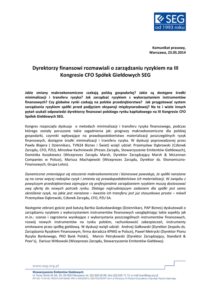 Komunikat prasowy, Warszawa, 23.05.2014 Dyrektorzy finansowi rozmawiali o zarządzaniu ryzykiem na III Kongresie CFO Spółek Giełdowych SEG Jakie zmiany makroekonomiczne czekają polską gospodarkę? Jakie są dostępne środki minimalizacji i transferu ryzyka? Jak zarządzać ryzykiem z wykorzystaniem instrumentów finansowych? Czy globalne rynki czekają na polskie przedsiębiorstwa? Jak przygotować system zarządzania ryzykiem spółki przed podjęciem ekspansji międzynarodowej? Na te i wiele innych pytań szukali odpowiedzi dyrektorzy finansowi polskiego rynku kapitałowego na III Kongresie CFO Spółek Giełdowych SEG. Kongres rozpoczęła dyskusja o metodach minimalizacji i transferu ryzyka finansowego, podczas którego zostały poruszone takie zagadnienia jak: prognozy makroekonomiczne dla polskiej gospodarki, czynniki wpływające na prawdopodobieństwo materializacji poszczególnych ryzyk finansowych, dostępne środki minimalizacji i transferu ryzyka. W dyskusji poprowadzonej przez Pawła Blajera ( Dziennikarz, TVN24 Biznes i Świat) wzięli udział: Przemysław Dąbrowski (Członek Zarządu, CFO, PZU), Mirosław Kachniewski (Prezes Zarządu, Stowarzyszenie Emitentów Giełdowych), Dominika Kozakiewicz (Wiceprezes Zarządu Marsh, Dyrektor Zarządzający Marsh & McLennan Companies w Polsce), Mariusz Machajewski (Wiceprezes Zarządu, Dyrektor ds. EkonomicznoFinansowych, Grupa Lotos). Dynamicznie zmieniające się otoczenie makroekonomiczne i biznesowe powoduje, że spółki narażone są na coraz więcej rodzajów ryzyk i zmienia się prawdopodobieństwo ich materializacji. W związku z powyższym przedsiębiorstwa zajmujące się profesjonalnie zarządzaniem ryzykiem muszą dostosować swą ofertę do nowych potrzeb rynku. Dlatego najtrudniejszym zadaniem dla spółki jest samo określenie ryzyk, na jakie jest narażona – kwestia ich transferu jest już stosunkowo prosta – mówił Przemysław Dąbrowski, Członek Zarządu, CFO, PZU SA. Następnie zebrani goście pod batutą Bartka Godusławskiego (Dziennikarz, PAP Biznes) dyskutowali o zarządzaniu ryzykiem z wykorzystaniem instrumentów finansowych uwzględniając takie aspekty jak m.in.: szanse i zagrożenia wynikające z wykorzystania poszczególnych instrumentów finansowych, rozwój nowych instrumentów na rynku polskim, rachunkowość zabezpieczeń, instrumenty emitowane przez spółkę giełdową. W dyskusji wzięli udział: Andrzej Gałkowski (Dyrektor Zespołu ds. Zarządzania Ryzykiem Finansowym, firma doradcza KPMG w Polsce), Paweł Metrycki (Dyrektor Pionu Ryzyka Bankowego, PKO Bank Polski), Marcin Petrykowski (Dyrektor Zarządzający, Standard & Poor’s), Dariusz Witkowski (Wiceprezes Zarządu, Stowarzyszenie Emitentów Giełdowy). Obecnie rynek finansowy oferuje bardzo szeroki dostęp do instrumentów finansowych zabezpieczających ryzyka rynkowe, obejmujący zarówno instrumenty liniowe (swap, forward) jak i różnego rodzaju opcje. Co do zasady, spółki nie są formalnie ograniczone w zakresie warunków i charakterystyki zawieranych instrumentów. Należy jednak podkreślić, iż kluczem do skutecznego zabezpieczenia ryzyka (jak i bezpieczeństwa całego procesu zarządzania ryzykiem) pozostaje ich prawidłowe dopasowanie do rzeczywistego profilu ryzyka identyfikowanego w spółce. Z tego względu spółka powinna kierować się przy wyborze instrumentów zabezpieczających przede wszystkim ich ekonomicznym dopasowaniem do pozycji zabezpieczanej, a także dodatkowo – zgodnie z najlepszą praktyką rynkową – możliwością zastosowania rachunkowości zabezpieczeń w celu zapewnienia spójności prezentacji w sprawozdaniu finansowym z treścią ekonomiczną powiązania zabezpieczającego – mówił Andrzej Gałkowski, Dyrektor Zespołu ds. Zarządzania Ryzykiem Finansowym, firma doradcza KPMG w Polsce. Oferta produktowa banków w Polsce w zakresie instrumentów zarządzania ryzykiem jest obecnie dobrze rozwinięta. Pomimo tego, że Banki posiadają ofertę dla zabezpieczenia, jeśli nie wszystkich, to większości ryzyk, wciąż najbardziej popularne wśród przedsiębiorców pozostaje zabezpieczanie przez ryzykiem walutowym przy np. ciągle stosunkowo niewielkim wykorzystaniu instrumentów dla zarządzania ryzykiem stopy procentowej czy towarowym. Obszarem, który wymaga ciągłego rozwoju, jest zwiększanie efektywności współpracy pomiędzy bankami a przedsiębiorcami, polegające na dokładanym zdefiniowaniu ryzyk i możliwości ich zabezpieczania, a następnie dobraniu odpowiedniego, zarówno pod względem kosztu jak i skuteczności, instrumentu zarządzania ryzykiem – mówi Paweł Metrycki, Dyrektor Pionu Ryzyka Bankowego, PKO Bank Polski. Debata o ryzykach finansowych związanych z ekspansją zagraniczną zamknęła merytoryczną cześć pierwszego dnia Kongresu. W dyskusji moderowanej przez Andrzeja Steca (Redaktor Naczelny, Gazeta Giełdy Parkiet) wzięli udział: Marcin Burda (Director, Risk Solutions Group responsible for CEE Region, Barclay), Rafał Chwast (Wiceprezes Zarządu, Dyrektor Finansowy, Nowy Styl Group), Dariusz Poniewierka (Prezes Zarządu, Korporacja Ubezpieczeń Kredytów Eksportowych), Ilona Weiss (Wiceprezes Zarządu ds. Finansowych i Operacyjnych, ABC Data). Uczestnicy omówili takie tematy jak: specyfika ryzyk związanych z wyjściem poza rynek krajowy, zarządzanie „ryzykiem ekspansji”, globalne rynki dla lokalnych spółek. Polskim firmom oferujemy rozwiązania całościowe - doradztwo przy akwizycjach, organizację emisji akcji zagranicą lub finansowania dłużnego np. w postaci euroobligacji - mówił Marcin Burda z banku Barclays, Dyrektor Działu Risk Solutions - Dzięki instrumentom zabezpieczającym kurs waluty oraz stopy procentowe, pozwalamy naszym klientom dopasować profil ryzyka przepływów pieniężnych czy wyceny inwestycji zagranicznych. W efekcie, zarząd może spokojnie skoncentrować się na rozwoju biznesu i części operacyjnej firmy. Ucze
