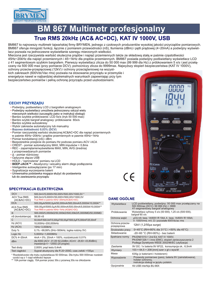 BM 867 Multimetr profesjonalny True RMS 20kHz (AC& AC+DC), KAT IV 1000V, USB BM867 to najnowszy multimetr tajwańskiej firmy BRYMEN, jednego z czołowych producentów wysokiej jakości przyrządów pomiarowych. BM867 oferuje mnogość funkcji, łącznie z pomiarem przewodności (nS), tłumienia (dBm) i pętli prądowej (4~20mA) a podwójny wyświetlacz pozwala na jednoczesne wyświetlanie szeregu mierzonych wielkości. Mierzona jest rzeczywista wartość skuteczna prądów i napięć przemiennych także ze składową stałą w paśmie częstotliwości 45Hz~20kHz dla napięć przemiennych i 45~1kHz dla prądów przemiennych. BM867 posiada podwójny podświetlany wyświetlacz LCD z 41 segmentowym szybkim bargrafem. Pierwszy wyświetlacz zlicza do 50 000 max (99 999 dla Hz) z próbkowaniem 5 x/s i jest przełączany na 500 000 max (przy pomiarze DCV); pomocniczy zlicza do 9999max. Najwyższy stopień bezpieczeństwa (KAT IV 1000V), ochrony przeciw-przepięciowej (12kV) i ochrony przeciążeniowej na wszystkich zakresach (600Vdc/Vac rms) pozwala na stosowanie przyrządu w przemyśle i energetyce nawet w najbardziej ekstremalnych warunkach zapewniając przy tym bezpieczeństwo pomiarów i pełną ochronę przyrządu przed uszkodzeniami. CECHY PRZYRZĄDU • Podwójny, podświetlany LCD z bargrafem analogowym • Podwójny wyświetlacz umożliwia jednoczesny odczyt wielu mierzonych wielkości (szczegóły patrz w instrukcji obsługi) • Bardzo szybkie próbkowanie: LCD 5x/s (tryb 50 000 max) • Bardzo szybki bargraf analogowy: próbkowanie 60x/s • Bardzo szybkie autozakresy • Wybór zakresów automatyczny lub manualny • Bazowa dokładność 0,03% (DCV) • Pomiar rzeczywistej wartości skutecznej AC&AC+DC dla napięć przemiennych w paśmie 45Hz~20kHz i prądów przemiennych w pasmie 45Hz~1kHz • Pomiar konduktancji (nS) i dBm • Bezpośrednie przejście do pomiaru Hz podczas pomiaru ACV i ACA • CREST - pomiar automatyczny MAX, MIN impulsów > 0,8ms • REC - zapamiętanie/wyświetlenie MAX, MIN, AVG (średnia) z przeprowadzanych pomiarów • Δ - pomiar różnicowy • Optyczne złącze USB • HOLD - “zamrożenie” pomiaru na LCD • BEEP-JACK™ - Akustyczny i wizualny alarm złego podłączenia • Inteligentne autowyłączanie (po 17 min) • Sygnalizacja wyczerpania baterii • Uniwersalna podstawka mogąca służyć do postawienia lub do zawieszenia przyrządu SPECYFIKACJA ELEKTRYCZNA DCV ACV True RMS (AC&AC+DC) DCA ACA True RMS (AC&AC+DC) R nS (konduktancja) C Hz (ACV) Hz (ACA) Duty % Logic Hz DC% 4~20mA dBm Test diody Test ciągłości 500,0mV/5,0000V/50,000V/500,00V/1000,0V * 500,0mV/5,0000V/50,000V/500,00V/1000,0V True RMS w paśmie 45Hz~20kHz(AC&AC+DC) 500,00μA/5000,0μA/50,000mA/500,00mA/5,0000A/10,000A** 500,00μA/5000,0μA/50,000mA/500,00mA/5,0000A/10,000A** DANE OGÓLNE Wyświetlacz True RMS w paśmie 45Hz~1kHz (AC&AC+DC) 500,00Ω/5,0500kΩ/50,000kΩ/500,00kΩ/5,0000MΩ/50,000MΩ 99,99 nS 50,00nF/500,0nF/5,000μF/50,00μF/500,0μF/5,000mF/25,00mF 10,000Hz~200,000kHz 10Hz~3,000kHz 0,1% ~99,99% (5Hz~500kHz, logika rodziny 5V) 5,000Hz~1,0000MHz 4mA = 0%; 20mA = 100%, rozdzielczość 0,01% dla 600Ω (ACV: -01,09~62,22dBm; ACmV: -29,83~-03,80dBm); impedancje 4 ~ 1200Ω (20 progów) 2,000V, prąd testu 0,4mA Sygnał akustyczny dla R 20~200Ω, czas zwłoki <100µs * Rozdzielczości dla trybu wyświetlacza 50 000max. Dla trybu 500 000max rozdzielczości są o 1 rząd wielkości lepsze ** 10A pomiar ciągły, 15A pomiar przez 30s z przerwą 30s na chłodzenie Próbkowanie Ochrona wejść Ochrona przeciwprzepięciowa Środowisko pracy Składowanie Spełniane normy Zasilanie Wymiary Masa Wyposażenie Opcjonalnie LCD podświetlany, podwójny: 50 000 max przełączany na 500 000max (DCV) i 99 999 (Hz) + 9999 41-segmentowy bargraf analogowy Wyświetlacz cyfrowy 5 x/s (50 000), 1,25 x/s (500 000), bargraf 60 x/s µA & mA: bezp. 1A/600V IR 10kA, A : bezp. 1A/600V IR 100kA; V: 1050Vrms; mV, Ω i pozostałe 600Vdc/ac rms 12kV (1,2/50µs surge) 0~45°C (RH<80% dla 31°C i <50% dla 45°C) -20~60 °C (RH<80%) - bez baterii PN-EN61010-1 2nd Ed. KAT IV 1000V, PN-EN61326-1 i inne (EMC), stopień zanieczyszczenia 2 Podlega Dyrektywie WEEE 2002/96/EC (utylizacja) 9V DC: 1x bateria 9V 6F22, konsumpcja ok.. 6,5mA 103 × 64,5 × 208 [mm] szer x gł x wys/dł 635g (z bateriami i holsterem) Przewody pomiarowe (para), bateria 9V (zainstalowana), holster ochronny, instrukcja obsługi w języku polskim Kit USB interfejs BU-86X