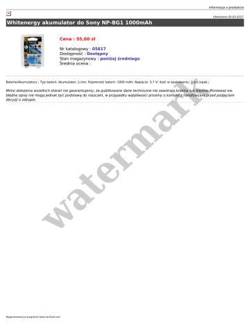 Informacje o produkcie Utworzono 02-03-2017 Whitenergy akumulator do Sony NP-BG1 1000mAh Cena : 55,00 zł Nr katalogowy : 05617 Dostępność : Dostępny Stan magazynowy : poniżej średniego Średnia ocena : Baterie/Akumulatory ; Typ baterii: Akumulator, Li-Ion; Pojemność baterii: 1000 mAh; Napięcie: 3,7 V; Ilość w opakowaniu: 1 szt./opak.; w at er m ar k Mimo dołożenia wszelkich starań nie gwarantujemy, że publikowane dane techniczne nie zawierają braków lub błędów. Ponieważ ew. błędne opisy nie mogą jednak być podstawą do roszczeń, w przypadku wątpliwości prosimy o kontakt z handlowcem przed podjęciem decyzji o zakupie. Wygenerowano w programie www.oscGold.com