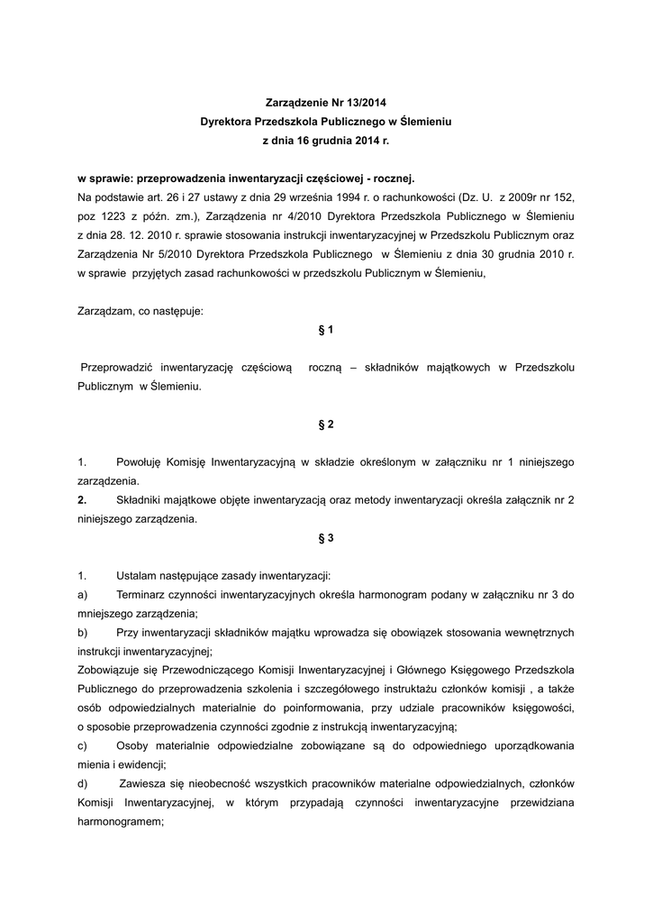 Zarządzenie Nr 13/2014 Dyrektora Przedszkola Publicznego w Ślemieniu z dnia 16 grudnia 2014 r. w sprawie: przeprowadzenia inwentaryzacji częściowej - rocznej. Na podstawie art. 26 i 27 ustawy z dnia 29 września 1994 r. o rachunkowości (Dz. U. z 2009r nr 152, poz 1223 z późn. zm.), Zarządzenia nr 4/2010 Dyrektora Przedszkola Publicznego w Ślemieniu z dnia 28. 12. 2010 r. sprawie stosowania instrukcji inwentaryzacyjnej w Przedszkolu Publicznym oraz Zarządzenia Nr 5/2010 Dyrektora Przedszkola Publicznego w Ślemieniu z dnia 30 grudnia 2010 r. w sprawie przyjętych zasad rachunkowości w przedszkolu Publicznym w Ślemieniu, Zarządzam, co następuje: §1 Przeprowadzić inwentaryzację częściową roczną – składników majątkowych w Przedszkolu Publicznym w Ślemieniu. §2 1. Powołuję Komisję Inwentaryzacyjną w składzie określonym w załączniku nr 1 niniejszego zarządzenia. 2. Składniki majątkowe objęte inwentaryzacją oraz metody inwentaryzacji określa załącznik nr 2 niniejszego zarządzenia. §3 1. Ustalam następujące zasady inwentaryzacji: a) Terminarz czynności inwentaryzacyjnych określa harmonogram podany w załączniku nr 3 do mniejszego zarządzenia; b) Przy inwentaryzacji składników majątku wprowadza się obowiązek stosowania wewnętrznych instrukcji inwentaryzacyjnej; Zobowiązuje się Przewodniczącego Komisji Inwentaryzacyjnej i Głównego Księgowego Przedszkola Publicznego do przeprowadzenia szkolenia i szczegółowego instruktażu członków komisji , a także osób odpowiedzialnych materialnie do poinformowania, przy udziale pracowników księgowości, o sposobie przeprowadzenia czynności zgodnie z instrukcją inwentaryzacyjną; c) Osoby materialnie odpowiedzialne zobowiązane są do odpowiedniego uporządkowania mienia i ewidencji; d) Komisji Zawiesza się nieobecność wszystkich pracowników materialne odpowiedzialnych, członków Inwentaryzacyjnej, harmonogramem; w którym przypadają czynności inwentaryzacyjne przewidziana e) Po zakończeniu czynności inwentaryzacyjnych Przewodniczący Komisji Inwentaryzacyjnej złoży niezwłocznie sprawozdanie końcowe z przebiegu inwentaryzacji; f) Wyniki inwentaryzacji ( rozpatrzone oraz rozliczone nadwyżki i niedobory zatwierdzone przez kierownika jednostki ) winny być ujęte w księgach rachunkowych okresu sprawozdawczego; g) Dokumenty rozpatrzenia różnic inwentaryzacyjnych spisów winny być dostarczone głównemu księgowemu w terminach ustalonych w harmonogramie; h) Odpowiedzialny za sprawny, terminowy i prawidłowy przebieg czynności inwentaryzacyjnych jest Przewodniczący Komisji Inwentaryzacyjnej; i) Szczegółowe zasady i sposób wykonania czynności inwentaryzacyjnych przewidzianych w ustawie o rachunkowości, instrukcji inwentaryzacyjnej oraz niniejszym zarządzeniu określa Przewodniczący Komisji Inwentaryzacyjnej i Główny Księgowy w trakcie instruktażu; §4 1. Inwentaryzacja kończy się sporządzeniem protokołu końcowego. 2. Protokół końcowy sporządza Przewodniczący Komisji Inwentaryzacyjnej. 3. Protokół końcowy podlega zatwierdzeniu przez Dyrektora Przedszkola Publicznego w Ślemieniu. §5 1. Nadzór nad prawidłowością, kompletnością i terminowością spisów inwentaryzacyjnych powierza się Głównemu Księgowemu. §6 Zarządzenie wchodzi w życie z dniem podpisania. Załącznik nr 1 Zarządzenie Nr 13/2014 Dyrektora Przedszkola Publicznego w Ślemieniu z dnia 16 grudnia 2014 r. Wykaz powołanych członków Komisji Inwentaryzacyjnej. lp IMIĘ I NAZWISKO STANOWISKO FUNKCJA KOMISJI 1 Katarzyna Kulka Referent do spraw gospodarczych Przewodnicząca 2 Maria Żurek Nauczyciel Członek 3 Halina Słaboń Pomoc nauczyciela Członek Załącznik nr 2 Zarządzenie Nr 13/2014 Dyrektora Przedszkola Publicznego w Ślemieniu z dnia 16 grudnia 2014 r. L p 1. Pole spisowe Nazwa Przedmiot inwentaryzacji Przedszkole Publiczne w Ślemieniu Druki ścisłego zarachowania, czeki i inne papiery wartościowe Środki pieniężne zgromadzone na rachunkach bankowych Pozostałe aktywa i pasywa niepodlegające inwentaryzacji drogą spisu z natury lub potwierdzenia sald Należności Terminarz inwentaryzacji Metoda Terminy Inwentaryza Termin inwentaryzacji cja na dzień realizacji Spis z natury, porównanie z danymi z księgi Potwierdzenie sald 31 grudnia 2014 31 grudnia 2014 31 grudnia 2014 02 stycznia 2015 Weryfikacja sald (porównywanie 31 grudnia danych w księgach 2014 rachunkowych z danymi wynikającymi z dokumentów) Potwierdzenie sald wszystkie z wyjątkiem: - należności spornych i wątpliwych, - należności i zobowiązań pracowników; - należności publicznoprawnych Wartości niematerialne i prawne Członkowie Komisji inwentaryzacyjnej do 15 stycznia 2014 31 grudnia 2014 do 15 stycznia 2015 31 grudnia 2014 do 07 stycznia 2015 Weryfikacja sald 1. Przewodnicząca – Katarzyna Kulka 2. Członek – Maria Żurek 3. Członek – Halina Słaboń Załącznik nr 3 Zarządzenie Nr 13/2014 Dyrektora Przedszkola Publicznego w Ślemieniu z dnia 16 grudnia 2014 Harmonogram inwentaryzacji Czynności inwentaryzacyjne Termin wykonania Przeszkolenie członków komisji inwentaryzacyjnej 18.12.2014 r. Przygotowanie materiałów niezbędnych do przeprowadzenia inwentaryzacji Osoby odpowiedzialne Przewodniczący Komisji Inwentaryzacyjnej wraz z Głównym księgowym Do 19.12.2014 r. Przewodniczący Komisji Inwentaryzacyjnej Przygotowanie pól spisowych Do 19.12.2014 r. Osoby materialnie odpowiedzialne za składniki majątkowe Spis z natury 31.12.2014 r. Weryfikacja sald 15.01.2015 r. Wycena spisu i sporządzenie zestawienia różnic inwentaryzacyjnych 13.01.2015 r. Wyjaśnienie przyczyn powstania różnic 14.01.2015 r. Podjęcie decyzji w sprawie rozliczenia różnic inwentaryzacyjnych 14.01.2015 r. Dyrektor Zespołu Szkół w Ślemieniu Ujęcie i rozliczenie wyników inwentaryzacyjnych w księgach rachunkowych 20.01.2015 r. Księgowość Do 23.01.2015 r. Przewodniczący Komisji Inwentaryzacyjn