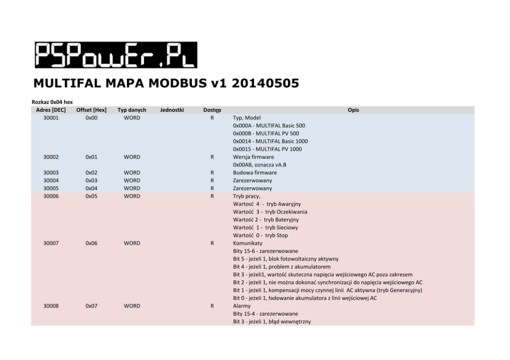 . MULTIFAL MAPA MODBUS v1 20140505 Rozkaz 0x04 hex Adres [DEC] Offset [Hex] 30001 0x00 Typ danych WORD Jednostki Dostęp R 30002 0x01 WORD R 30003 30004 30005 30006 0x02 0x03 0x04 0x05 WORD WORD WORD WORD R R R R 30007 0x06 WORD R 30008 0x07 WORD R Opis Typ, Model 0x000A - MULTIFAL Basic 500 0x000B - MULTIFAL PV 500 0x0014 - MULTIFAL Basic 1000 0x0015 - MULTIFAL PV 1000 Wersja firmware 0x00AB, oznacza vA.B Budowa firmware Zarezerwowany Zarezerwowany Tryb pracy, Wartosć 4 - tryb Awaryjny Wartość 3 - tryb Oczekiwania Wartość 2 - tryb Bateryjny Wartość 1 - tryb Sieciowy Wartość 0 - tryb Stop Komunikaty Bity 15-6 - zarezerwowane Bit 5 - jeżeli 1, blok fotowoltaiczny aktywny Bit 4 - jeżeli 1, problem z akumulatorem Bit 3 - jeżeli1, wartość skuteczna napięcia wejściowego AC poza zakresem Bit 2 - jeżeli 1, nie można dokonać synchronizacji do napięcia wejściowego AC Bit 1 - jeżeli 1, kompensacji mocy czynnej linii AC aktywna (tryb Generacyjny) Bit 0 - jeżeli 1, ładowanie akumulatora z linii wejściowej AC Alarmy Bity 15-4 - zarezerwowane Bit 3 - jeżeli 1, błąd wewnętrzny 30009 30010 30011 30012 30013 30014 30015 30016 30017 30018 30019 30020 30021 30022 30023 30024 30025 30026 30027 30028 30029 30030 30031 30032 30033 30034 30035 30036 30037 0x08 0x09 0x0A 0x0B 0x0C 0x0D 0x0E 0x0F 0x10 0x11 0x12 0x13 0x14 0x15 0x16 0x17 0x18 0x19 0x1A 0x1B 0x1C 0x1D 0x1E 0x1F 0x20 0x21 0x22 0x23 0x24 WORD WORD WORD WORD WORD WORD WORD WORD WORD WORD WORD WORD WORD WORD WORD WORD WORD WORD WORD WORD WORD WORD WORD WORD WORD WORD WORD WORD WORD Urms = ax+b Urms = ax+b U = ax+b U = ax+b T=ax+b [h] [min] [h] R R R R R R R R R R R R R R R R R R R R R R R R R R R R R Bit 2 - jeżeli 1, błąd wentylatora Bit 1 - jeżeli 1, przeciążanie wyjścia AC w trybie Bateryjnym Bit 0 - jeżeli 1, zwarcie wyjścia AC w trybie Bateryjnym Wartość RMS napięcia lini wejściowej AC Wartość RMS napięcia lini wyjściowej AC Napięcie bloku fotowoltaicznego Napięcie akumulatorów Poziom obciążenia inwertera Zarezerwowany Temperatura Zarezerwowany Zarezerwowany Licznik zwarć wyjścia AC z trybie Bateryjnym Licznik przeciążeń wyjścia AC w trybie Bateryjnym Licznik zaników napięcia na wejściu AC Licznik wyjść napięcia wejściowego AC z dopuszczalnego okna RMS Licznik wyjścić napięcia wejściowego AC z dopuszczlanego okna synchronizacji Licznik pracy Licznik pracy w trybie Bateryjnym Licznik pracy w trybie Generacyjnym Informacje serwisowe0 Informacje serwisowe1 Informacje serwisowe2 Informacje serwisowe3 Informacje serwisowe4 Informacje serwisowe5 Informacje serwisowe6 Informacje serwisowe7 Informacje serwisowe8 Informacje serwisowe9 Informacje serwisowe10 Informacje serwisowe11 Rozkaz 0x03 i 0x06 hex Adres [DEC] Offset [Hex] 40001 0x00 Typ danych WORD Jednostki Dostęp RW 40002 0x01 WORD RW 40003 40004 40005 40006 40007 40008 40009 40010 40011 40012 40013 0x02 0x03 0x04 0x05 0x06 0x07 0x08 0x09 0x0A 0x0B 0x0C WORD WORD WORD WORD WORD WORD WORD WORD WORD WORD WORD RW RW RW RW RW RW RW RW RW RW RW Opis Adres jednostki podrzędnej 0x00AB Kontrola pracy, bitowy Bity 15-4 - zarezerwowane Bit 3 - jeżeli 1, zezwolenie na kompensację mocy lini AC Bit 2 - jeżeli 1, zezwolenie na ładowanie baterii z wejscia AC Bit 1 - jeżeli 1, blok fotowoltaiczny, zezwolenie na pracę Bit 0 - jeżeli 1, urządzenie logicznie uruchomione Maksymalny poziom ladowania baterii z wejściowej linii AC Maksymalny poziom kompensacji mocy czynnej lini AC Maksymalny poziom obciążenia invertera przy pracy Bateryjnej Napięcie minimlane rozładowania akumaulatora Napięcie startu ładowania akumulatora Napięcie stopu ładowania akumulatora Napięcie startu kompensacji mocy czynnej linii AC Napięcie regulacji bloku fotowoltaicznego Napięcie wyjściowe inwertera Próg dolny RMS napięciowego okna poprawności zasilania z linii wejściowej AC Próg górny RMS napięciowego okna poprawności zasilania z linii wejściowej AC