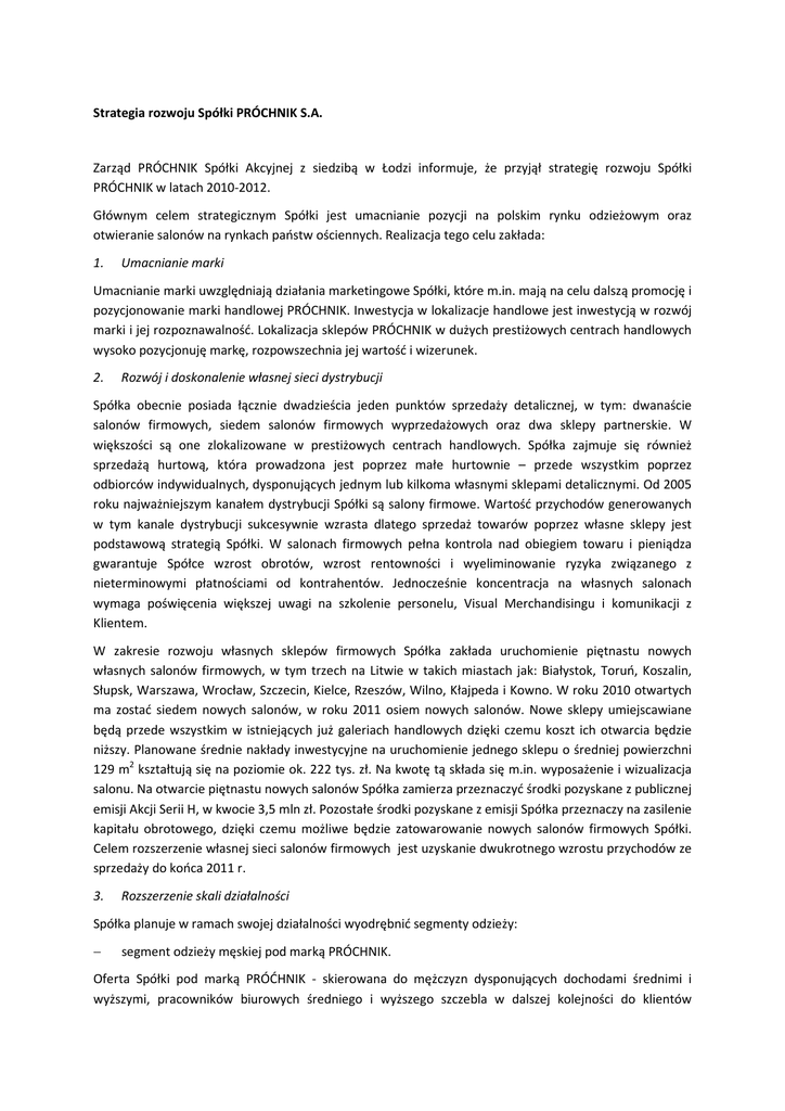 Strategia rozwoju Spółki PRÓCHNIK S.A. Zarząd PRÓCHNIK Spółki Akcyjnej z siedzibą w Łodzi informuje, że przyjął strategię rozwoju Spółki PRÓCHNIK w latach 2010-2012. Głównym celem strategicznym Spółki jest umacnianie pozycji na polskim rynku odzieżowym oraz otwieranie salonów na rynkach państw ościennych. Realizacja tego celu zakłada: 1. Umacnianie marki Umacnianie marki uwzględniają działania marketingowe Spółki, które m.in. mają na celu dalszą promocję i pozycjonowanie marki handlowej PRÓCHNIK. Inwestycja w lokalizacje handlowe jest inwestycją w rozwój marki i jej rozpoznawalność. Lokalizacja sklepów PRÓCHNIK w dużych prestiżowych centrach handlowych wysoko pozycjonuję markę, rozpowszechnia jej wartość i wizerunek. 2. Rozwój i doskonalenie własnej sieci dystrybucji Spółka obecnie posiada łącznie dwadzieścia jeden punktów sprzedaży detalicznej, w tym: dwanaście salonów firmowych, siedem salonów firmowych wyprzedażowych oraz dwa sklepy partnerskie. W większości są one zlokalizowane w prestiżowych centrach handlowych. Spółka zajmuje się również sprzedażą hurtową, która prowadzona jest poprzez małe hurtownie – przede wszystkim poprzez odbiorców indywidualnych, dysponujących jednym lub kilkoma własnymi sklepami detalicznymi. Od 2005 roku najważniejszym kanałem dystrybucji Spółki są salony firmowe. Wartość przychodów generowanych w tym kanale dystrybucji sukcesywnie wzrasta dlatego sprzedaż towarów poprzez własne sklepy jest podstawową strategią Spółki. W salonach firmowych pełna kontrola nad obiegiem towaru i pieniądza gwarantuje Spółce wzrost obrotów, wzrost rentowności i wyeliminowanie ryzyka związanego z nieterminowymi płatnościami od kontrahentów. Jednocześnie koncentracja na własnych salonach wymaga poświęcenia większej uwagi na szkolenie personelu, Visual Merchandisingu i komunikacji z Klientem. W zakresie rozwoju własnych sklepów firmowych Spółka zakłada uruchomienie piętnastu nowych własnych salonów firmowych, w tym trzech na Litwie w takich miastach jak: Białystok, Toruń, Koszalin, Słupsk, Warszawa, Wrocław, Szczecin, Kielce, Rzeszów, Wilno, Kłajpeda i Kowno. W roku 2010 otwartych ma zostać siedem nowych salonów, w roku 2011 osiem nowych salonów. Nowe sklepy umiejscawiane będą przede wszystkim w istniejących już galeriach handlowych dzięki czemu koszt ich otwarcia będzie niższy. Planowane średnie nakłady inwestycyjne na uruchomienie jednego sklepu o średniej powierzchni 129 m2 kształtują się na poziomie ok. 222 tys. zł. Na kwotę tą składa się m.in. wyposażenie i wizualizacja salonu. Na otwarcie piętnastu nowych salonów Spółka zamierza przeznaczyć środki pozyskane z publicznej emisji Akcji Serii H, w kwocie 3,5 mln zł. Pozostałe środki pozyskane z emisji Spółka przeznaczy na zasilenie kapitału obrotowego, dzięki czemu możliwe będzie zatowarowanie nowych salonów firmowych Spółki. Celem rozszerzenie własnej sieci salonów firmowych jest uzyskanie dwukrotnego wzrostu przychodów ze sprzedaży do końca 2011 r. 3. Rozszerzenie skali działalności Spółka planuje w ramach swojej działalności wyodrębnić segmenty odzieży: − segment odzieży męskiej pod marką PRÓCHNIK. Oferta Spółki pod marką PRÓĆHNIK - skierowana do mężczyzn dysponujących dochodami średnimi i wyższymi, pracowników biurowych średniego i wyższego szczebla w dalszej kolejności do klientów poszukujących odzieży wizytowej i weekendowej. Asortyment dla mężczyzn to: kurtki, płaszcze, garnitury, marynarki, spodnie, koszule, spinki do koszul, paski, krawaty, szaliki i skarpety. Do klientów Spółka dociera przez media oraz uruchomiony w I kwartale 2009 r. program lojalnościowy (Próchnik Club) i związane z nim atrakcyjne promocje dla klientów. Dostarczane produkty charakteryzują się najwyższą jakością z wzornictwem zgodnym z aktualnymi światowymi trendami mody. − segment odzieży damskiej PRÓCHNIK S.A. planuje przejęcie przedsiębiorstwa z segmentu odzieży damskiej, które ma rozbudowaną sieć dystrybucji oraz rozpoznawalną markę. Segment odzieży damskiej pod marką przejętego przedsiębiorstwa stanowić będzie dla Spółki PRÓCHNIK uzupełnienie oferty marki odzieży męskiej. W swoich planach inwestycyjnych Spółka zakłada możliwość przejęcia dodatkowo – drugiej marki damskiej sprzedającej produkty z wyższej półki. Przychody generowane dzięki marce PRÓCHNIK oraz przejętej marce odzieży damskiej pozwoliłyby Spółce w przyszłym roku wygenerować około 80 mln zł przychodów ze sprzedaży oraz ok. 100 mln zł przychodów w 2011 r. 4. Rozszerzenia oferty asortymentowej o nowe produkty Spółka celem poszerzenia swojej oferty asortymentowej planuje w ramach segmentu odzieży męskiej i segmentu odzieży damskiej rozszerzenie swojej działalności o nową kategorię produktów – kosmetyki – perfumy, wody toaletowe, wody po goleniu, kosmetyki do pielęgnacji skóry oraz galanterię – buty, paski, kapelusze, rękawiczki oraz torby. Nowy asortyment męski sprzedawany będzie pod marką PRÓCHNIK, zaś nowe produkty dla kobiet pod przejętą marką odzieży damskiej. Rozszerzenie marki PRÓCHNIK i marki odzieży damskiej pozwoli wykorzystać ich ugruntowaną już pozycję i renomę wśród grupy docelowych odbiorców, a w konsekwencji zwiększyć przychody i zakres działania firmy. 5. Zwiększenie rynku zbytu poprzez ekspansję na rynek wschodni Obecnie jedynym kanałem sprzedaży dla Spółki na rynku zagranicznym są sklepy obce. W I półroczu 2009 r. udział rynku zagranicznego wyniósł jedynie 0,75% ogólnej wartości sprzedaży. Największym rynkiem eksportowym w tym czasie były Litwa i Ukraina (na Ukrainie Spółka posiada spółkę zależną poprzez którą prowadzi sprzedaż). Strategia Spółki w najbliższych dwóch latach oprócz uruchamiania sklepów firmowych w Polsce zakłada równ