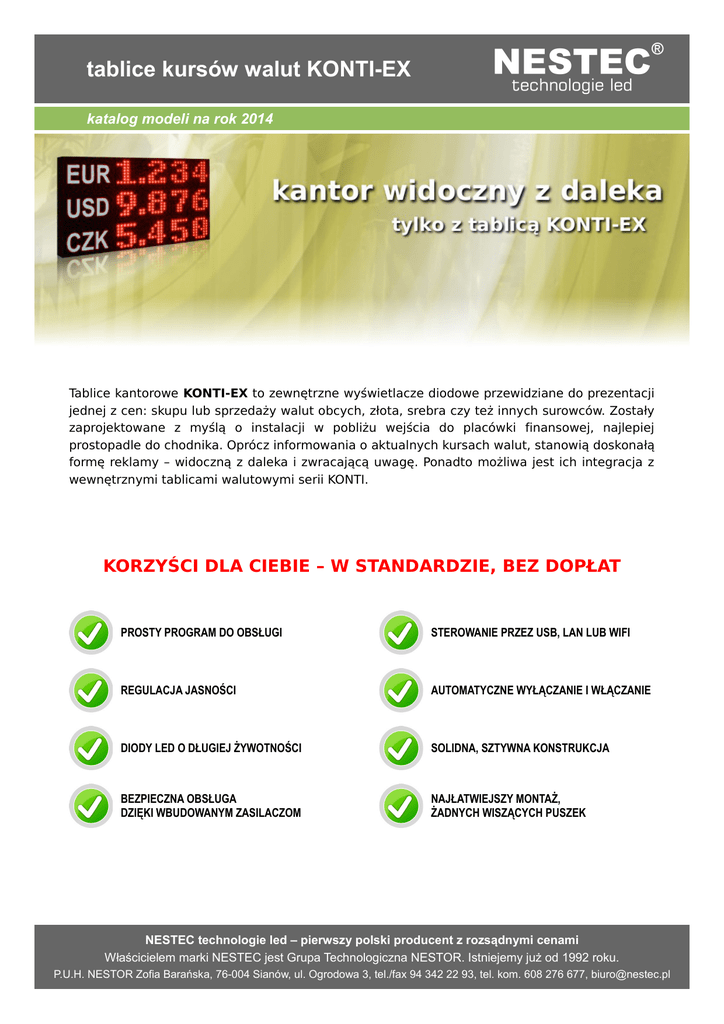 tablice kursów walut KONTI-EX katalog modeli na rok 2014 Tablice kantorowe KONTI-EX to zewnętrzne wyświetlacze diodowe przewidziane do prezentacji jednej z cen: skupu lub sprzedaży walut obcych, złota, srebra czy też innych surowców. Zostały zaprojektowane z myślą o instalacji w pobliżu wejścia do placówki finansowej, najlepiej prostopadle do chodnika. Oprócz informowania o aktualnych kursach walut, stanowią doskonałą formę reklamy – widoczną z daleka i zwracającą uwagę. Ponadto możliwa jest ich integracja z wewnętrznymi tablicami walutowymi serii KONTI. KORZYŚCI DLA CIEBIE – W STANDARDZIE, BEZ DOPŁAT PROSTY PROGRAM DO OBSŁUGI STEROWANIE PRZEZ USB, LAN LUB WIFI REGULACJA JASNOŚCI AUTOMATYCZNE WYŁĄCZANIE I WŁĄCZANIE DIODY LED O DŁUGIEJ ŻYWOTNOŚCI SOLIDNA, SZTYWNA KONSTRUKCJA BEZPIECZNA OBSŁUGA DZIĘKI WBUDOWANYM ZASILACZOM NAJŁATWIEJSZY MONTAŻ, ŻADNYCH WISZĄCYCH PUSZEK NESTEC technologie led – pierwszy polski producent z rozsądnymi cenami Właścicielem marki NESTEC jest Grupa Technologiczna NESTOR. Istniejemy już od 1992 roku. P.U.H. NESTOR Zofia Barańska, 76-004 Sianów, ul. Ogrodowa 3, tel./fax 94 342 22 93, tel. kom. 608 276 677, [email protected] pierwszy polski producent z rozsądnymi cenami KONTI-EX – NIEZAWODNOŚĆ 24H NA DOBĘ model KONTI-EX 32 Możliwości tablic walutowych KONTI-EX Tablice kursów walut KONTI-EX produkowane są przez nas w dwóch odmianach: jednostronnej i dwustronnej. Wariant jednostronny, zainstalowany na elewacji, doskonale spisuje się, gdy kantor zlokalizowany jest np. naprzeciwko większego parkingu lub w pobliżu skrzyżowania ulic. Jeśli jednak zależy nam na zwróceniu uwagi przechodniów i zmotoryzowanych mijających kantor usytuowany wzdłuż ulicy, zdecydowanie najlepszym wyborem będzie wersja dwustronna zainstalowana prostopadle w formie semafora. Co ważne, bez względu na wybraną opcję, wyświetlacz standardowo wyposażony jest w automatyczną regulację jasności, aby mógł pokonać bezpośrednie światło słoneczne za dnia i jednocześnie nie oślepiał wieczorem i w nocy. W komplecie wraz z wyświetlaczem LED dostarczane jest oprogramowanie, którego intuicyjny interfejs pozwala na proste i szybkie wprowadzanie zmian. Wygodną funkcją jest przy tym współpraca z wewnętrznymi tablicami kursów walut serii KONTI. W ten sposób dosłownie jednym kliknięciem można zaktualizować informacje na wszystkich tablicach – zarówno tych na zewnątrz, jak i tych w pomieszczeniu. Podobnie jak w tablicach serii KONTI, również tutaj urządzenie rozpoczyna swoją pracę od wygaszenia wszystkich pozycji. Rozwiązanie to skutecznie zapobiega wyświetlaniu nieaktualnych cen w przypadku dłuższej przerwy w dostawie energii elektrycznej. W razie potrzeby dowolne pole może być również wygaszone z poziomu oprogramowania. Standardowo wyświetlacz podłączany jest do komputera poprzez port USB. W dowolnym momencie ten rodzaj połączenia może zostać zastąpiony bardziej zaawansowanym, umożliwiającym przyłączenie do sieci komputerowej przez LAN bądź WiFi. Zapewnia to dużą elastyczność w doborze miejsca instalacji tablicy. www.nestec.pl pierwszy polski producent z rozsądnymi cenami Parametry techniczne Zawartość zestawu - - zasilanie: sieciowe 230VAC odporność na warunki atmosferyczne zakres temperatur pracy: -30 do +70 °C programowanie przez: USB (standard), LAN (opcja), WiFi (opcja) - kolor świecenia (jeden z): czerwony, ciepły żółty, zielony, pomarańczowy, niebieski wyświetlacz z przewodem zasilającym moduł komunikacyjny przewód USB 5m (tylko dla modułu USB) wsporniki montażowe śruby M6 pisemna gwarancja instrukcja obsługi w języku polskim płyta CD z oprogramowaniem Okres gwarancji na tablice kursów walut serii KONTI-EX wynosi 24 miesiące. Oferowane wyświetlacze są naszej produkcji i powstają w naszej własnej fabryce w Polsce. Nie sprzedajemy urządzeń pochodzących z importu. Jako producent zapewniamy łatwy dostęp do serwisu gwarancyjnego i pogwarancyjnego. Od zawsze stawiamy na rzetelną obsługę Klienta, dzięki czemu działamy na polskim rynku już od 1992 roku. DOSTĘPNE KOLORY ŚWIECENIA Moduły komunikacyjne Zadaniem modułu komunikacyjnego jest umożliwienie połączenia komputera ze sterownikiem tablicy diodowej. Fizycznie ma on postać malutkiej „szufladki” wsuwanej do wnętrza wyświetlacza. Dzięki temu w dowolnym momencie standardowy moduł USB może zostać zamieniony na jeden z modułów opcjonalnych: LAN lub WiFi. Ponadto, po instalacji okablowania i ponownym wsunięciu modułu do środka, zapewnia to lepszą ochronę przed wpływem warunków atmosferycznych niż ma to miejsce w przypadku rozwiązań z modułami dokładanymi na zewnątrz tablicy. Moduł USB. Standardowy moduł komunikacyjny umożliwiający połączenie poprzez port USB. Wraz z tym modułem dostarczany jest przewód USB o długości 5m. Ważne: standard USB nie przewiduje możliwości przedłużenia przewodu ponad 5m. Moduł LAN. Opcjonalny moduł komunikacyjny umożliwiający podłączenie wyświetlacza do sieci komputerowej za pomocą tzw. skrętki komputerowej. Maksymalna długość przewodu wynosi w tym wypadku do 100m. Moduł WiFi. Opcjonalny moduł komunikacyjny umożliwiający bezprzewodowe podłączenie do sieci komputerowej. Zasięg w otwartej przestrzeni wynosi do 100m. www.nestec.pl pierwszy polski producent z rozsądnymi cenami TABLICE WALUTOWE KONTI-EX Modele jednostronne Wymiary zewn. (mm) Liczba pozycji cenowych KONTI-EX 10 1200 x 240 x 60 1 KONTI-EX 20 1200 x 510 x 60 KONTI-EX 30 1200 x 780 x 60 Cena netto (PLN) Modele dwustronne Wymiary zewn. (mm) Liczba pozycji cenowych Cena netto (PLN) 900,00 KONTI-EX 12 1200 x 240 x 60 1 1 800,00 2 1 800,00 KONTI-EX 22 1200 x 510 x 60 2 3 600,00 3 2 700,00 KONTI-EX 32 1200 x 780 x 60 3 5 400,00 Format prezentacji pozycji walutowych: XXXX - cztery cyfry; kropka może zostać wyświetlona na dowolnej pozycji. OPCJONAL