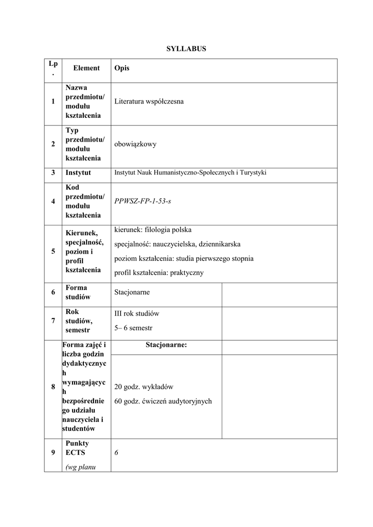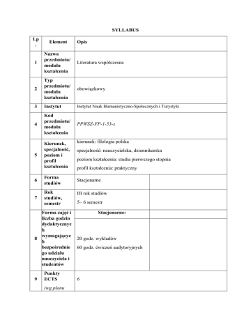 SYLLABUS Lp . Element 1 Nazwa przedmiotu/ modułu kształcenia Literatura współczesna 2 Typ przedmiotu/ modułu kształcenia obowiązkowy 3 Instytut Instytut Nauk Humanistyczno-Społecznych i Turystyki 4 Kod przedmiotu/ modułu kształcenia PPWSZ-FP-1-53-s 5 Kierunek, specjalność, poziom i profil kształcenia 6 Forma studiów 7 Rok studiów, semestr Forma zajęć i liczba godzin dydaktycznyc h wymagającyc 8 h bezpośrednie go udziału nauczyciela i studentów 9 Punkty ECTS (wg planu Opis kierunek: filologia polska specjalność: nauczycielska, dziennikarska poziom kształcenia: studia pierwszego stopnia profil kształcenia: praktyczny Stacjonarne III rok studiów 5– 6 semestr Stacjonarne: 20 godz. wykładów 60 godz. ćwiczeń audytoryjnych 6 studiów) Nakład pracy studenta – bilans punktów ECTS Obciążenie studenta Forma aktywności studenta Studia stacjonarne Obciążenie studenta na zajęciach wymagających bezpośredniego udziału nauczycieli akademickich, w tym: godz.:81 ECTS:2,7 Udział w wykładach (godz.) 30 Udział w ćwiczeniach/ seminariach/ zajęciach praktycznych/ praktykach zawodowych (godz.) 50 Dodatkowe godziny kontaktowe z nauczycielem (godz.) Udział w egzaminie (godz.) 10 Obciążenie studenta związane z nauką samodzielną, w tym: 1 godz.:98 ECTS:3,3 Samodzielne studiowanie tematyki zajęć/ przygotowanie się do ćwiczeń (godz.) 80 Przygotowanie do zaliczenia/ egzaminu (godz.) 12 Wykonanie prac zaliczeniowych przygotowanie interpretacji wybranego dzieła literatury współczesnej (wypowiedź ustna), 6 Obciążenie studenta w ramach zajęć związanych z praktycznym przygotowaniem zawodowym godz.:179 ECTS:6 godz.: ECTS: Suma (obciążenie studenta na zajęciach wymagających bezpośredniego udziału nauczycieli akademickich oraz związane z nauką samodzielną) godz.: 181 11 Nauczyciel akademicki odpowiedzia lny za dr Ewa Nadolska- Mętel przedmiot/ moduł (egzaminują cy) 12 Nauczyciele akademiccy prowadzący przedmiot/ moduł 13 14 Wymagania (kompetencj e) wstępne ECTS:6 dr Ewa Nadolska- Mętel zaliczone co najmniej trzy z czterech modułów historycznoliterackich: literatura staropolska, literatura romantyzmu, literatura pozytywizmu i Młodej Polski, literatura XX-lecia międzywojennego i II wojny światowej rozumienie najważniejszych dzieł i procesów literatury polskiej po roku Założenia i 1945; znajomość podstawowych faktów i procesów współczesnej kultury literackiej, umiejętność samodzielnej, a zarazem adekwatnej cele historycznie oraz estetycznie analizy i interpretacji tekstu literackiego przedmiotu Opis efektów kształcenia w zakresie: 15 Efekty kształcenia Odniesieni e do Odniesienie kierunkow do efektów ych kształcenia dla obszaru efektów kształcenia WIEDZY Student zna kanon literatury polskiej lat 1945-2016, a także wybrane W1 teksty z kanonu literatury światowej. K_W01 K_W06 H1P_W01 H1P_W02 H1P_W03 H1P_W03 Student zna i rozumie estetyczną i ideologiczną swoistość polskiej i W2 powszechnej literatury współczesnej. Student posiada podstawową wiedzę o antropologicznych i filozoficznych W3 kontekstach literatury współczesnej. Potrafi wykorzystać je w interpretacji dzieła literackiego Student potrafi wskazać przemiany zachodzące na przestrzeni czasu w W4 kwestii recepcji dzieł literackich i określić jej przyczyny H1P_W01, H1P_W02, K_W04, H1P_W04, H1P_W03 H1P_W01 K_W05, H1P_W02 H1P_W04, K_W10 UMIEJĘTNOŚCI U1 U2 U3 Potrafi samodzielnie wyszukiwać, poddawać selekcji, hierarchizacji i analizie informacje dotyczące literatury współczesnej, wykorzystując różne źródła i sposoby kwerendy. Potrafi samodzielnie dokonać analizy i interpretacji literatury współczesnej w kontekście biograficznym, historyczno-literackim i kulturowym Student potrafi przygotować samodzielną ustną wypowiedź analizującą i interpretującą współczesny tekst literacki, uwzględniając jego konteksty kulturowe: literackie, historyczne, artystyczne, filozoficzne. H1P_U01 K_U06 H1P_U11 H1P_U0103 K_U01-04 K_U13 K_U14 H1P_U0910 H1P_U1213 H1P_U0103 K_U01-04 K_U13 K_U14 H1P_U0910 H1P_U1213 KOMPETENCJI SPOŁECZNYCH K1 Potrafi samodzielnie rozwijać swoją wiedzę dotyczącą literatury K_K01 H1P_K01 współczesnej K2 Rozwija swoje zdolności do samodzielnej, krytycznej analizy procesów politycznych, społecznych, kulturowych i ich wzajemnej korelacji. Zdobyta wiedza pozwala mu świadomie uczestniczyć w życiu społecznym i stymuluje jego rozwój osobisty K_K03 K3 Aktywnie uczestniczy kulturalnym K_K06 w życiu H1P_K03 H1P_K06 literatura polska po roku 1945: kanon, wewnętrzna periodyzacja, najważniejsze prądy estetyczno-literackie epoki i ich uwarunkowania kulturowe; analiza historycznoliteracka i interpretacja wybranych tekstów epoki; wybrane zagadnienia kultury literackiej epoki: ugrupowania literackie, manifesty, czasopisma; wybrane zagadnienia z literatury powszechnej; problemy kultury popularnej; kultura alternatywna i kultura masowa; zagadnienie własności intelektualnej 16 Treści kształcenia 17 Stosowane metody dydaktyczne Metody weryfikacji efektów kształcenia 18 Wykłady: PRL – charakterystyka ustroju i kultury, najważniejsze daty i propozycje periodyzacyjne; Literatura i kultura emigracyjna: ogólna charakterystyka, najważniejsze ośrodki, najwybitniejsi twórcy; Druga połowa lat 40. i socrealizm: rys historyczno- i kulturowo-literacki; Odwilż i tzw. nasza mała stabilizacja: rys historyczno- i kulturowoliteracki; Rok 68 i jego znaczenie dla kultury Polski, Europy i świata; Lata 70.: rys historyczno- i kulturowo-literacki; Okres stanu wojennego, koniec PRL i III RP: rys historyczno- i kulturowo literacki; Fenomen: Gombrowicz; Fenomen: Miłosz; Fenomen: „Kultura”; Fenomen: Białoszewski; Fenomen: Parnicki; Fenomen: Herling-Grudziński; Fenomen: Różewicz; Fenomen: Szymborska. Wykład informacyjny, wykład problemowy, ćwiczenia, dyskusja, praca w grupach , praca z tekstem. Efekt Sposób weryfikac