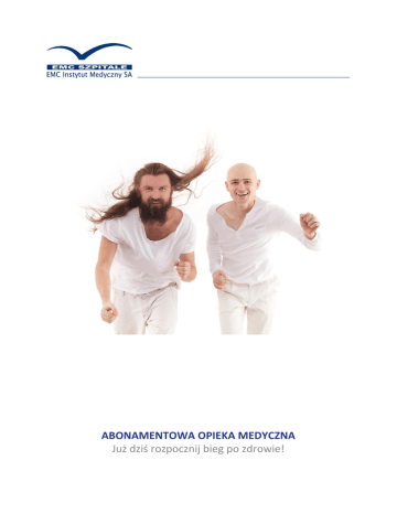 ABONAMENTOWA OPIEKA MEDYCZNA Już dziś rozpocznij bieg po zdrowie! Pakiet Optimum INFOLINIA MEDYCZNA Dostęp do infolinii od poniedziałku do piątku w godz. 7:00-19:30 oraz w soboty w godz. 8:00-14:00 umożliwia: uzyskanie informacji na temat zakresu udzielanych świadczeń zdrowotnych, dokonanie rezerwacji terminów konsultacji lekarskich, zabiegów rehabilitacyjnych i badań diagnostycznolaboratoryjnych. OPIEKA LEKARZA PROWADZĄCEGO Terapia w zakresie schorzeń internistycznych prowadzona zgodnie ze standardami postępowania polskich i europejskich towarzystw naukowych m.in. w zakresie opieki nad Pacjentami ze schorzeniami układu oddechowego (np. astma), układu sercowo-naczyniowego (np. nadciśnienie tętnicze) i zaburzeniami metabolicznymi (np. cukrzyca). internista lekarz rodzinny pediatra KONSULTACJE SPECJALISTYCZNE Nielimitowany, bezpłatny dostęp do konsultacji lekarzy specjalistów bez skierowania, pomoc w nagłych zachorowaniach oraz leczenie chorób przewlekłych. Konsultacje specjalistyczne obejmują: wywiad, poradę specjalisty wraz z czynnościami podstawowymi niezbędnymi do postawienia diagnozy i podjęcia właściwej decyzji terapeutycznej oraz monitorowanie leczenia. alergolog wykonywanie testów alergicznych metodą nakłuć odczulanie661 300 700 napisz: [email protected] zobacz: www.emc-sa.pl chirurg założenie i zmiana opatrunku zdejmowanie szwów skórnych usunięcie ciała obcego z powłok skórnych (np. kleszcza) leczenie oparzeń (w stanach umożliwiających leczenie ambulatoryjne) leczenie odmrożeń (w stanach umożliwiających leczenie ambulatoryjne) diabetolog dietetyk – 5 razy w roku, tylko dla Pakietu Indywidulanego dermatolog kriochirurgia drobnych zmian skórnych gastroenterolog ginekolog-położnik prowadzenie ciąży prawidłowej pobieranie materiałów do badań cytologicznych i mikrobiologicznych laryngolog płukanie uszu, nosa usunięcie woskowiny z przewodów słuchowych zewnętrznych przedmuchiwanie trąbki słuchowej zadzwoń: 661 300 700 napisz: [email protected] zobacz: www.emc-sa.pl EMC Instytut Medyczny SA, ul. Pilczycka 144-148, 54-144 Wrocław Pakiet Optimum usuwanie ciała obcego z ucha, nosa, gardła opatrunek uszny z lekiem postępowanie zachowawcze w krwawieniu z nosa pobranie wymazów z dróg oddechowych lekarz medycyny sportowej – konsultacja bez wystawiania zaświadczeń, 3 razy w roku, tylko dla Pakietu Indywidulanego neurolog okulista komputerowe badanie wzroku badanie podstawowe ostrości wzroku dobór szkieł okularowych pomiar ciśnienia śródgałkowego usuwanie ciała obcego z oka płukanie dróg łzowych badanie dna oka onkolog ortopeda opatrzenie drobnych urazów (skręcenia/zwichnięcia/złamania) założenie i zdjęcie opatrunku gipsowego klasycznego/syntetycznego założenie temblaka unieruchomienie kończyn i stawów iniekcje odstawowe i okołostawowe punkcja stawu poradnia preluksacyjna USG bioderek proktolog pulmonolog reumatolog urolog zakładanie cewników – tylko dla Pakietu Indywidulanego DIAGNOSTYKA Badania diagnostyki laboratoryjnej, obrazowej i czynnościowej, wykonywane na zlecenie lekarza prowadzącego lub innego specjalisty EMC. badania laboratoryjne: zakres rozszerzony hematologia analityka ogólna chemia kliniczna diagnostyka: miażdżycy, chorób tarczycy, anemii, cukrzycy badania serologiczne bakteriologia zadzwoń: 661 300 700 napisz: [email protected] zobacz: www.emc-sa.pl EMC Instytut Medyczny SA, ul. Pilczycka 144-148, 54-144 Wrocław Pakiet Optimum serologia grup krwi markery nowotworowe: PSA, CEA badania obrazowe USG: jamy brzusznej, piersi, tarczycy, prostaty, ginekologiczne, szyi, ślinianek, jąder, układu moczowego, zmian skórnych RTG: pełny zakres (bez użycia kontrastu) inne: gastroskopia, EKG spoczynkowe, spirometria, audiometria, cytologia USŁUGI AMBULATORYJNE – konsultacyjne Usługi w formie zabiegów, które mogą być wykonywane przez lekarza lub pielęgniarkę podczas właściwej dla zabiegu konsultacji lekarskiej lub po konsultacji lekarskiej w warunkach ambulatoryjnych. Zakres konsultacyjnych zabiegów ambulatoryjnych uzależniony jest od zakresu konsultacji specjalistycznych, do których Pacjent jest uprawniony w ramach abonamentu. USŁUGI STOMATOLOGICZNE bezpłatny przegląd stomatologiczny – 1 raz w roku GABINET ZABIEGOWY – czynności pielęgniarskie iniekcje domięśniowe, dożylne, podskórne zmiana opatrunku podłączenie kroplówki (wlew dożylny) nebulizacja (terapia inhalacyjna) pomiar ciśnienia pomiar wzrostu i wagi ciała RABATY NA DODATKOWE USŁUGI MEDYCZNE 100 % USG jamy brzusznej dla dziecka – 1 raz w roku, tylko dla Pakietu Indywidulanego 100 % szczepienie przeciwko grypie – 1 raz w roku, tylko dla Pakietu Firmowego 25 % wizyty domowe w godzinach od 08.00-20.00 20 % ambulatoryjna rehabilitacja medyczna 15 % konsultacje specjalistyczne nie wchodzące w zakres pakietu 15 % ponadstandardowe usługi hotelowe w Szpitalu EuroMediCare 10 % szczepienia ochronne 10 % szczepienia dla dziecka – 1 raz w roku, tylko dla Pakietu Indywidulanego 10 % zabiegi chirurgiczne 10 % stomatologia zachowawcza i chirurgiczna zadzwoń: 661 300 700 napisz: [email protected] zobacz: www.emc-sa.pl EMC Instytut Medyczny SA, ul. Pilczycka 144-148, 54-144 Wrocław 300 700 napisz: [email protected] zobacz: www.emc-sa.pl Pakiet Optimum 10 % Rezonans Magnetyczny 5 % Przegląd po 30 (kompleksowy przegląd medyczny) 5 % chirurgia plastyczna i estetyczna Wersje PAKIETU OPTIMUM: Indywidualny Duet Rodzinny Klient Klient i współmałżonek/partner/1 dziecko do 25 r.ż. Klient i współmałżonek/partner + dzieci do 25 r.ż. zadzwoń: 661 300 700 napisz: [email protected] 100,00 PLN 180,00 PLN 250,00 PLN zobacz: www.emc-sa.pl EMC Instytut Medyczny SA, ul. Pilczycka 144-148, 54-144 Wrocław