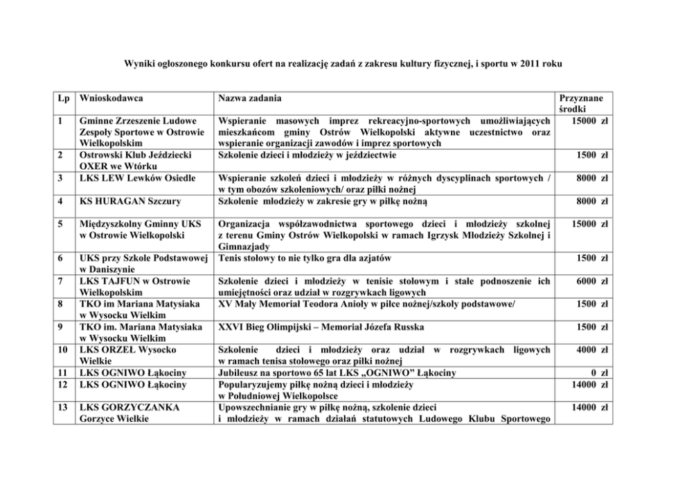 Wyniki ogłoszonego konkursu ofert na realizację zadań z zakresu kultury fizycznej, i sportu w 2011 roku Lp Wnioskodawca 1 3 Gminne Zrzeszenie Ludowe Zespoły Sportowe w Ostrowie Wielkopolskim Ostrowski Klub Jeździecki OXER we Wtórku LKS LEW Lewków Osiedle 4 KS HURAGAN Szczury 5 Międzyszkolny Gminny UKS w Ostrowie Wielkopolski 6 UKS przy Szkole Podstawowej w Daniszynie LKS TAJFUN w Ostrowie Wielkopolskim TKO im Mariana Matysiaka w Wysocku Wielkim TKO im. Mariana Matysiaka w Wysocku Wielkim LKS ORZEŁ Wysocko Wielkie LKS OGNIWO Łąkociny LKS OGNIWO Łąkociny 2 7 8 9 10 11 12 13 LKS GORZYCZANKA Gorzyce Wielkie Nazwa zadania Przyznane środki 15000 zł Wspieranie masowych imprez rekreacyjno-sportowych umożliwiających mieszkańcom gminy Ostrów Wielkopolski aktywne uczestnictwo oraz wspieranie organizacji zawodów i imprez sportowych Szkolenie dzieci i młodzieży w jeździectwie 1500 zł Wspieranie szkoleń dzieci i młodzieży w różnych dyscyplinach sportowych / w tym obozów szkoleniowych/ oraz piłki nożnej Szkolenie młodzieży w zakresie gry w piłkę nożną 8000 zł 8000 zł Organizacja współzawodnictwa sportowego dzieci i młodzieży szkolnej z terenu Gminy Ostrów Wielkopolski w ramach Igrzysk Młodzieży Szkolnej i Gimnazjady Tenis stołowy to nie tylko gra dla azjatów 15000 zł Szkolenie dzieci i młodzieży w tenisie stołowym i stałe podnoszenie ich umiejętności oraz udział w rozgrywkach ligowych XV Mały Memoriał Teodora Anioły w piłce nożnej/szkoły podstawowe/ 6000 zł 1500 zł XXVI Bieg Olimpijski – Memoriał Józefa Russka 1500 zł Szkolenie dzieci i młodzieży oraz udział w rozgrywkach ligowych w ramach tenisa stołowego oraz piłki nożnej Jubileusz na sportowo 65 lat LKS „OGNIWO” Łąkociny Popularyzujemy piłkę nożną dzieci i młodzieży w Południowej Wielkopolsce Upowszechnianie gry w piłkę nożną, szkolenie dzieci i młodzieży w ramach działań statutowych Ludowego Klubu Sportowego 4000 zł 1500 zł 0 zł 14000 zł 14000 zł 14 UKS EXPRES LEWKÓW 15 16 LZS BŁYSK Daniszyn UKS TĘCZA przy Gimnazjum Publicznym w Lamkach LKS WTÓRKOWIANKA Wtórek UKS LEWKOWIA przy Gimnazjum Publicznym w Lewkowie 17 18 19 Stowarzyszenie na Rzecz 20 Rozwoju oświaty , kultury fizycznej i sportu w Gorzycach Wielkich LKS PIAST Czekanów 21 LKS LEVCOVIA Lewków 22 OSP w Lewkowie „Gorzyczanka” w Gorzycach Wielkich Szkolenie – sekcja piłki nożnej dziewcząt /młodziczki/ - udział w lidze wojewódzkiej – piłka nożna dziewcząt Udział w imprezach lekkoatletycznych w regionie Wsparcie szkoleń i młodzieży w różnych dyscyplinach sportowych Szkolenie młodzieży w sekcjach tenisa stołowego oraz koszykówki i siatkówki Wspieranie szkoleń i młodzieży w różnych dyscyplinach sportowych /w tym obozów szkoleniowych/ oraz wspieranie upowszechniania gry w piłkę nożną Sześciodniowy obóz szkoleniowy z piłki nożnej oraz nauką jazdy na nartach do Karpacza 3000 zł 8000 zł 3500 zł 8000 zł 0 zł Pięciodniowy obóz dla młodzieży gimnazjalnej doskonalący umiejętności technicznotaktyczne z piłki nożnej połączony z nauką jazdy na nartach biegowych Szkolenie dzieci i młodzieży szkoły podstawowej i gimnazjum unihokeja w zakresie 4000 zł Wspieranie szkoleń dzieci i młodzieży w różnych dyscyplinach sportowych / w tym obozów szkoleniowych/ oraz wspieranie upowszechniania gry w piłkę nożną Wspieranie masowych imprez rekreacyjno-sportowych umożliwiających mieszkańcom Gminy Ostrów Wielkopolski aktywne uczestnictwo oraz wspieranie organizacji zawodów i imprez sport. Obóz szkoleniowo-sportowy 14000 zł Ostrów Wielkopolski, dnia 18 lutego 2011 r. 1500 zł 0 zł Wójt Gminy Ostrów Wielkopolski